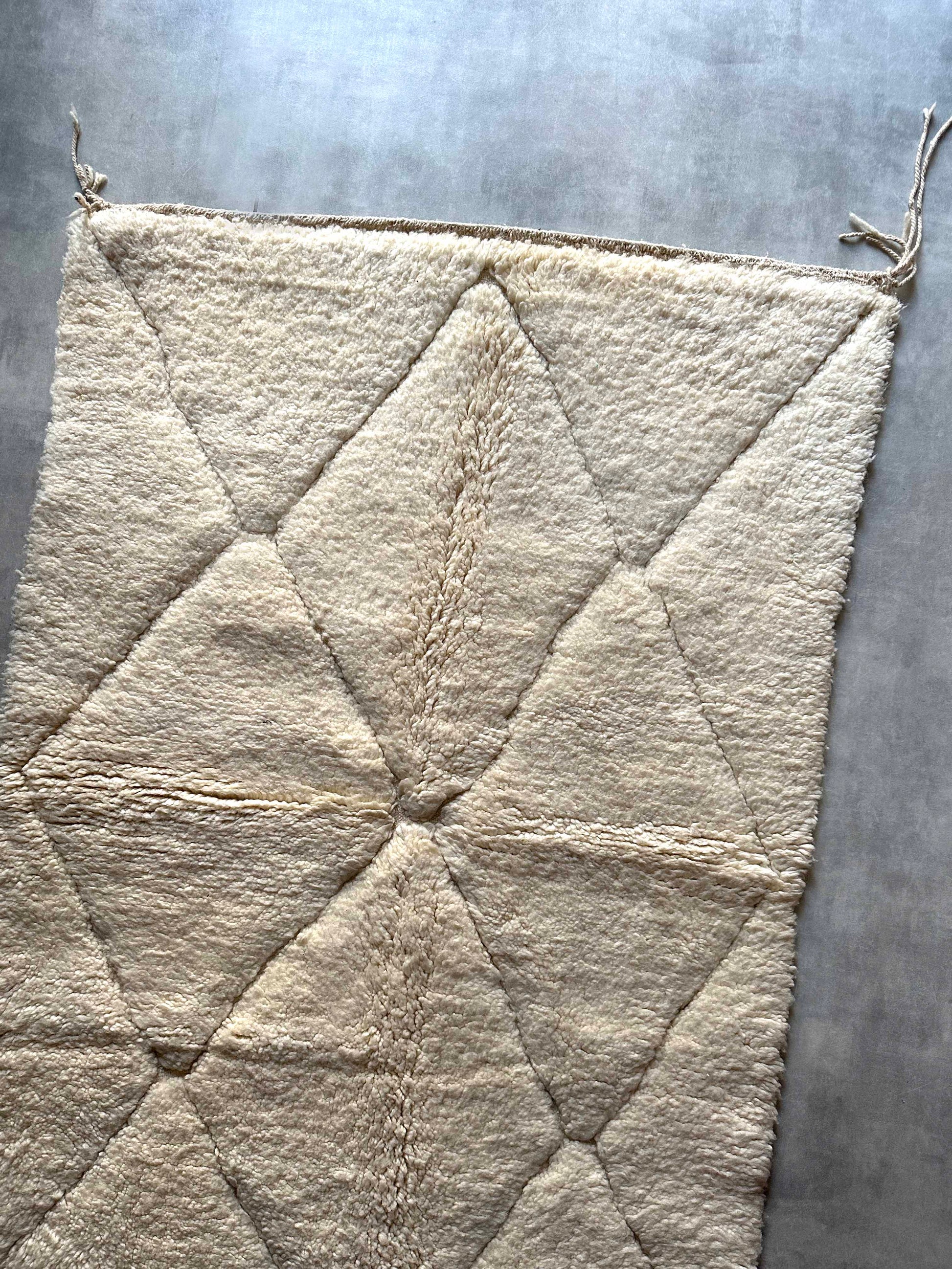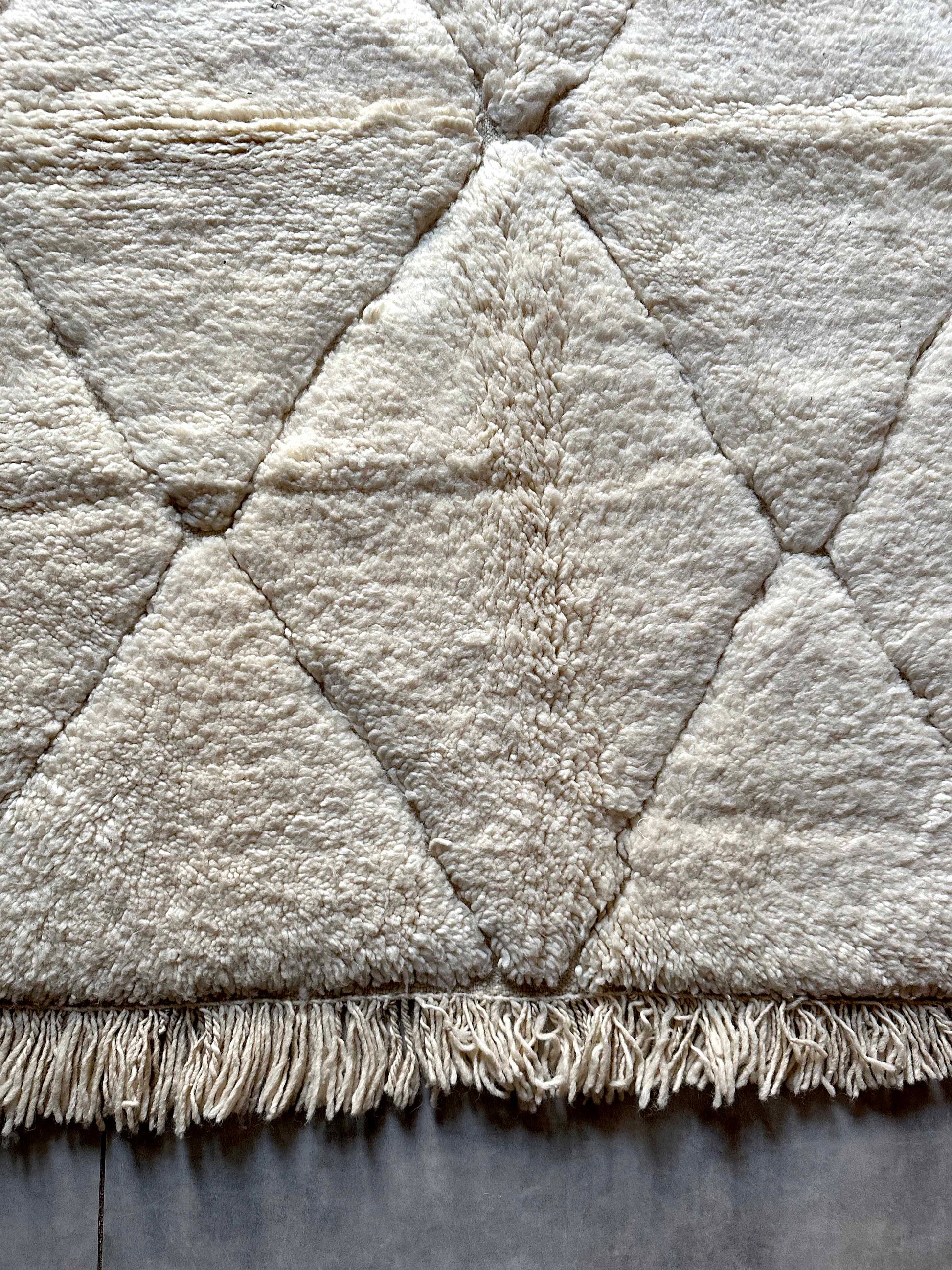 ベニワレンはモロッコのアトラス山脈に住むベルベル人女性によって、一目一目しっかりと結びながら織らているハンドメイドのウールラグです。白を基調とし黒の細いラインで模様が描かれています。触り心地はふわふわと柔らかく長い毛足が特徴です。白を基調としたシンプルなデザインとナチュラルな色合いは、コーディネートの幅も広く他のインテリアとも調和しやすいです。