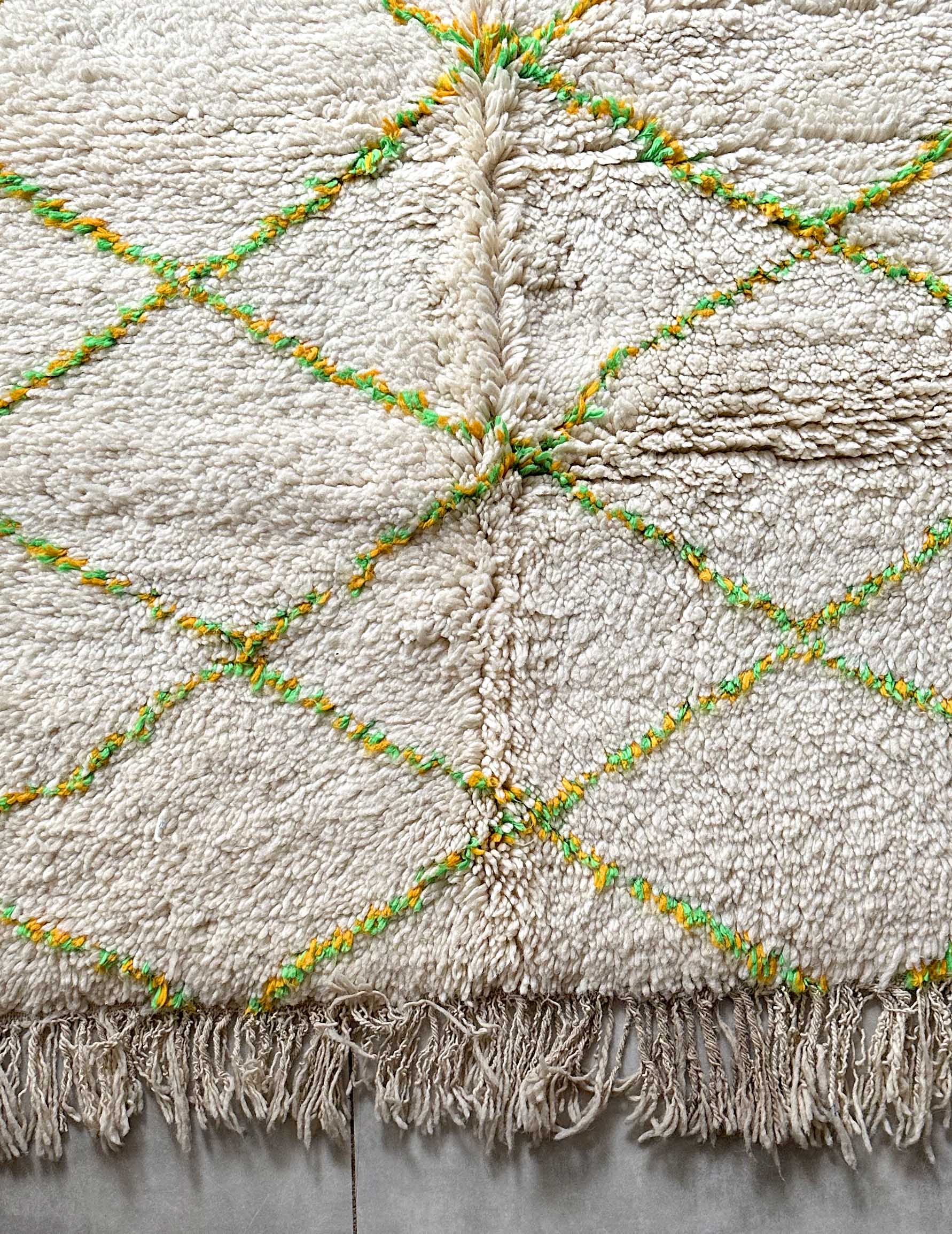 ベニワレンはモロッコのアトラス山脈に住むベルベル人女性によって、一目一目しっかりと結びながら織らているハンドメイドのウールラグです。白を基調とし黒の細いラインで模様が描かれています。触り心地はふわふわと柔らかく長い毛足が特徴です。白を基調としたシンプルなデザインとナチュラルな色合いは、コーディネートの幅も広く他のインテリアとも調和しやすいです。