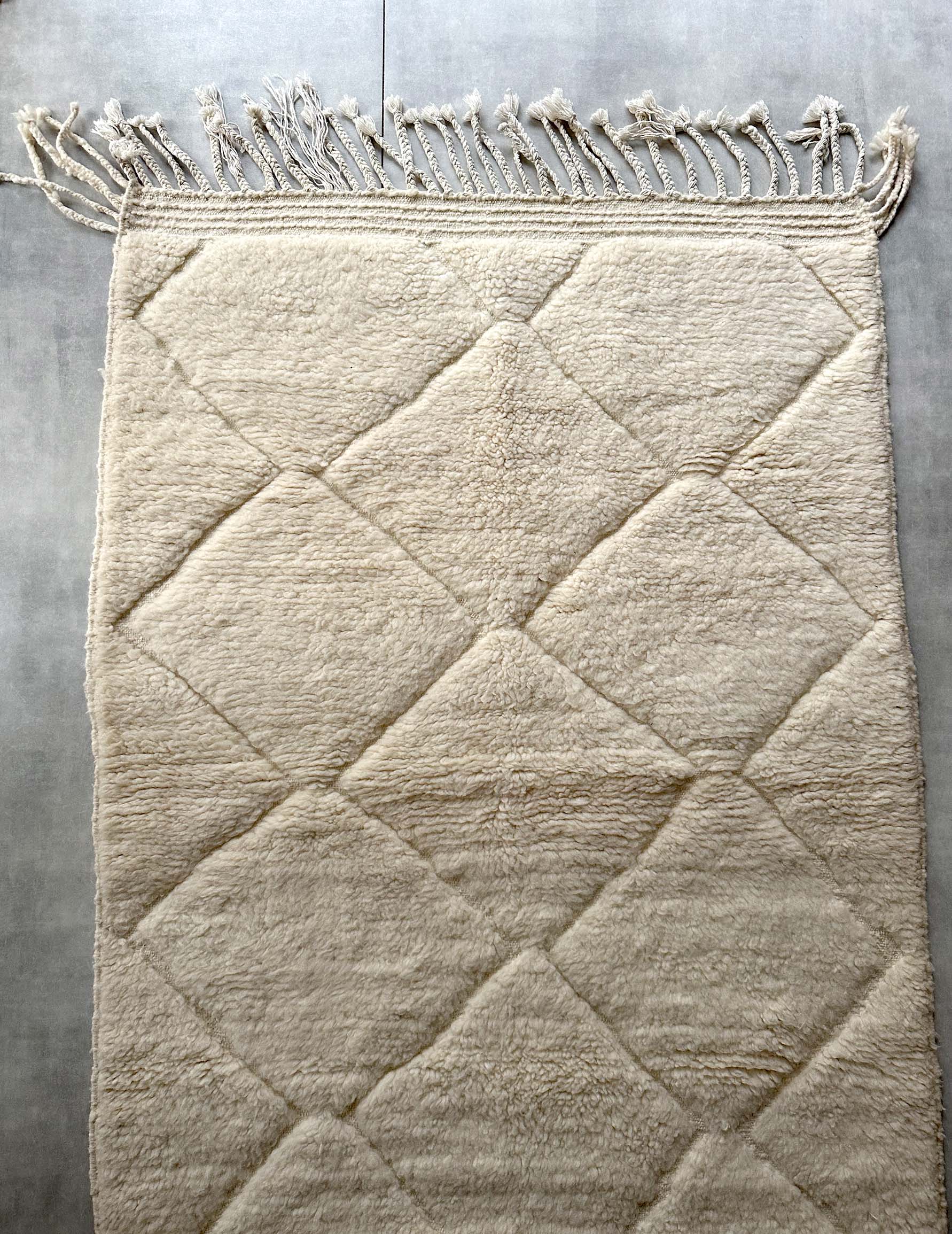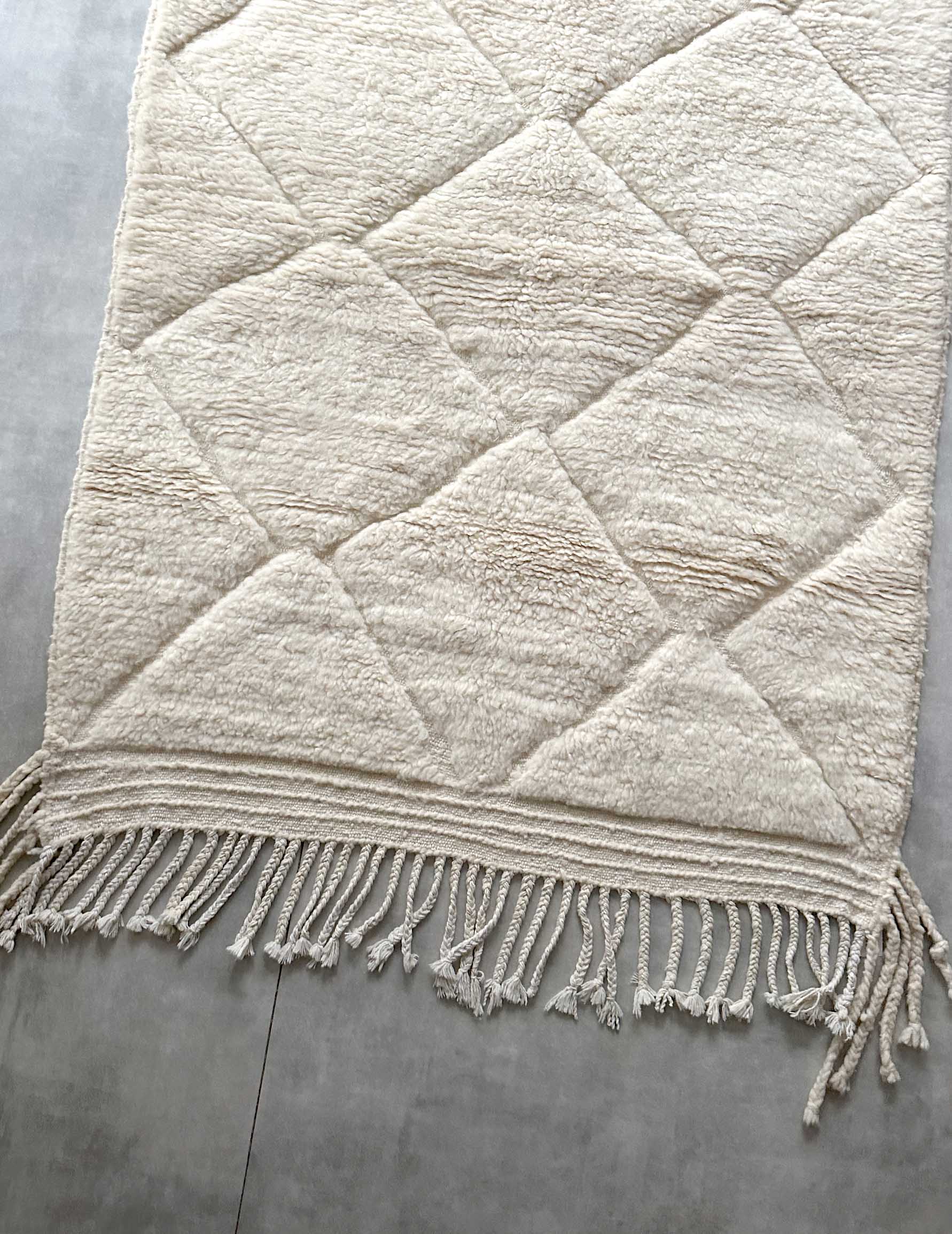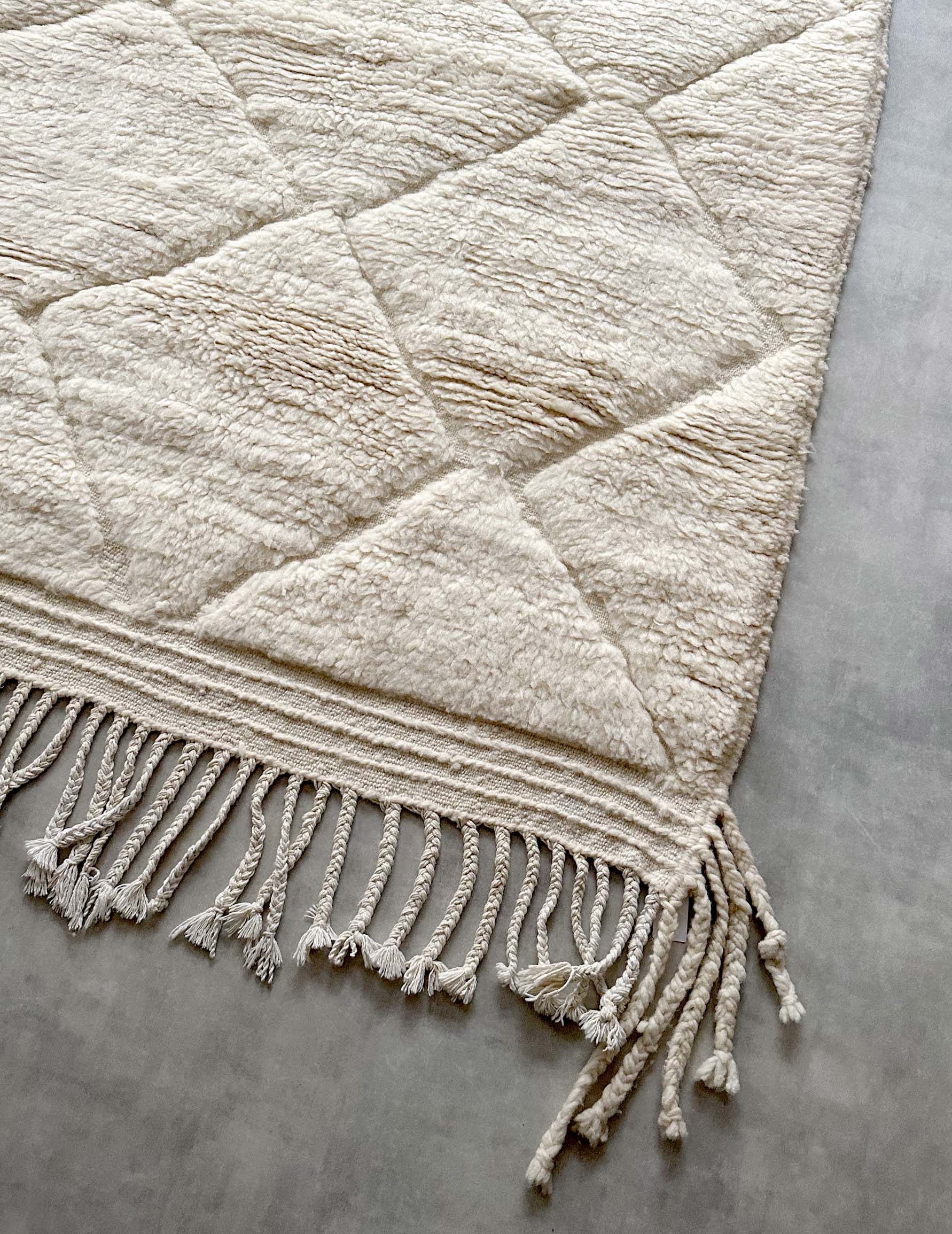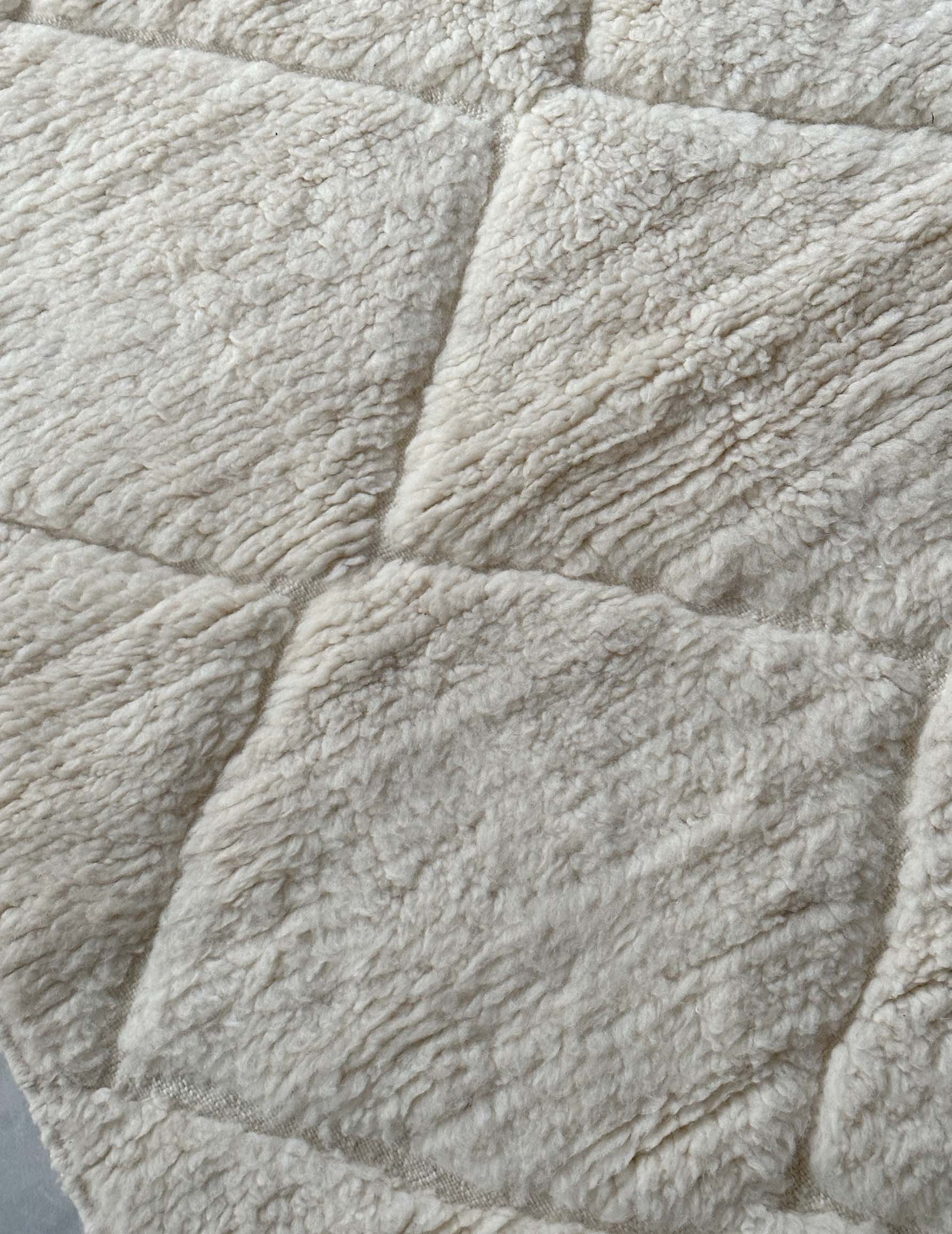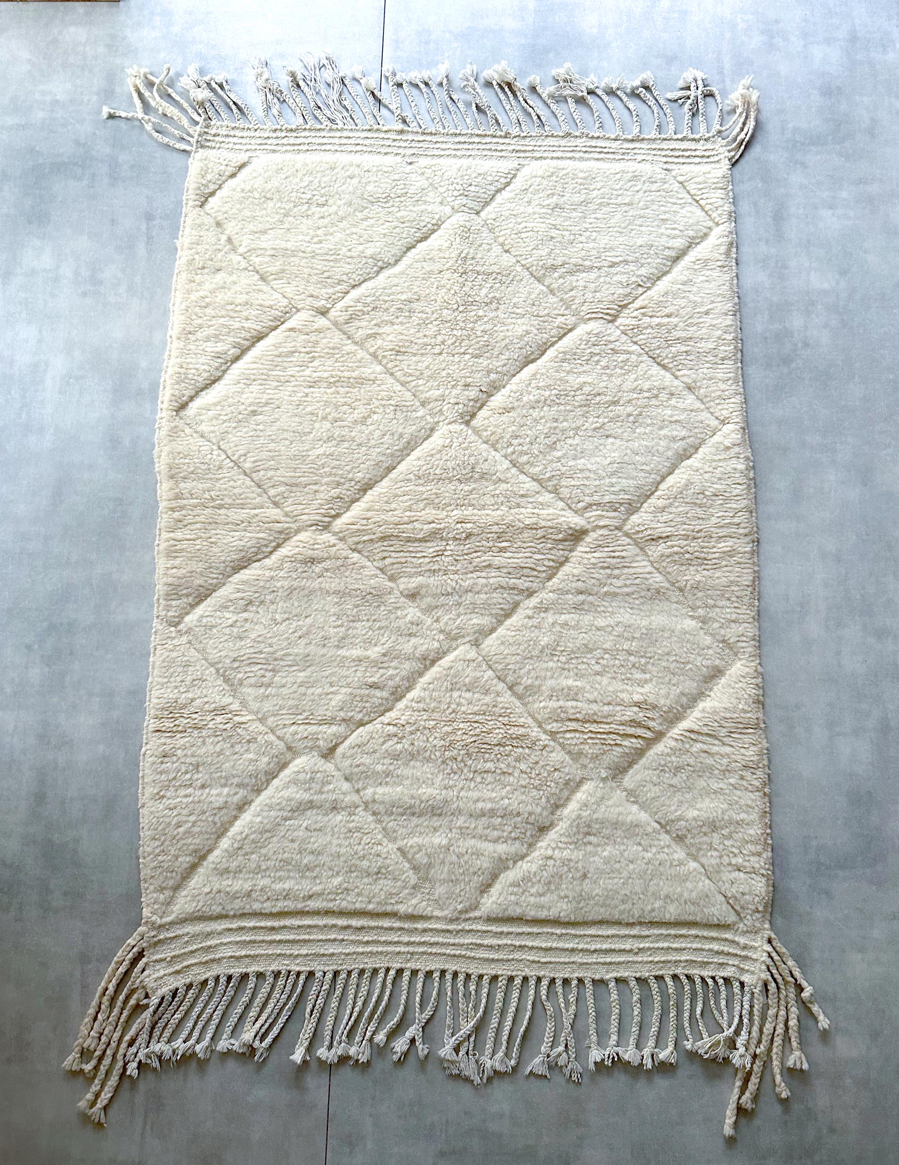 Beni Ourain is a handmade wool rug woven by Berber women living in the Atlas Mountains of Morocco, with each stitch tightly knotted. The lines are woven flat to create a pattern. The rugs are characterized by their soft, fluffy texture and long pile. The simple white-based design and natural colors allow for a wide range of coordination and blend easily with other interiors.