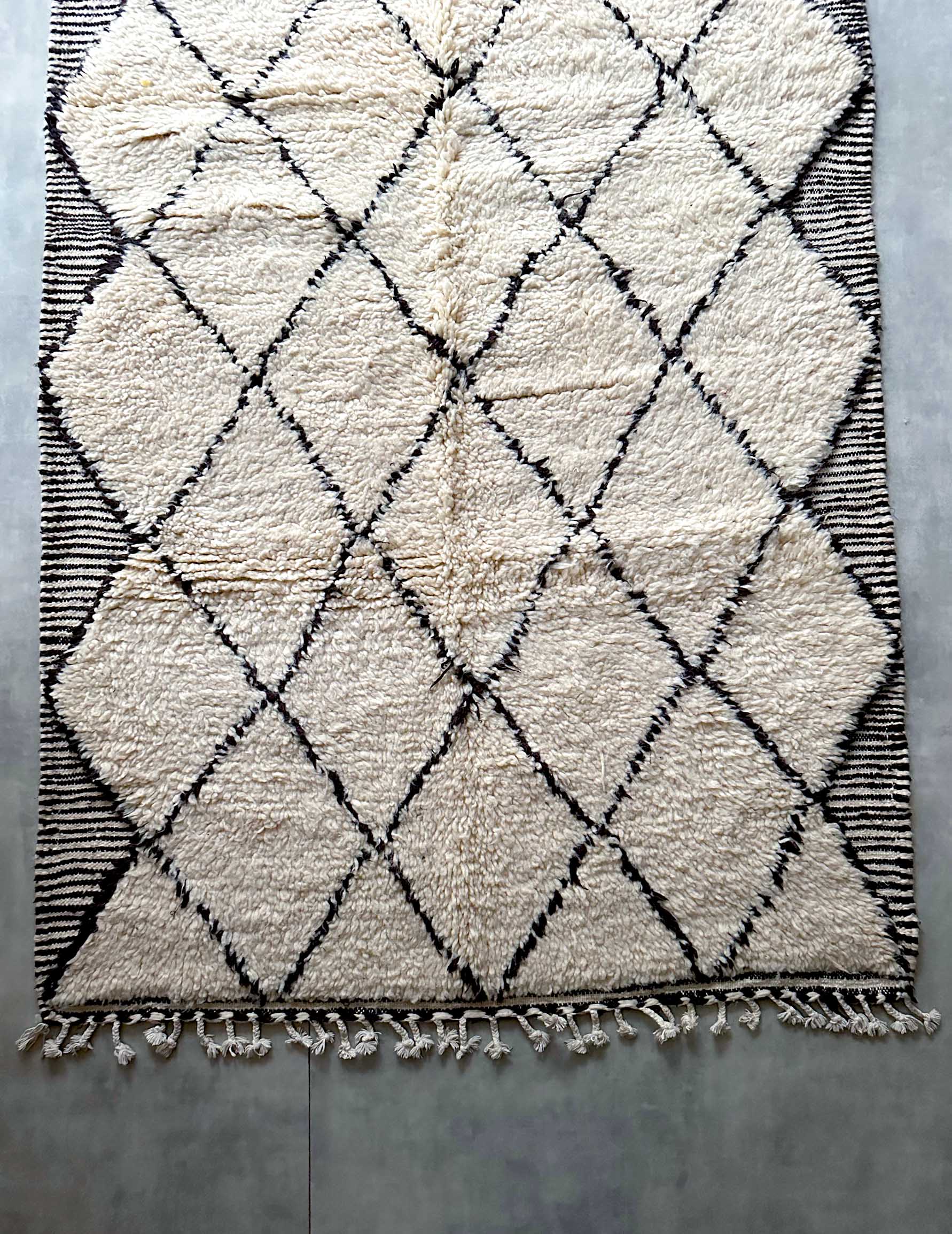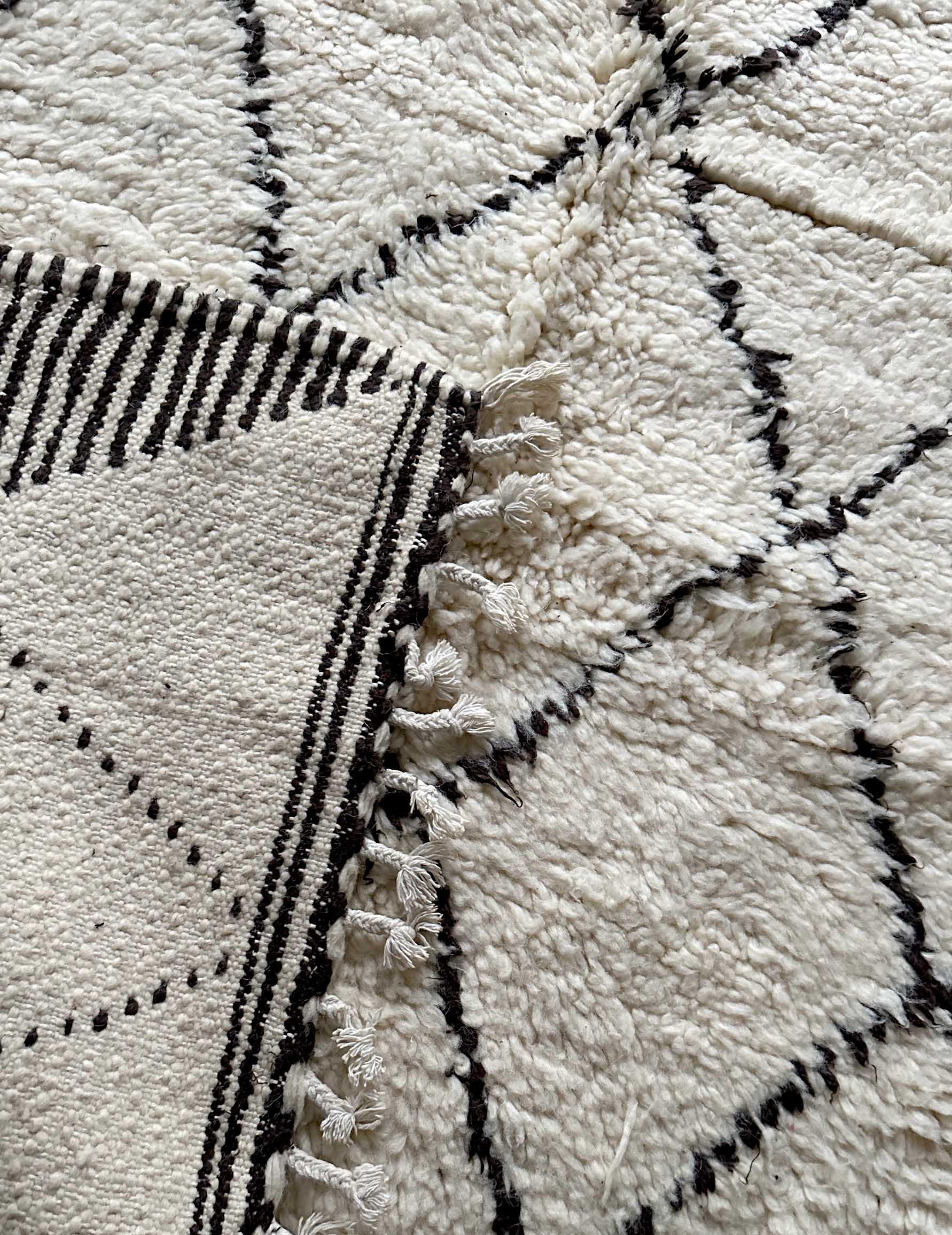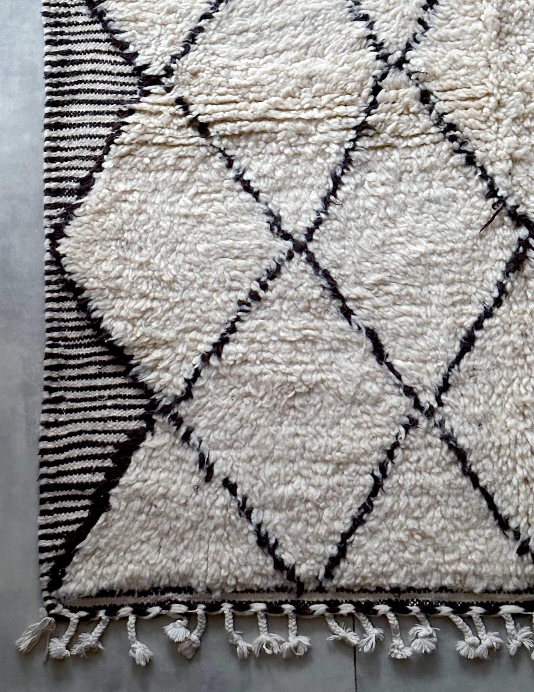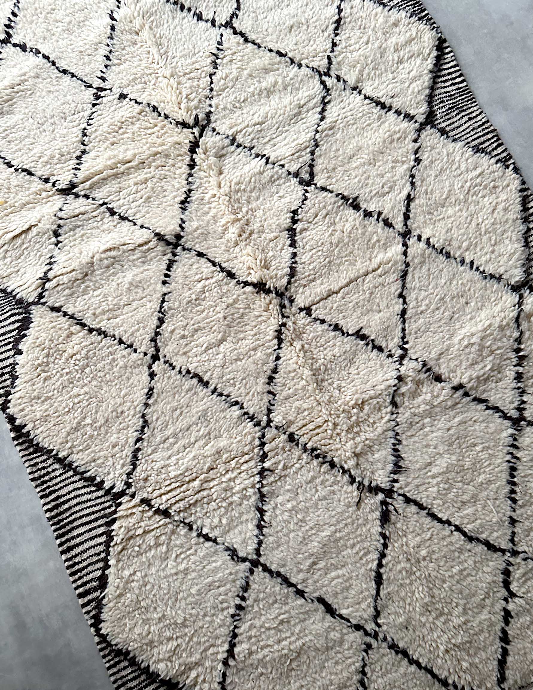 ベニワレンはモロッコのアトラス山脈に住むベルベル人女性によって、一目一目しっかりと結びながら織らているハンドメイドのウールラグです。白を基調とし黒の細いラインで模様が描かれています。触り心地はふわふわと柔らかく長い毛足が特徴です。白を基調としたシンプルなデザインとナチュラルな色合いは、コーディネートの幅も広く他のインテリアとも調和しやすいです。