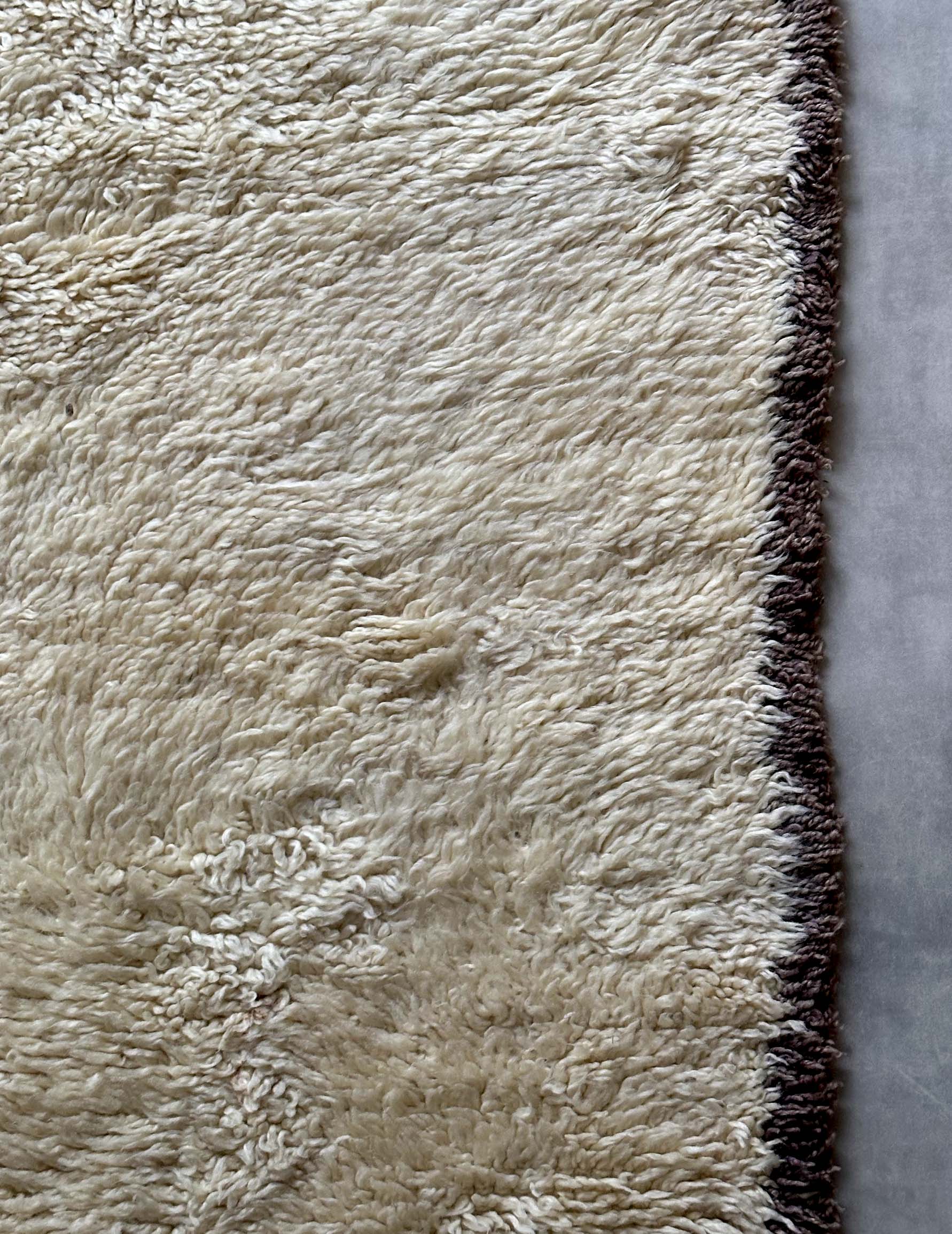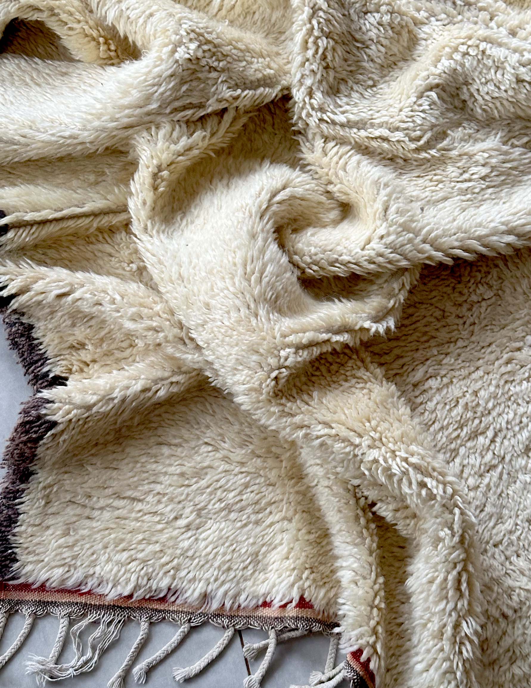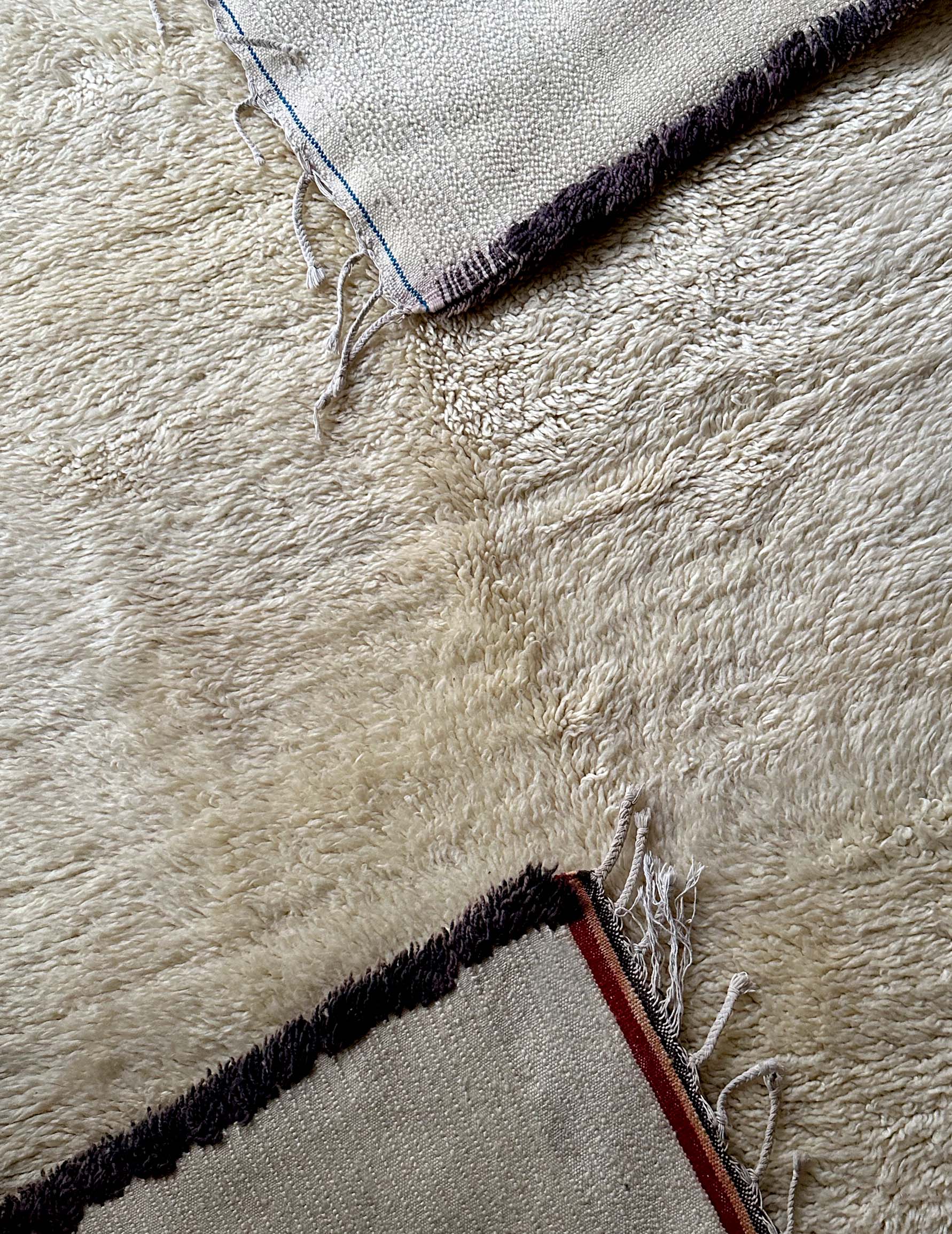 ベニワレンはモロッコのアトラス山脈に住むベルベル人女性によって、一目一目しっかりと結びながら織らているハンドメイドのウールラグです。白を基調とし黒の細いラインで模様が描かれています。触り心地はふわふわと柔らかく長い毛足が特徴です。白を基調としたシンプルなデザインとナチュラルな色合いは、コーディネートの幅も広く他のインテリアとも調和しやすいです。