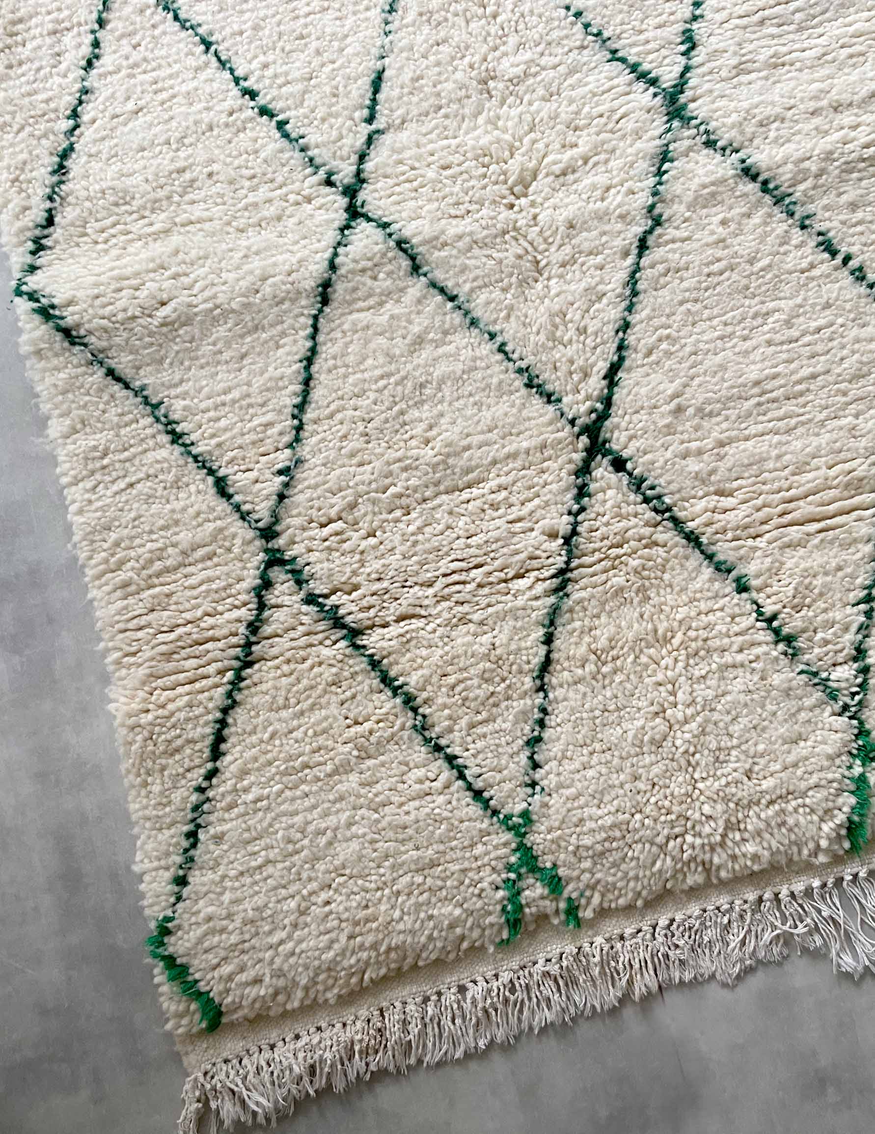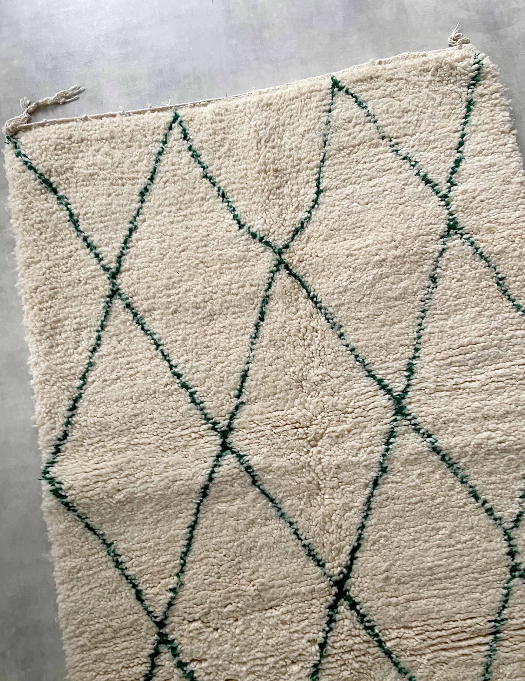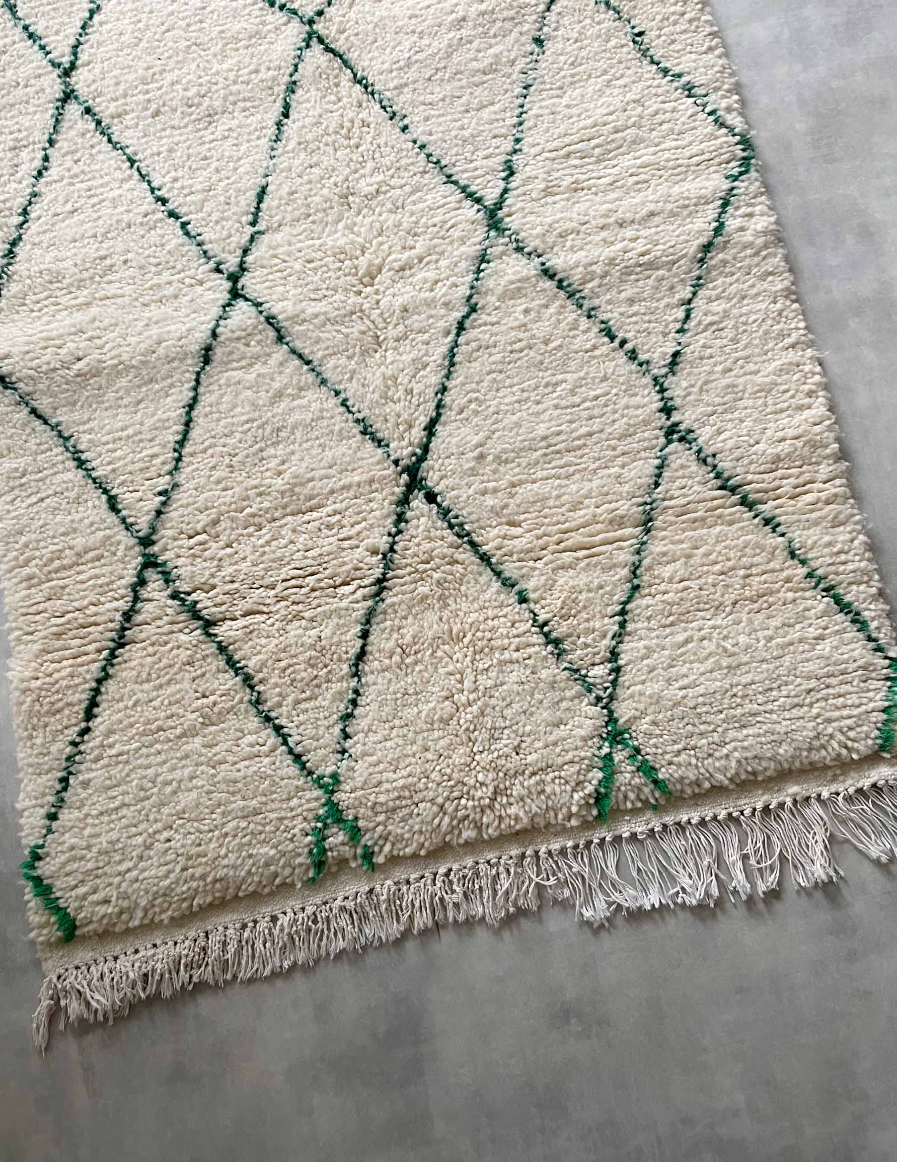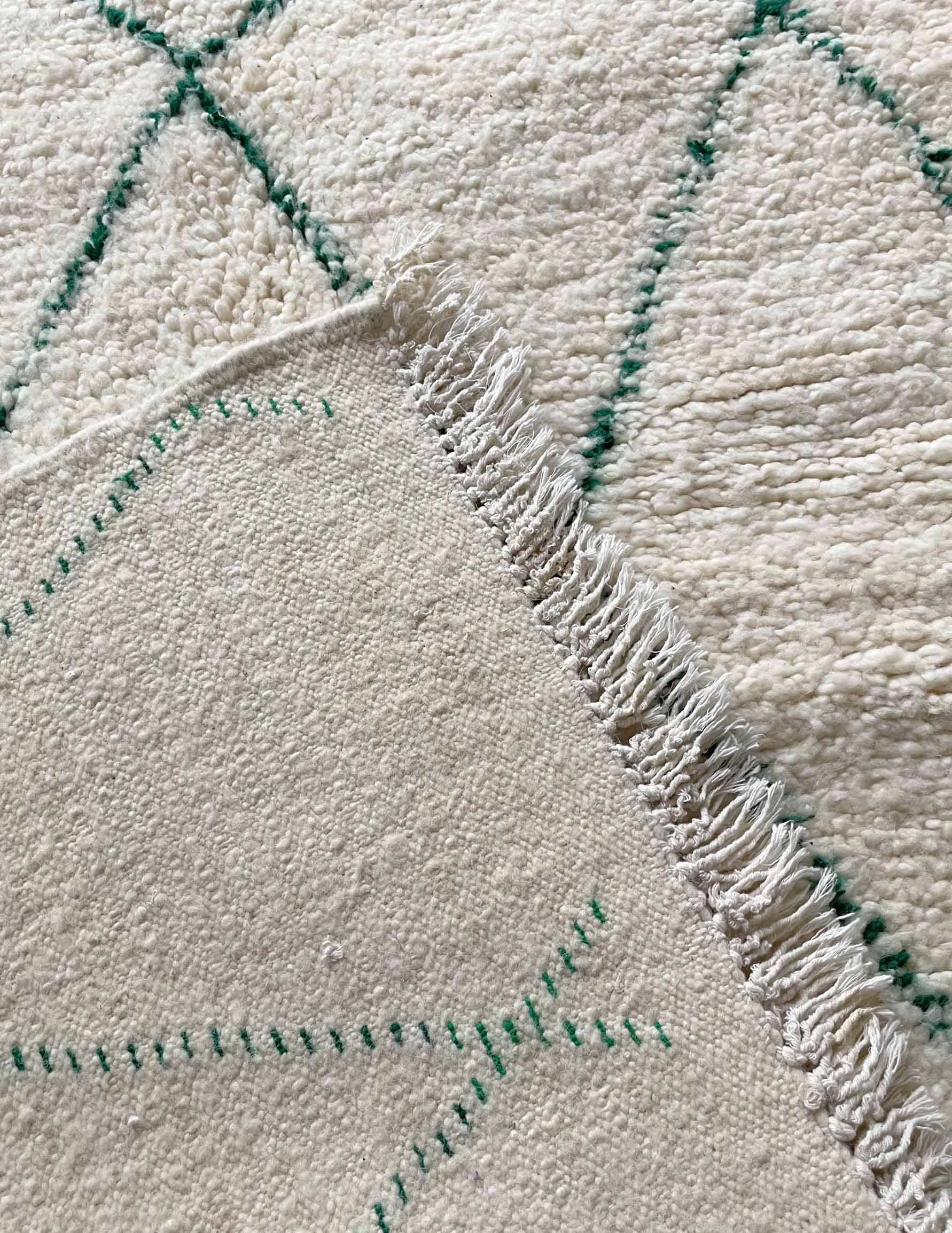 Beniwaren is a handmade wool rug that is woven by Berber women living in the Atlas Mountains of Morocco, with each piece being tightly tied. The pattern is based on white with thin green lines. It is soft to the touch and features long bristles. The simple design based on white and natural colors allows for a wide range of coordination and is easy to harmonize with other interior decorations.