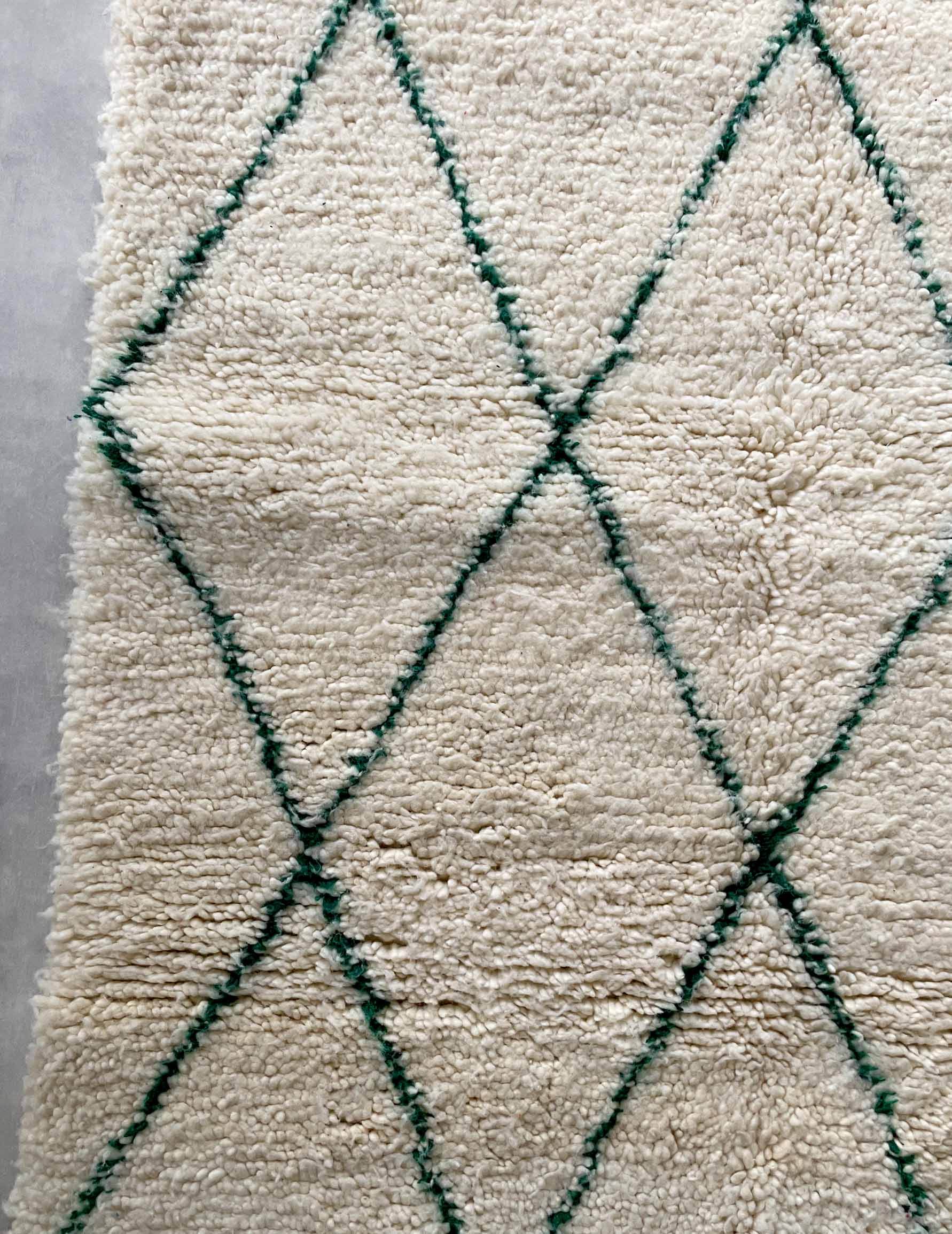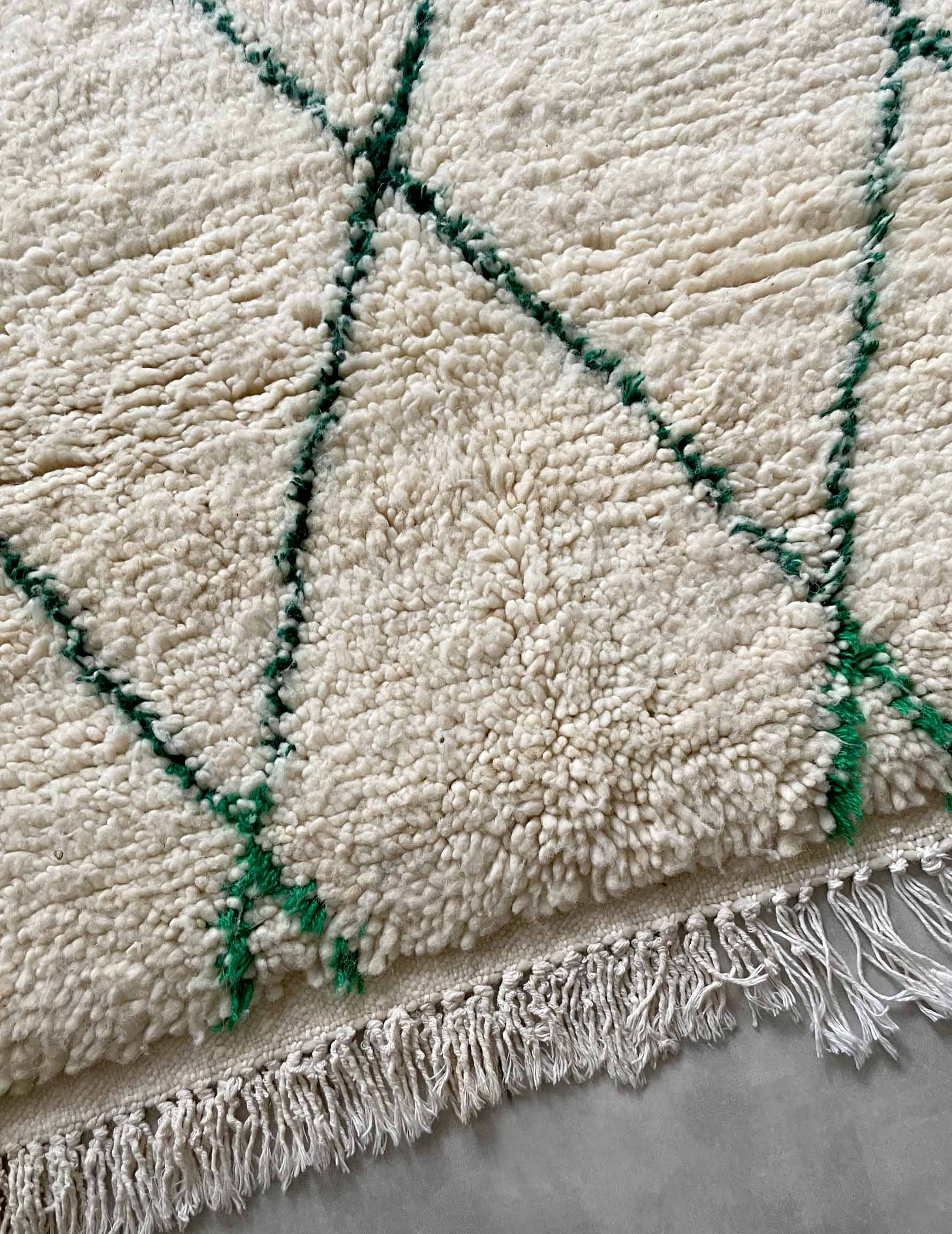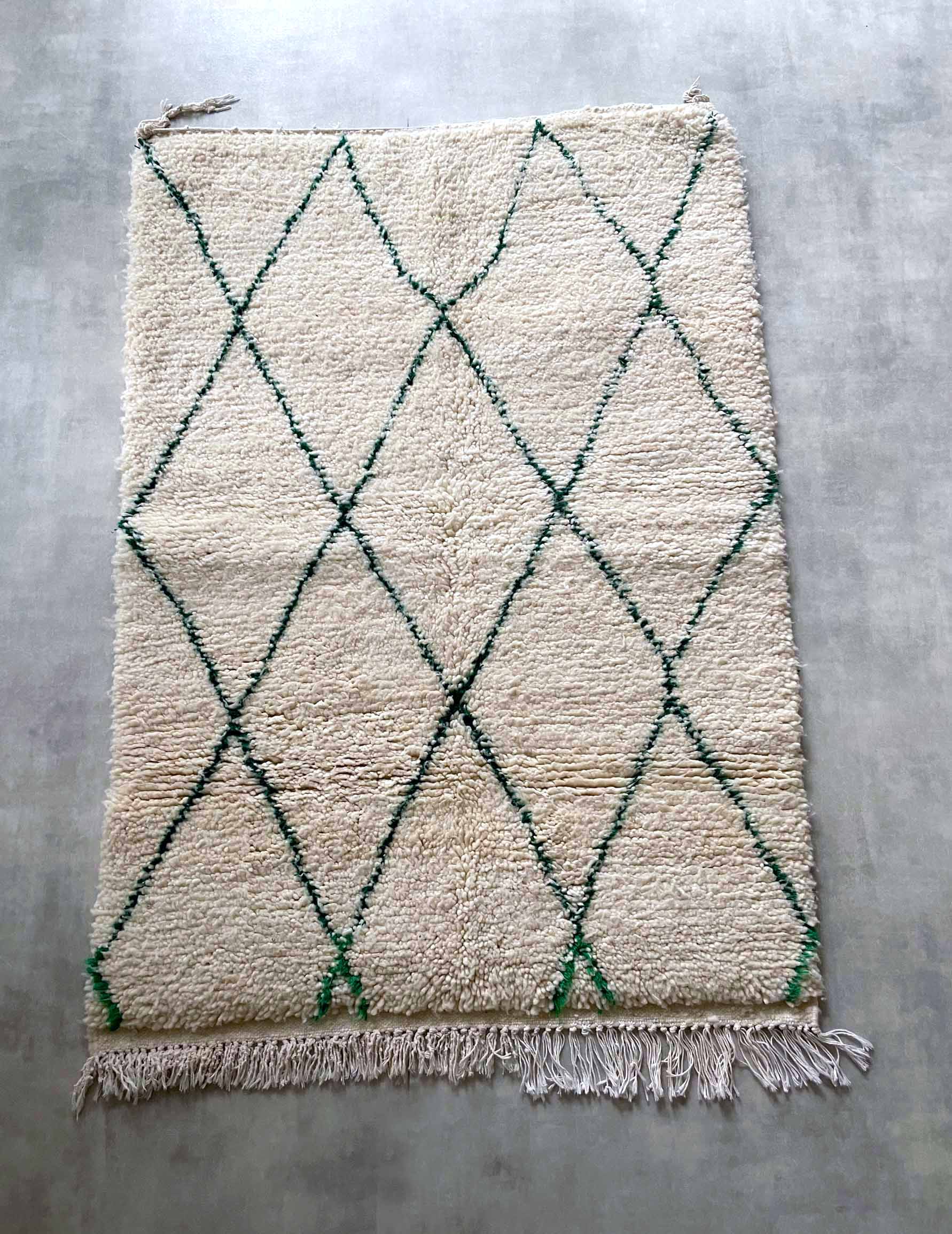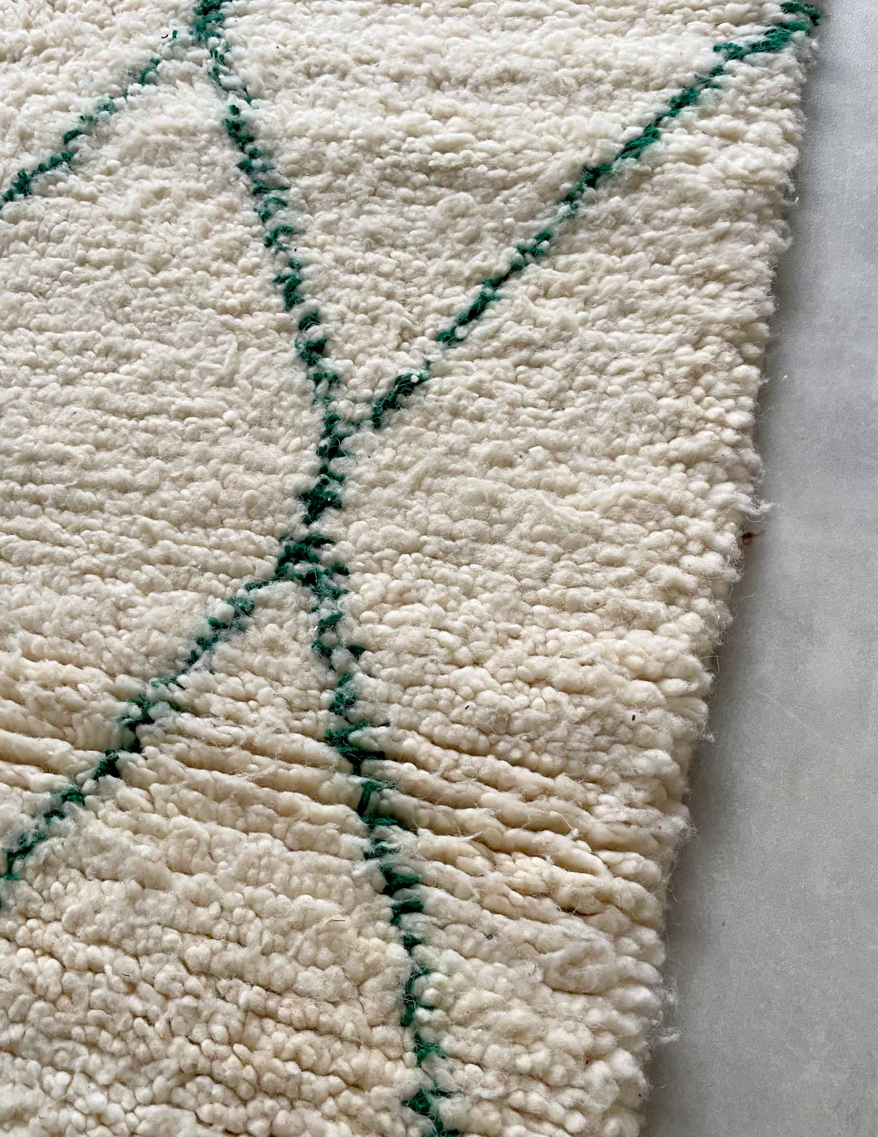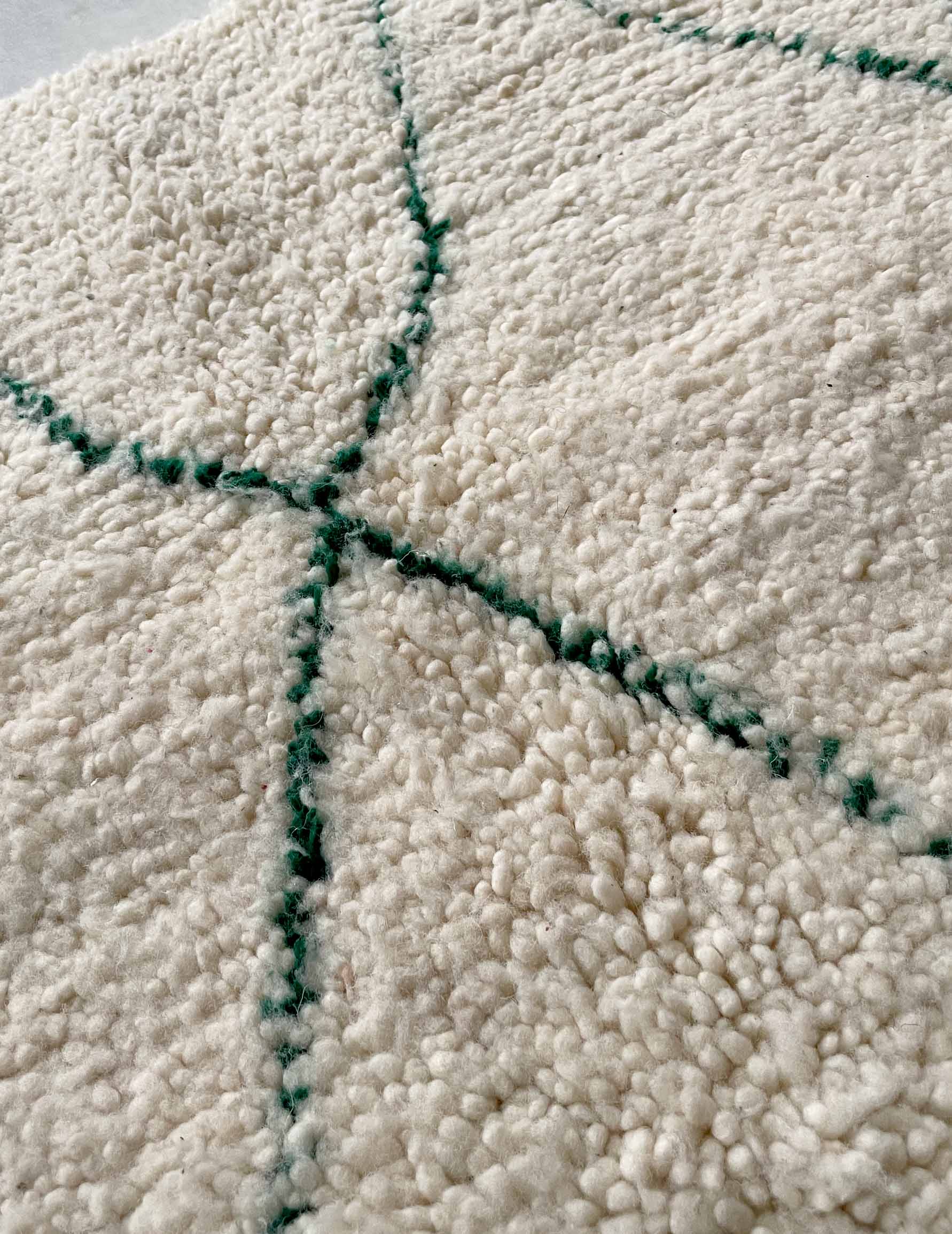 Beniwaren is a handmade wool rug that is woven by Berber women living in the Atlas Mountains of Morocco, with each piece being tightly tied. The pattern is based on white with thin green lines. It is soft to the touch and features long bristles. The simple design based on white and natural colors allows for a wide range of coordination and is easy to harmonize with other interior decorations.