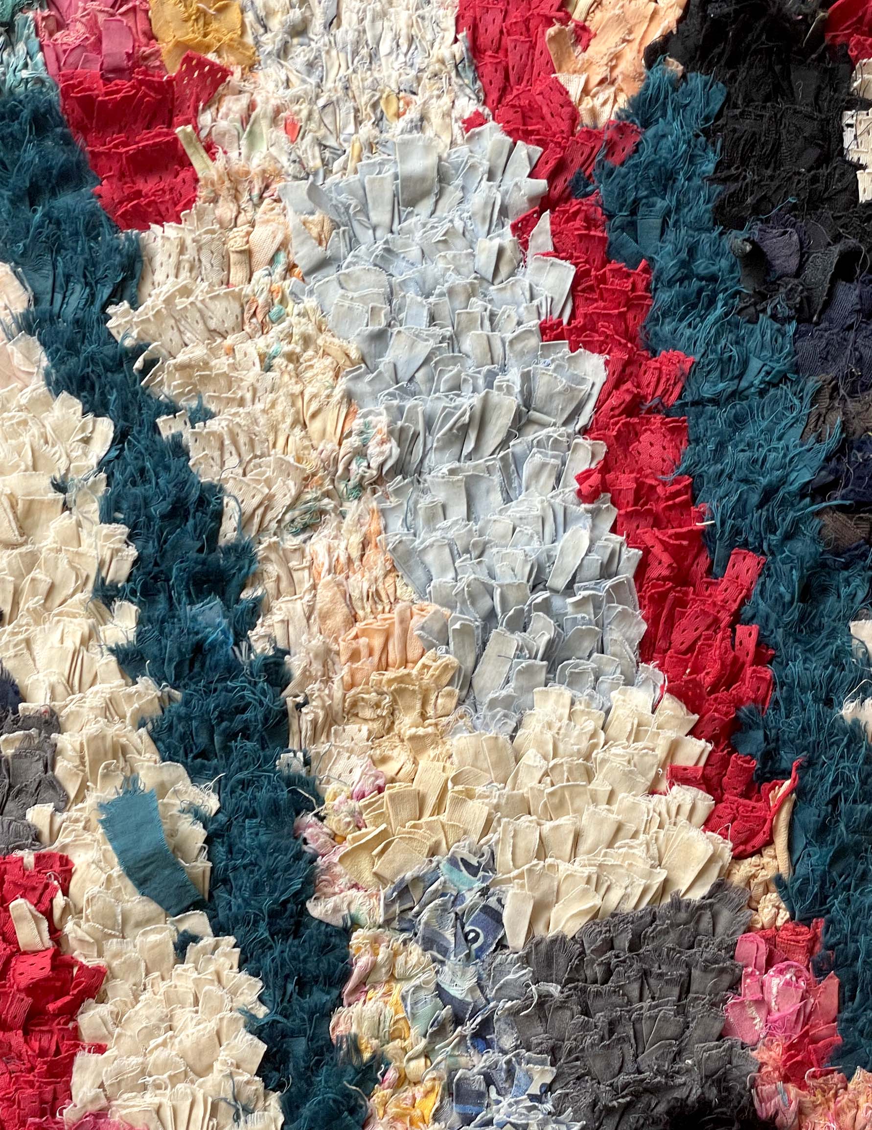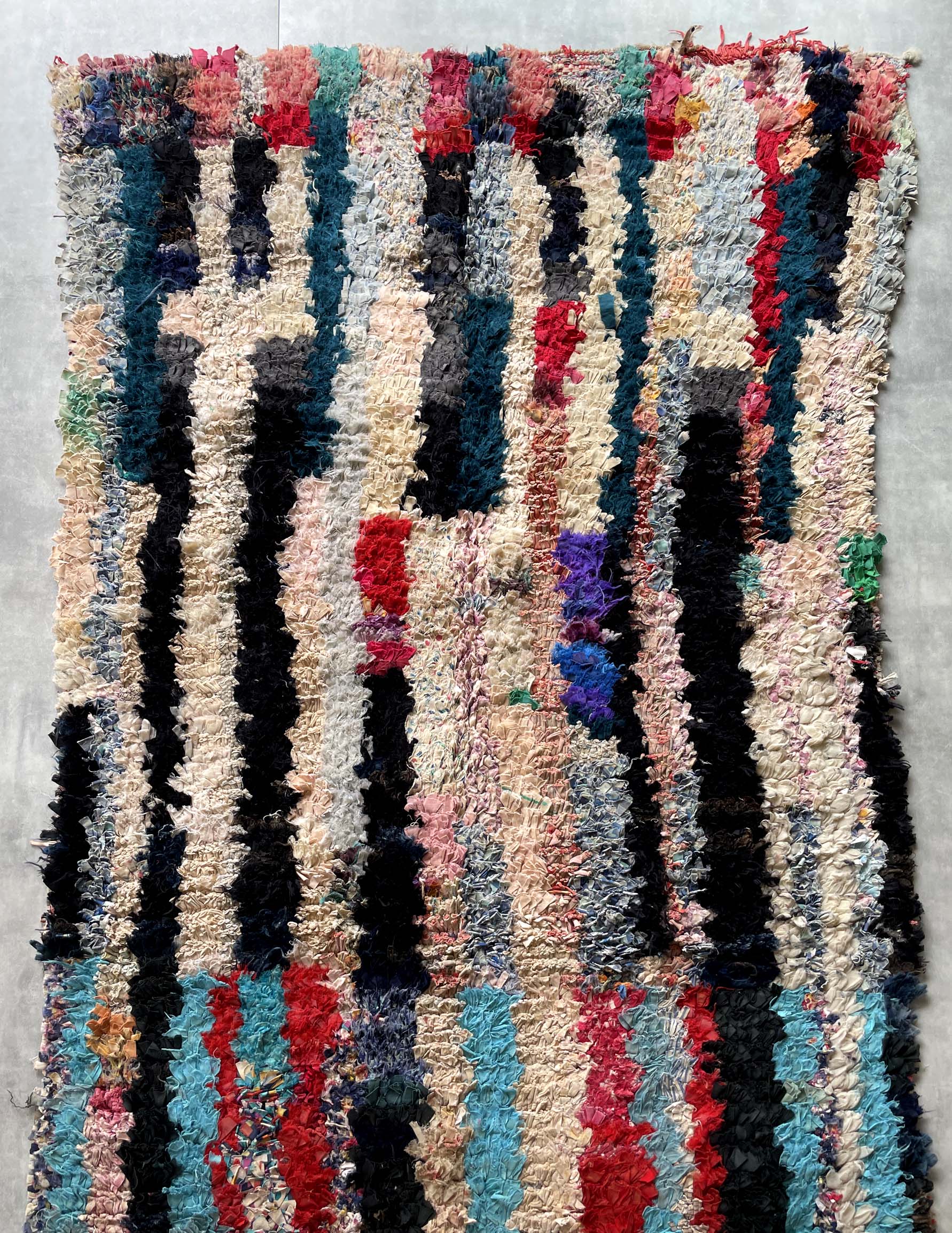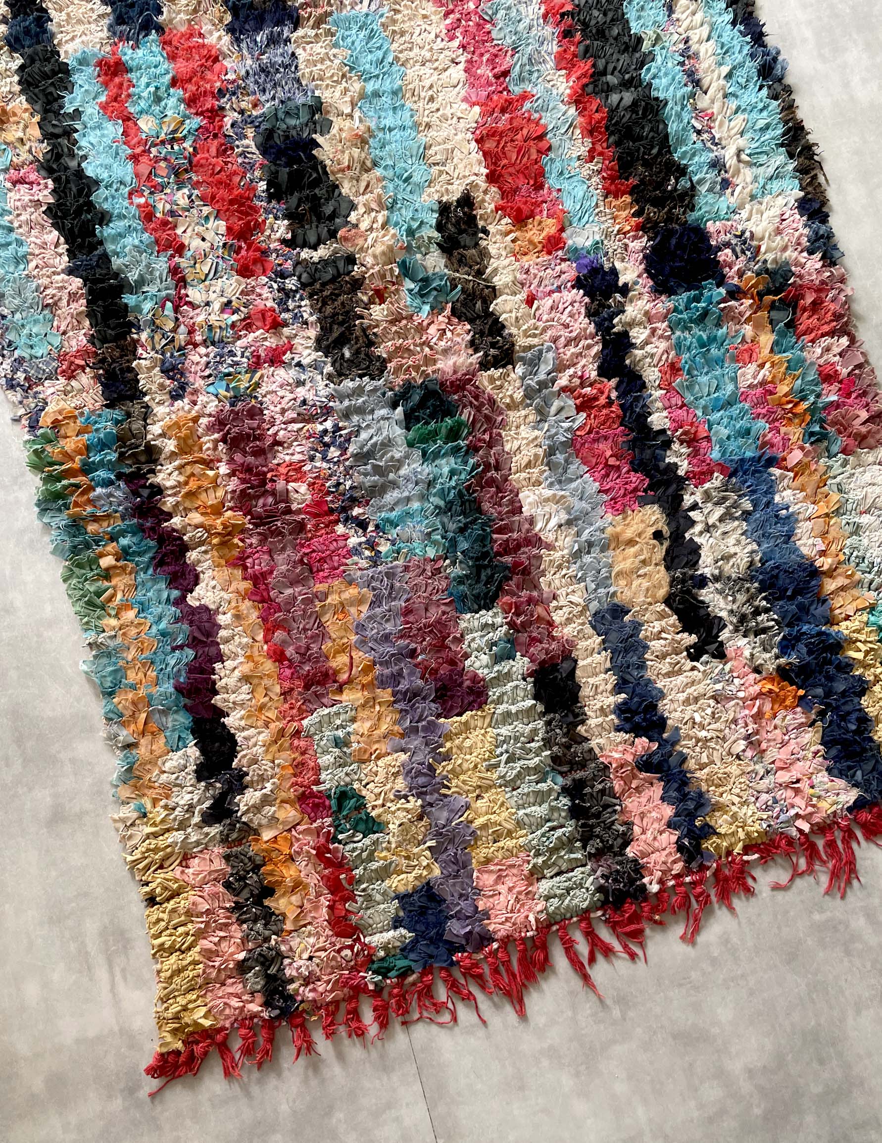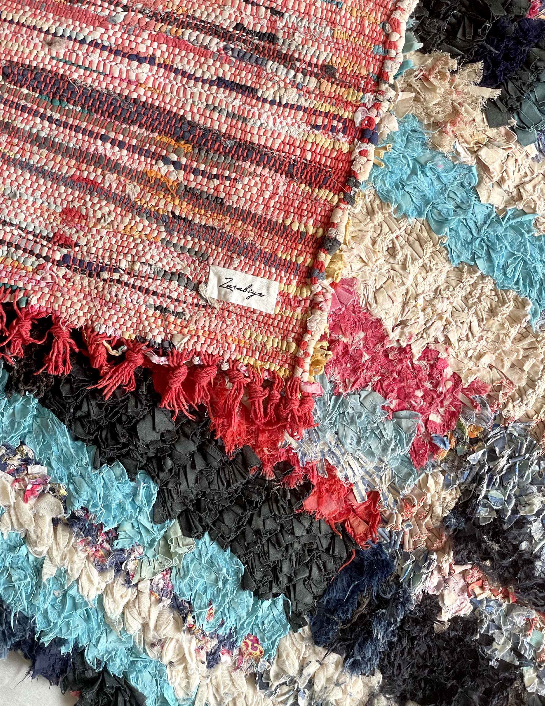 Bossharwit is a recycled Moroccan rug made by Berber women living in the Atlas Mountains, who weave recycled fabrics such as clothing. Because each rug is made from a different fabric, the color scheme and length vary, making each one unique. In Morocco, they are not only used as rugs, but also as wall art.