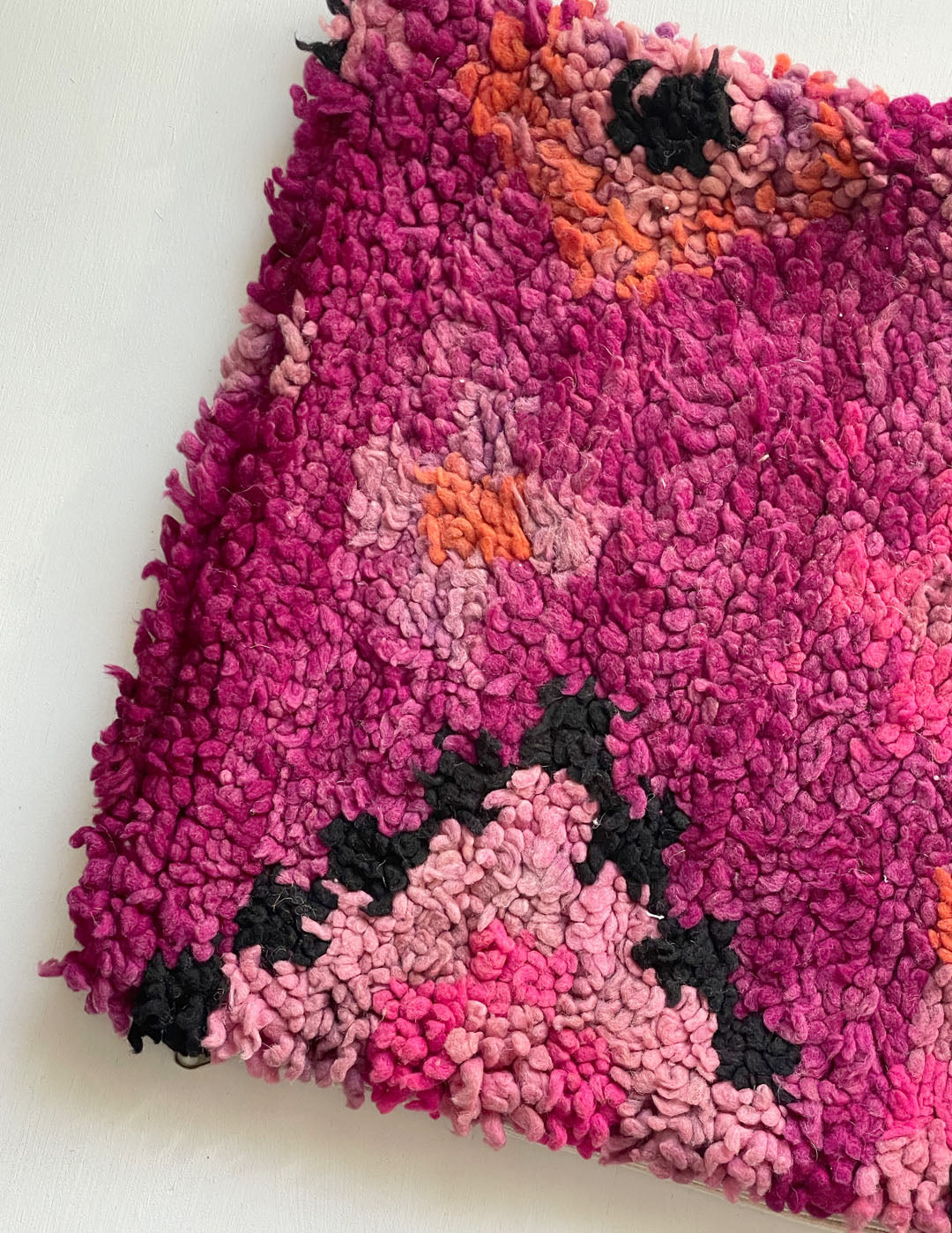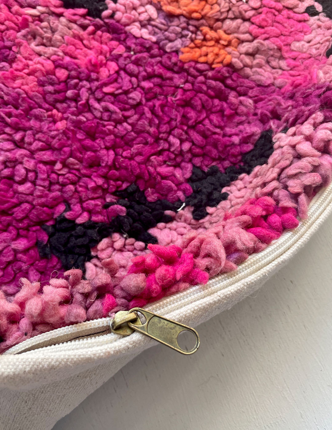 A wool cushion cover made from a handmade rug woven by Berber women.
