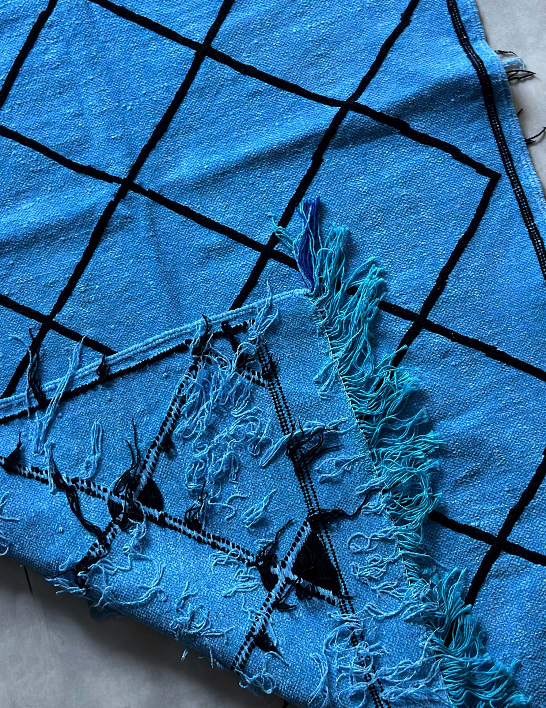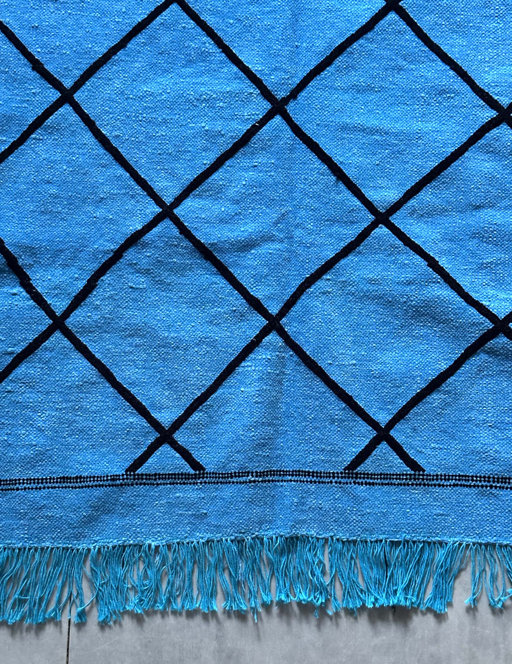 This plain-weave rug is carefully woven from wool by Berber women in the Sahara, located in the south of Morocco.