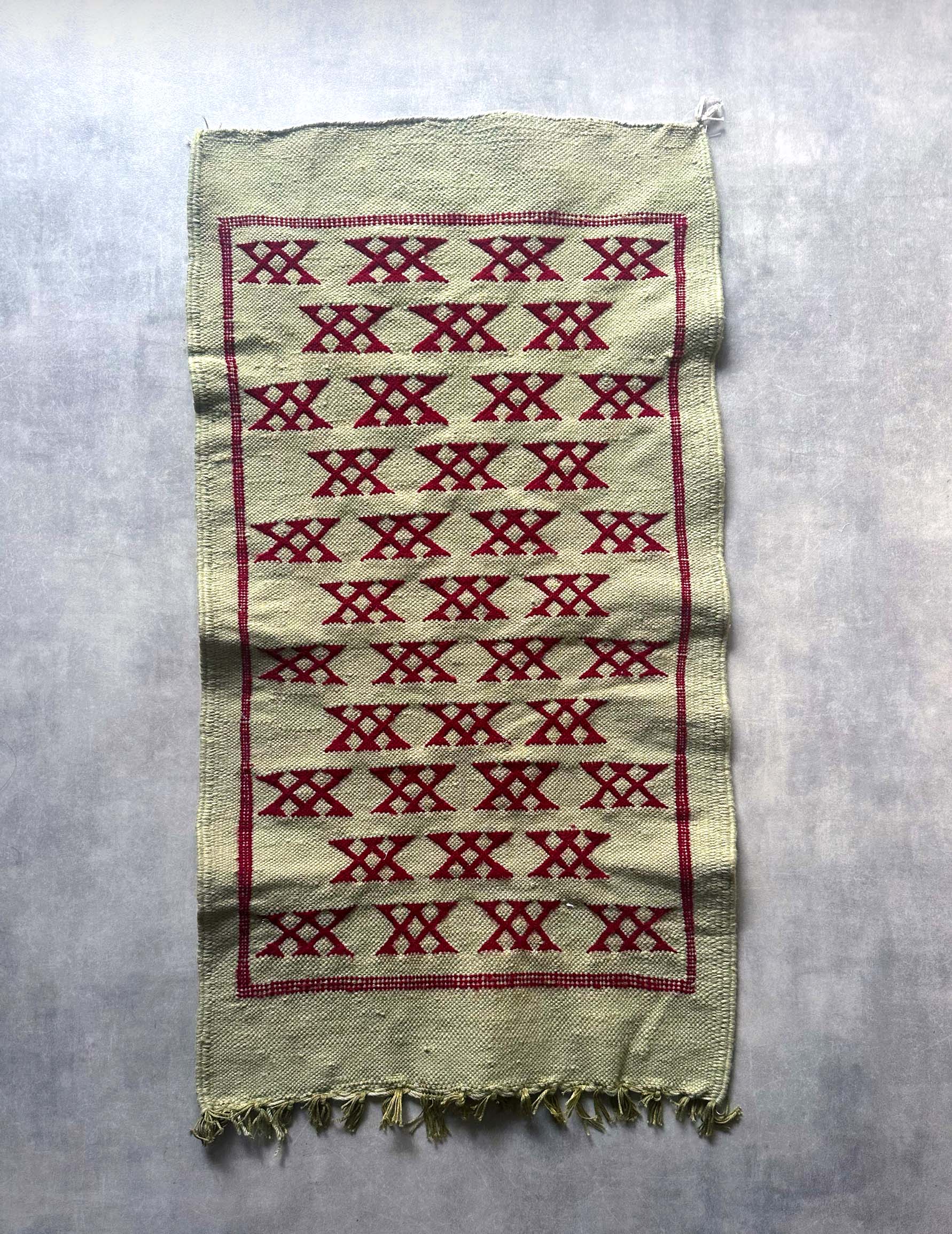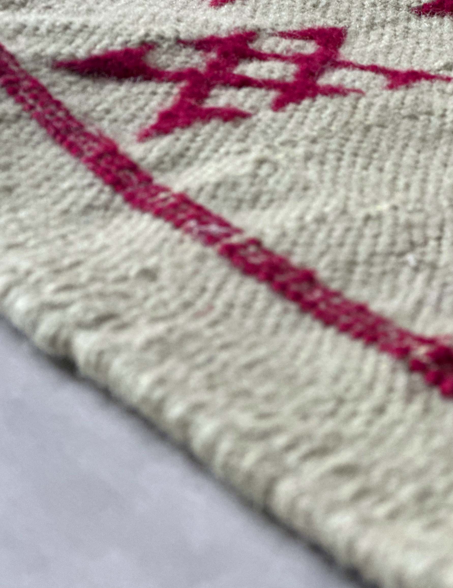 This plain-weave rug is carefully woven from wool by Berber women in the Sahara, located in the south of Morocco.