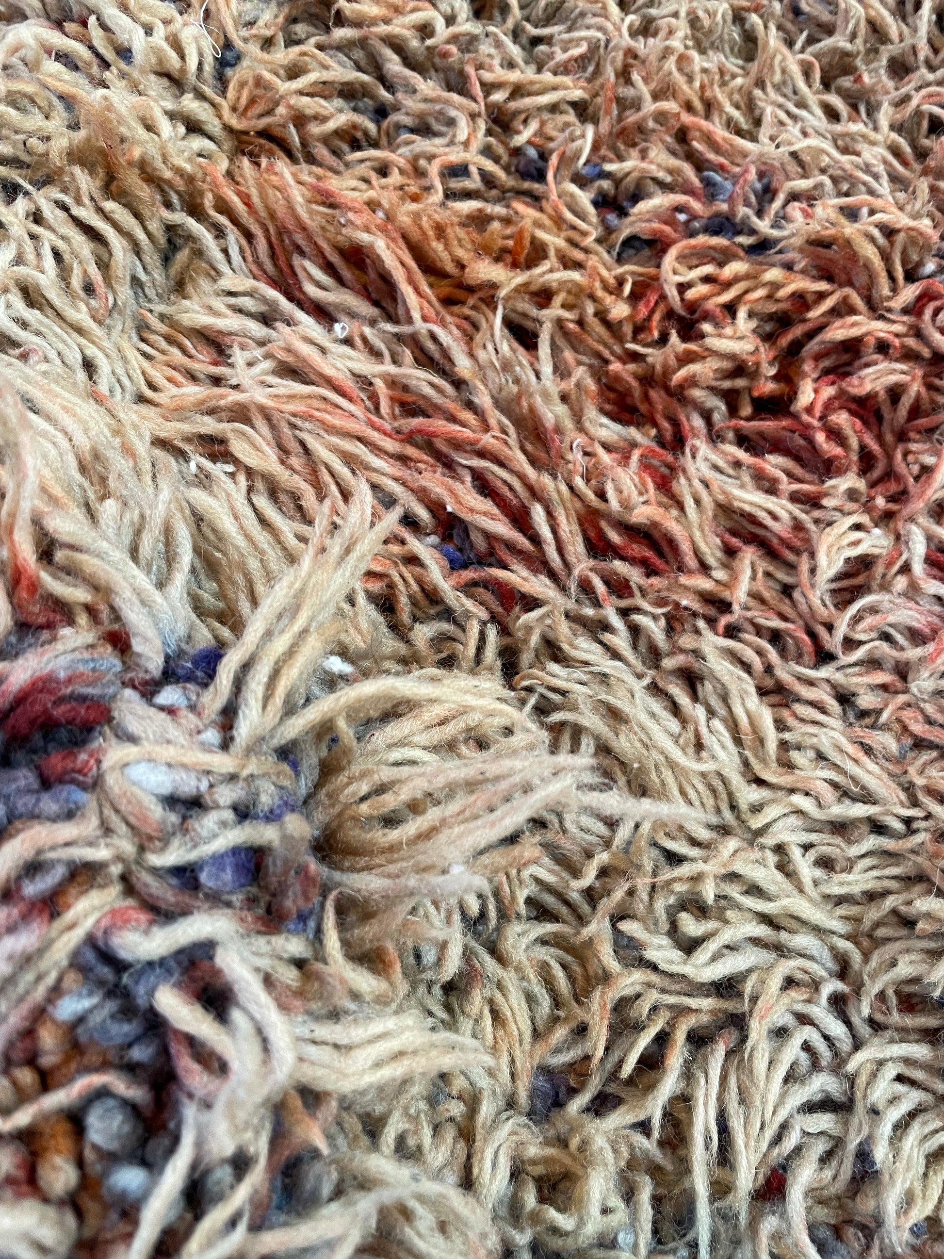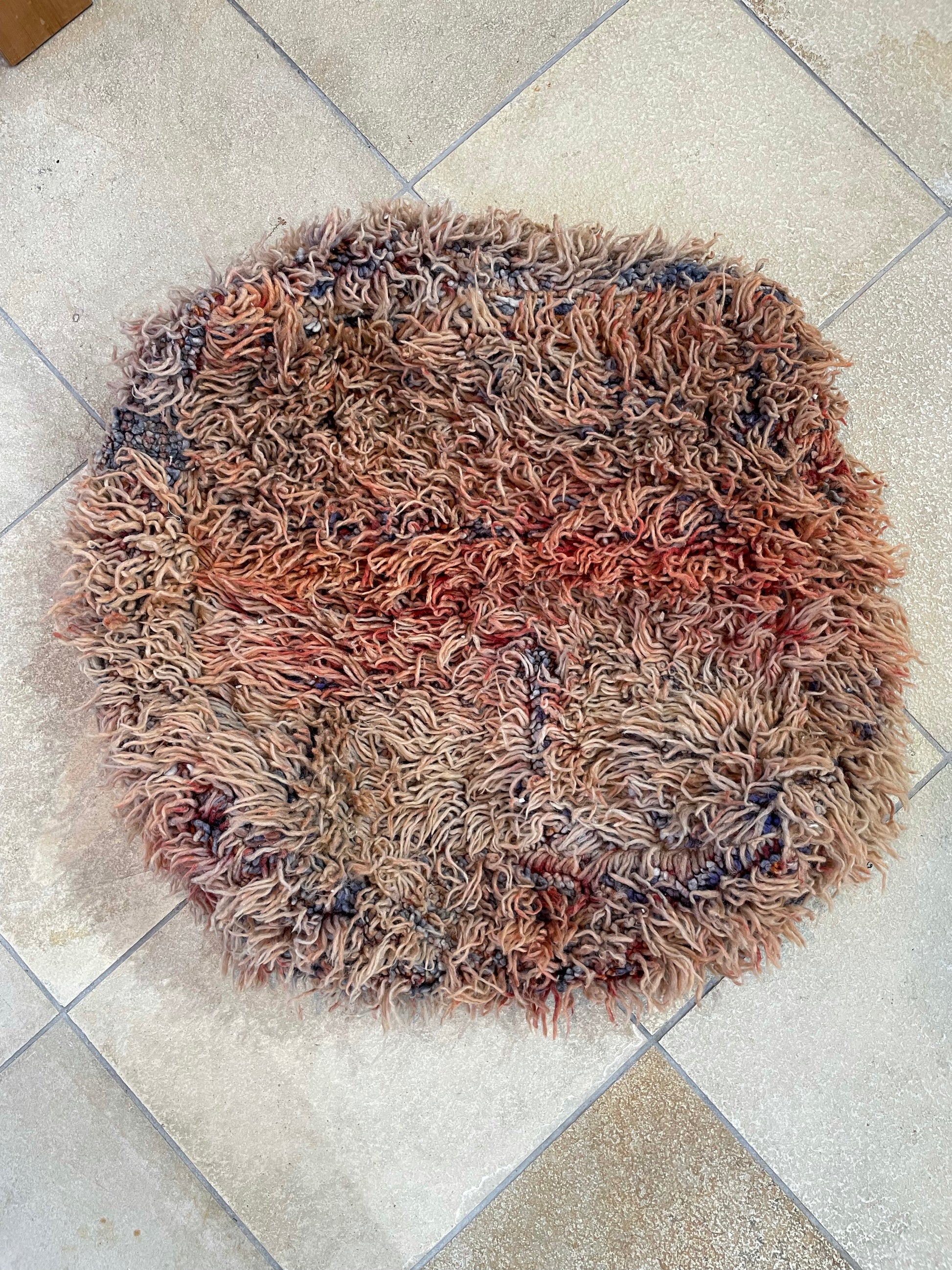 Boujad pouf is a pouffe made using short wool rugs woven by Berber women living in the Atlas Mountains of Morocco.