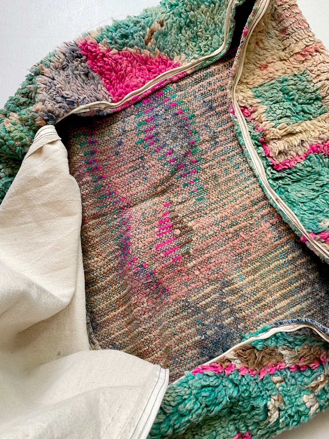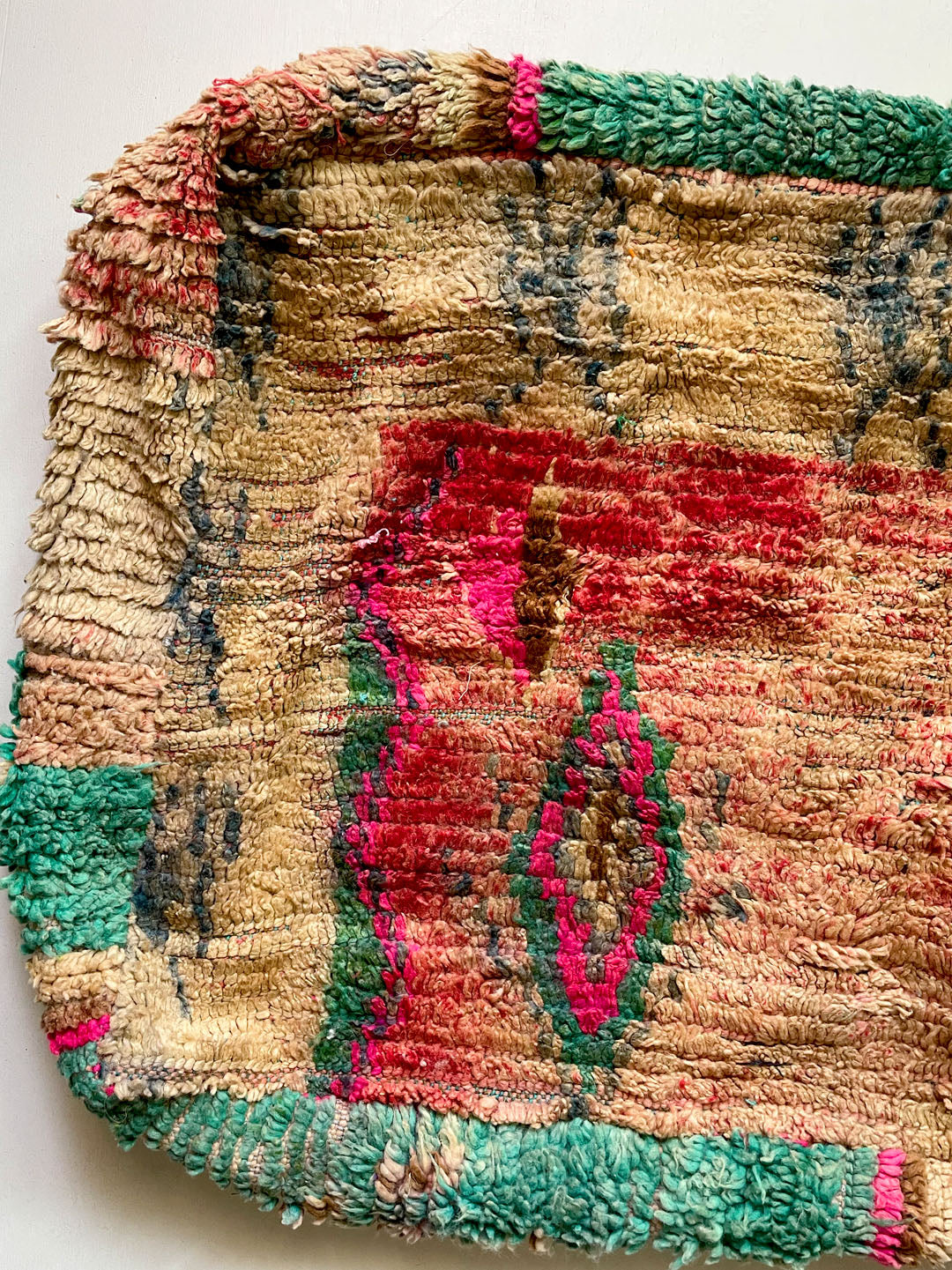 ブジャドプフはモロッコのアトラス山脈に住む、ベルベル人女性によって編まれた毛の短いウールラグを使用し作られたプフとなります。