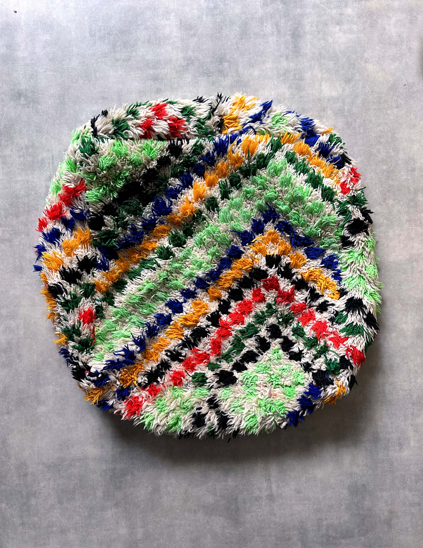 The Boujad Pouf is a pouf made from a short-pile wool rug woven by Berber women living in the Atlas Mountains of Morocco.