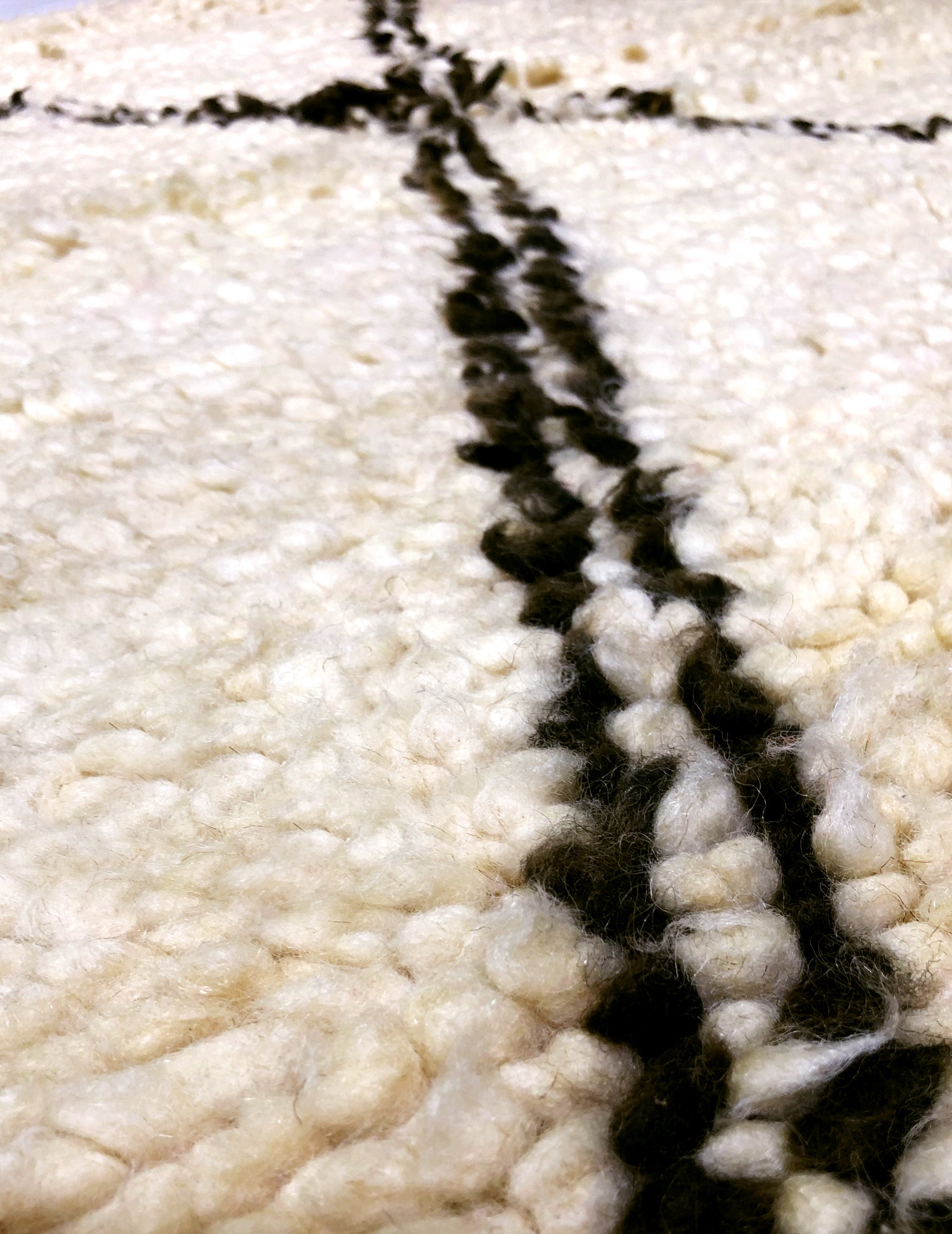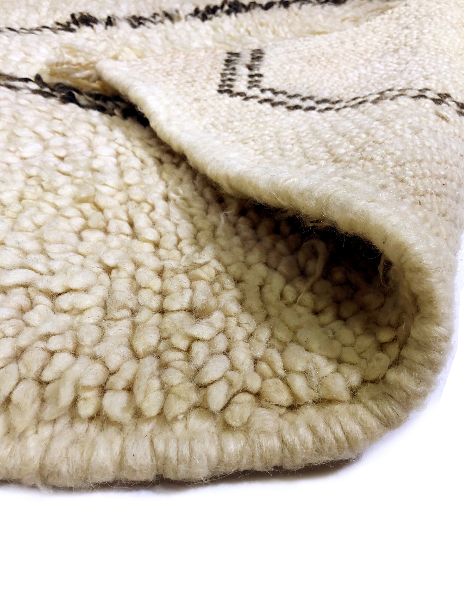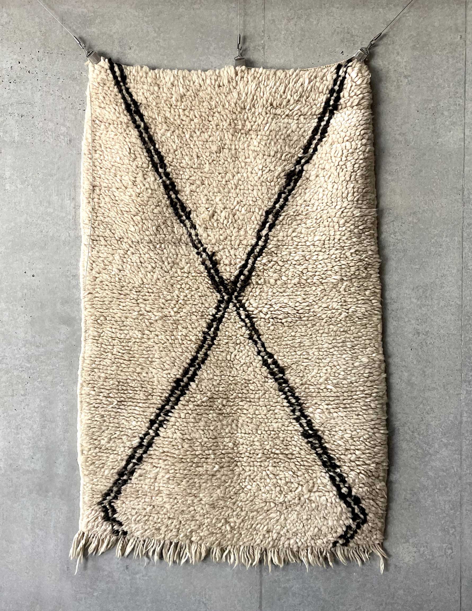 ベニワレンはモロッコのアトラス山脈に住むベルベル人女性によって、一目一目しっかりと結びながら織らているハンドメイドのウールラグです。白を基調とし黒の細いラインで模様が描かれています。触り心地はふわふわと柔らかく長い毛足が特徴です。白を基調としたシンプルなデザインとナチュラルな色合いは、コーディネートの幅も広く他のインテリアとも調和しやすいです。