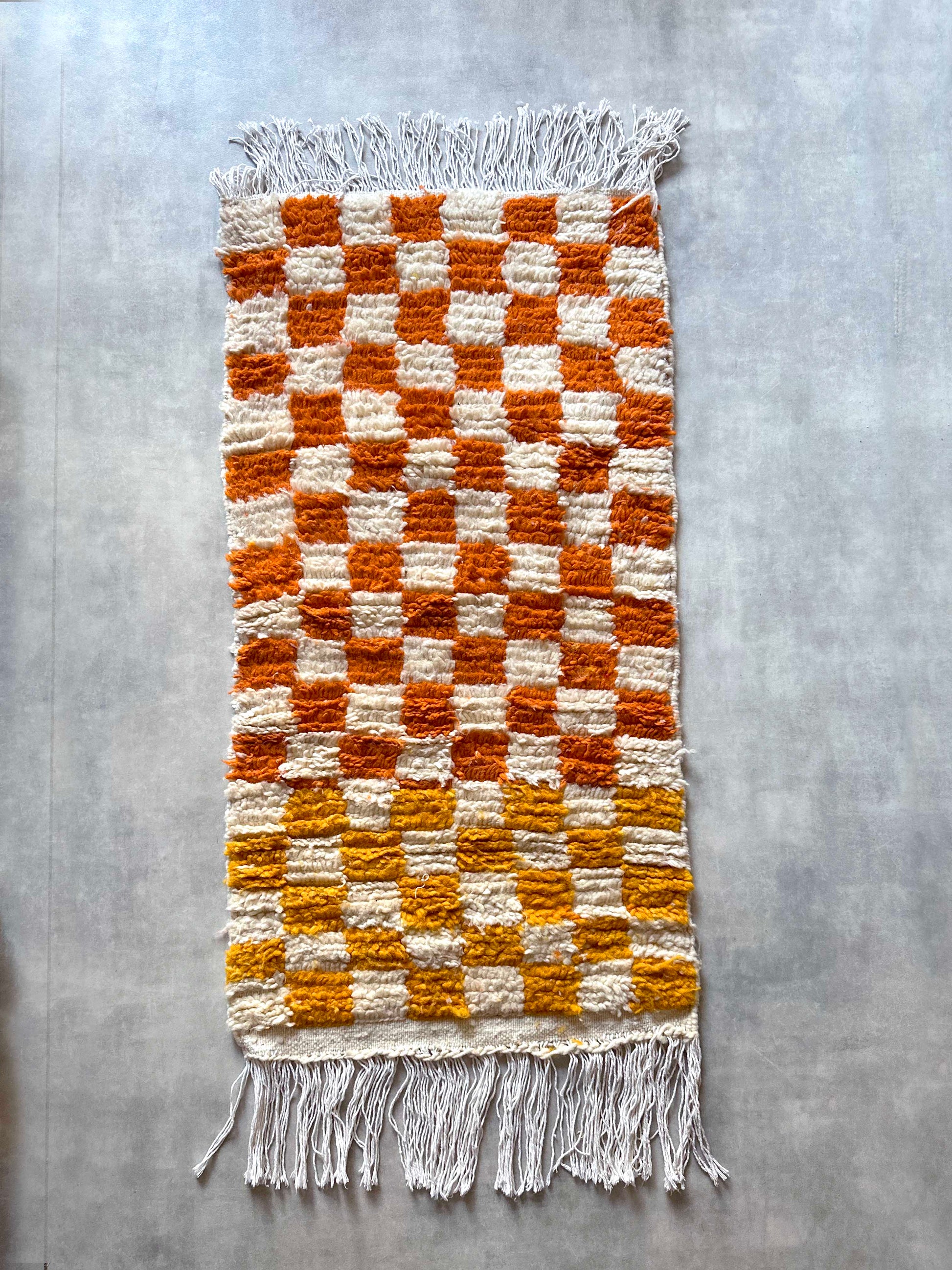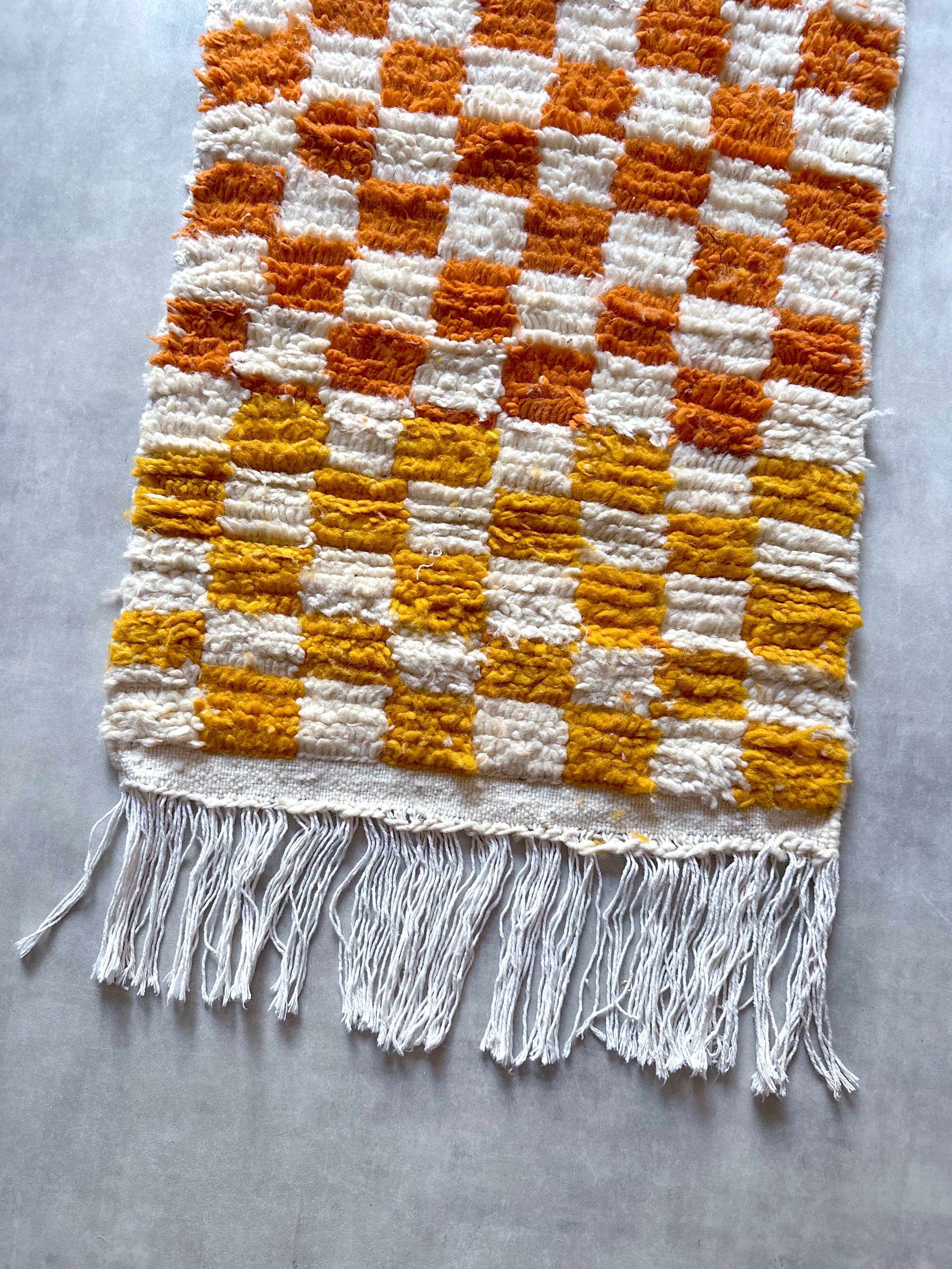 ブロックチェックのウールラグはモロッコのアトラス山脈に古くから住むベルベル人女性により伝統的な手法を古くから受けぎ、