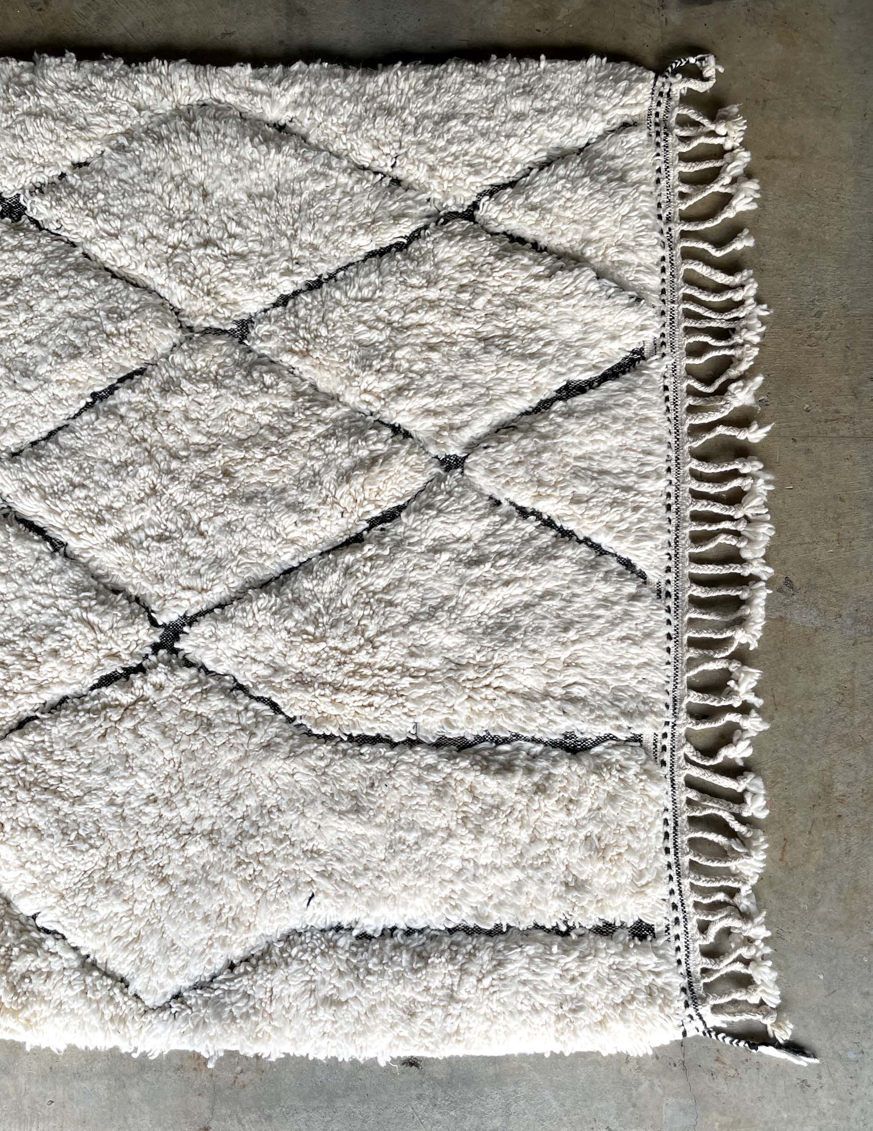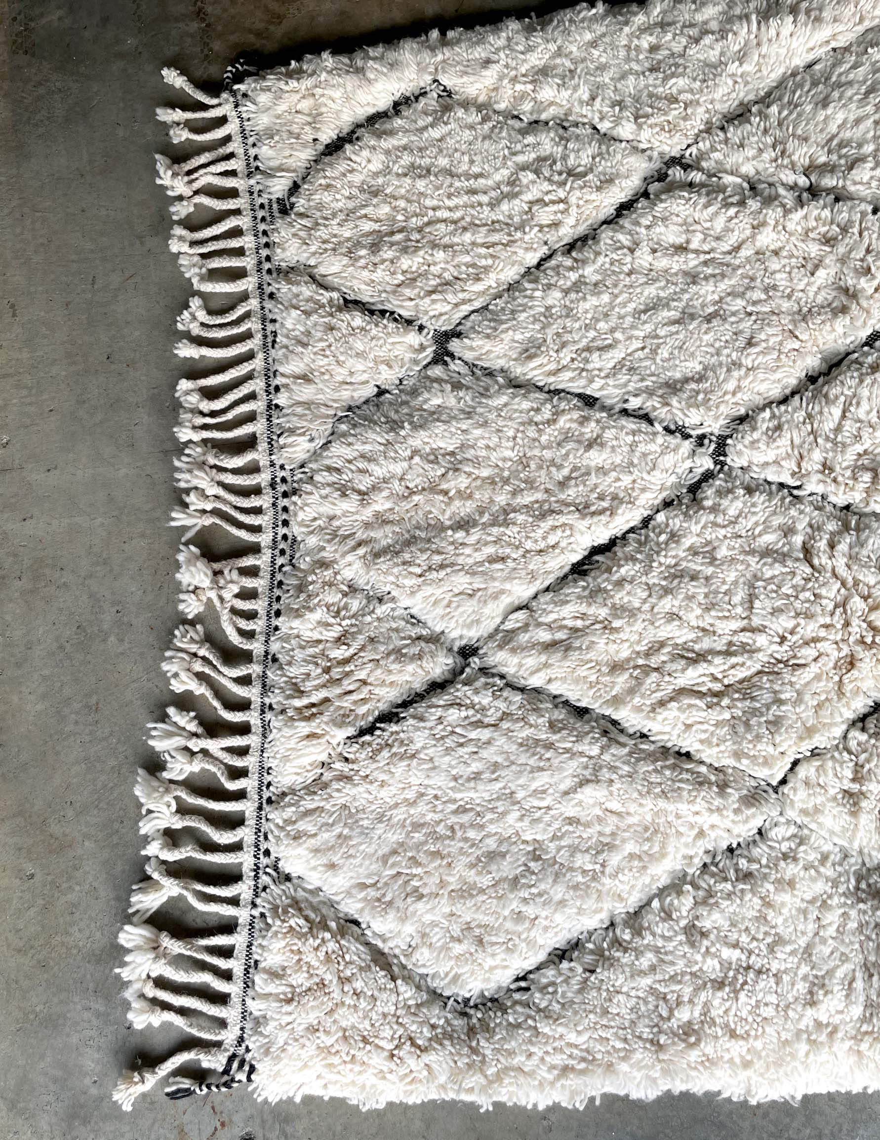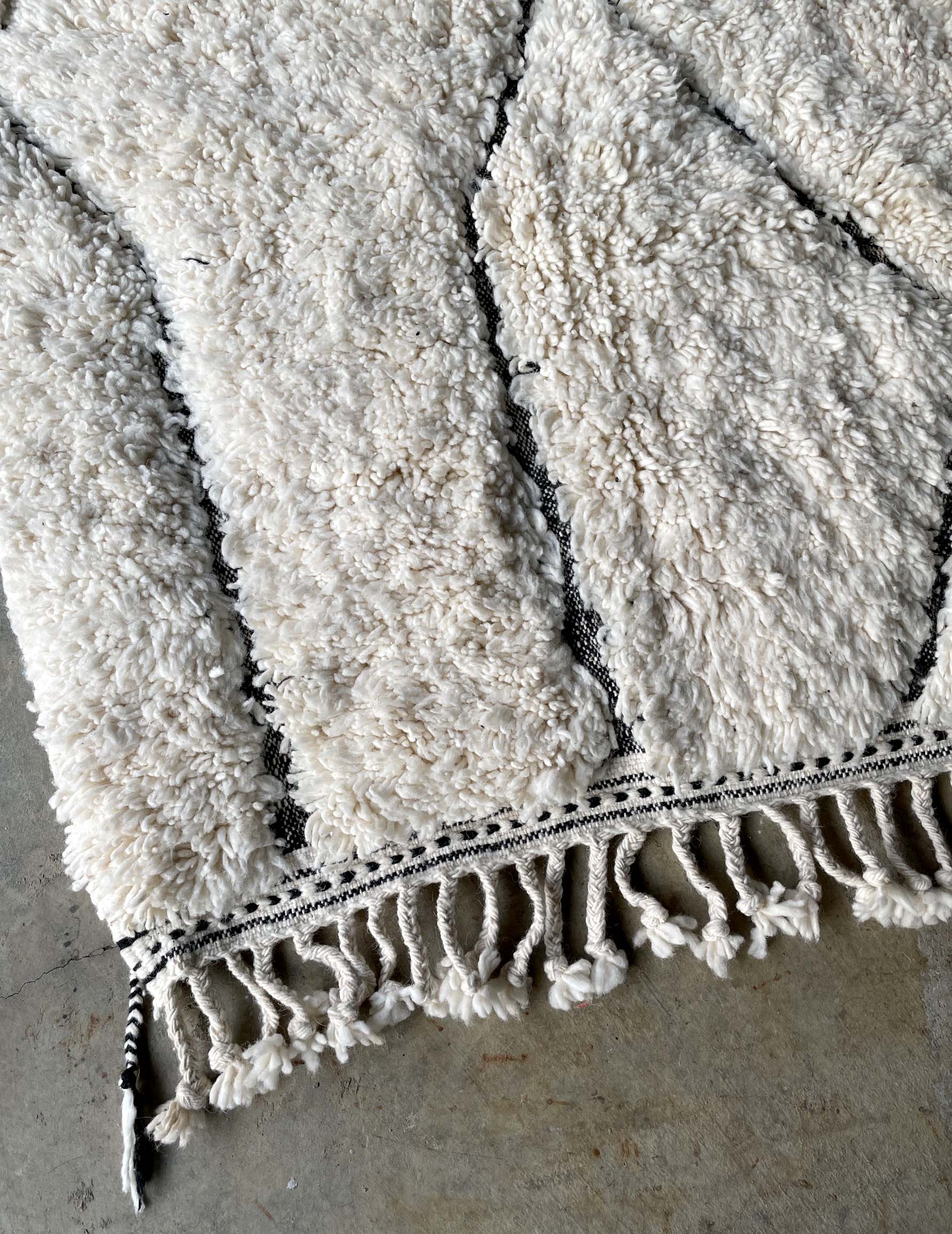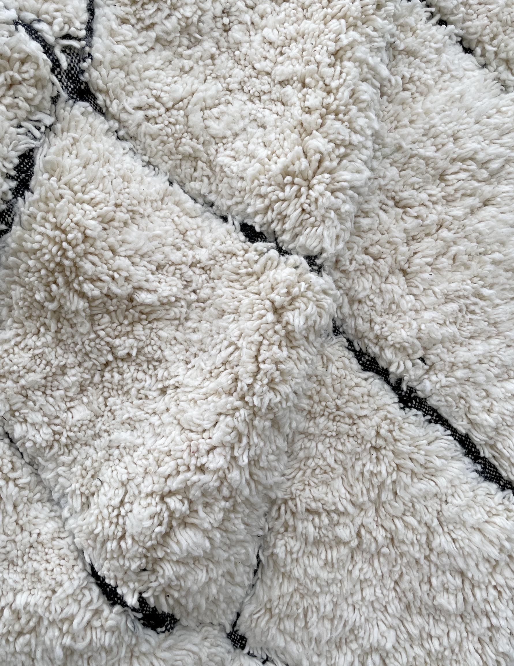 ベニワレンはモロッコのアトラス山脈に住むベルベル人女性によって、一目一目しっかりと結びながら織らているハンドメイドのウールラグです。白を基調とし黒の細いラインで模様が描かれています。触り心地はふわふわと柔らかく長い毛足が特徴です。白を基調としたシンプルなデザインとナチュラルな色合いは、コーディネートの幅も広く他のインテリアとも調和しやすいです。