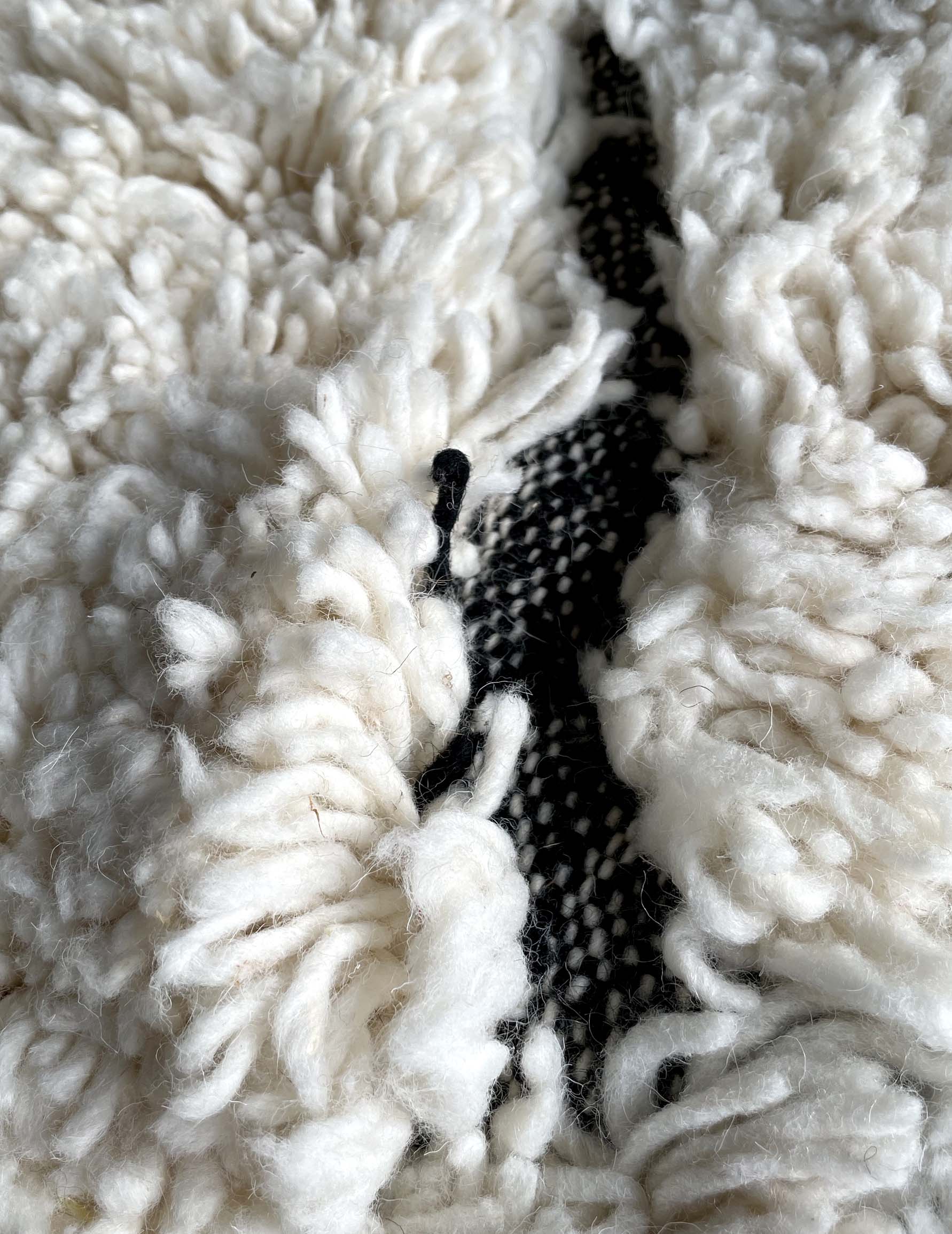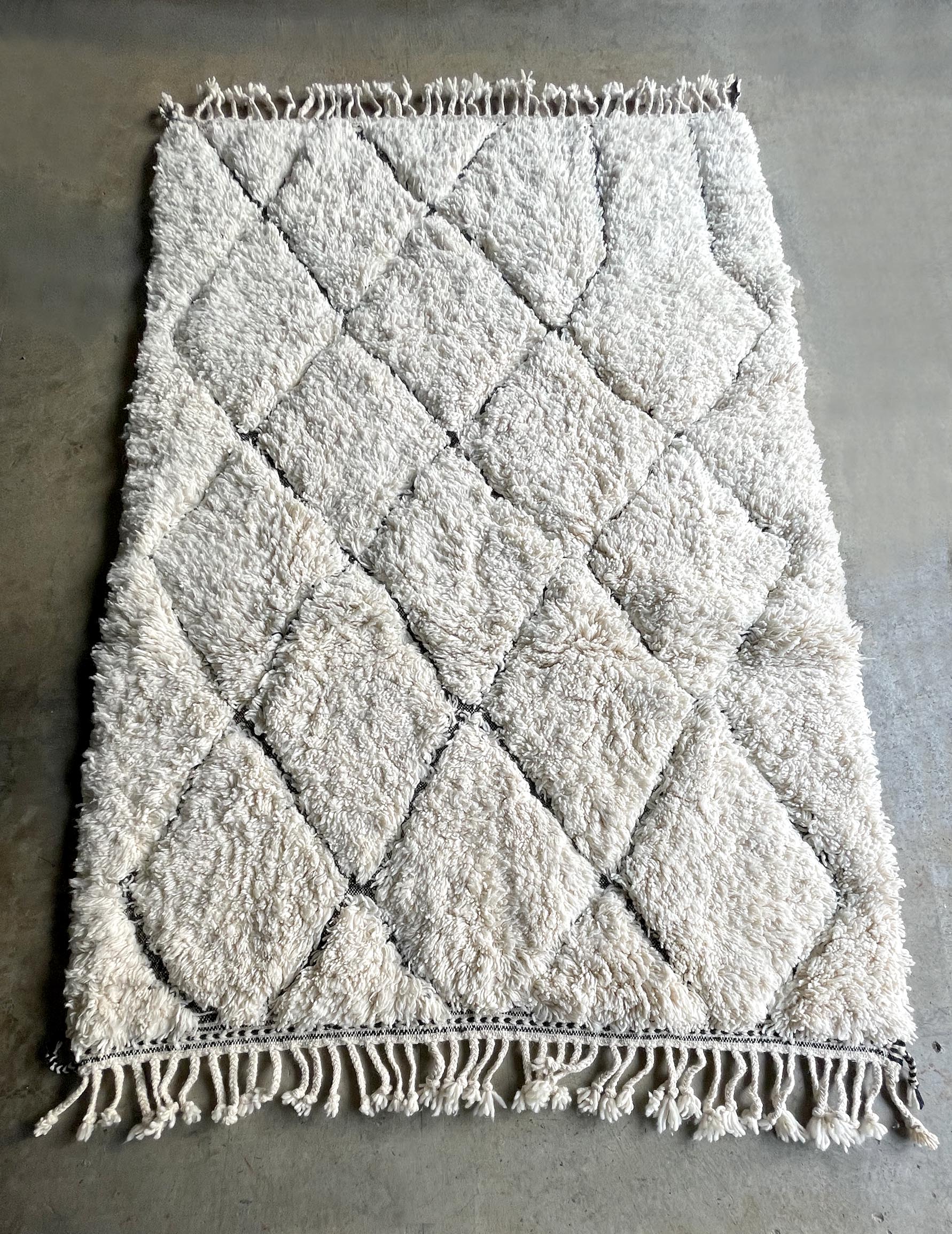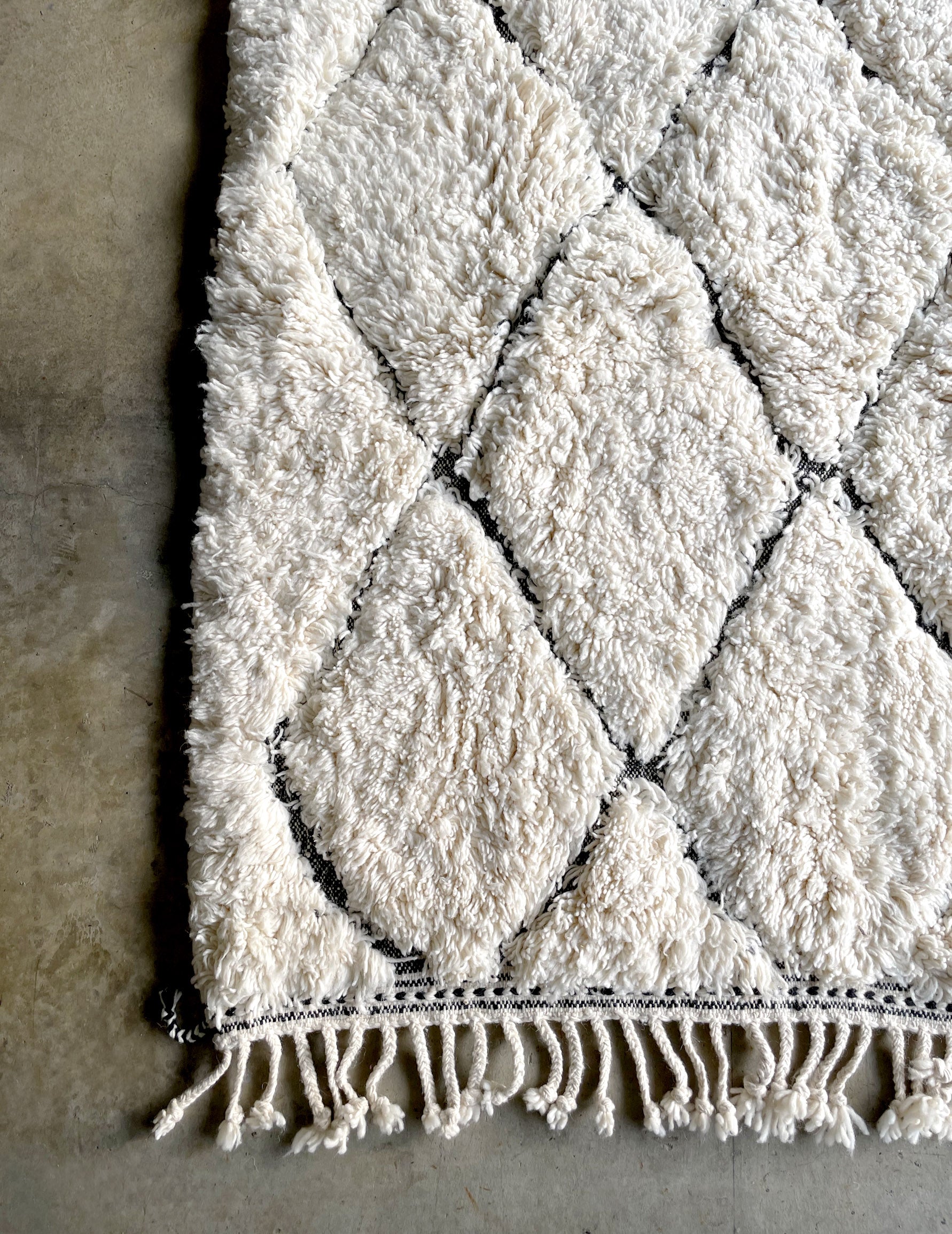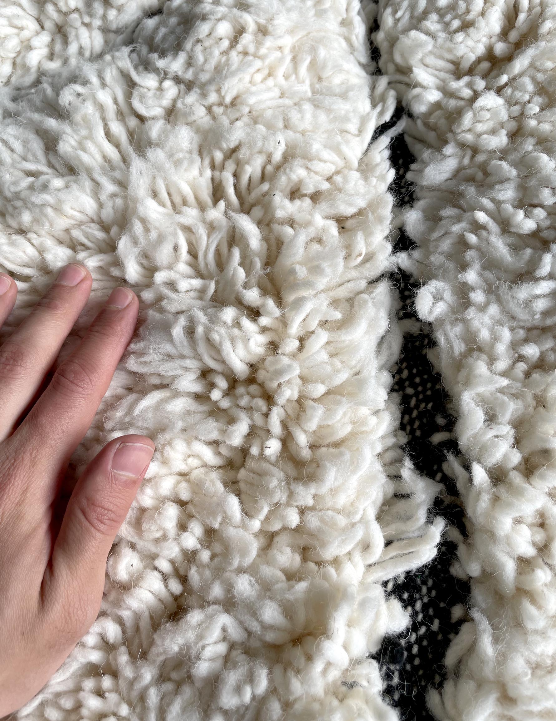 ベニワレンはモロッコのアトラス山脈に住むベルベル人女性によって、一目一目しっかりと結びながら織らているハンドメイドのウールラグです。白を基調とし黒の細いラインで模様が描かれています。触り心地はふわふわと柔らかく長い毛足が特徴です。白を基調としたシンプルなデザインとナチュラルな色合いは、コーディネートの幅も広く他のインテリアとも調和しやすいです。