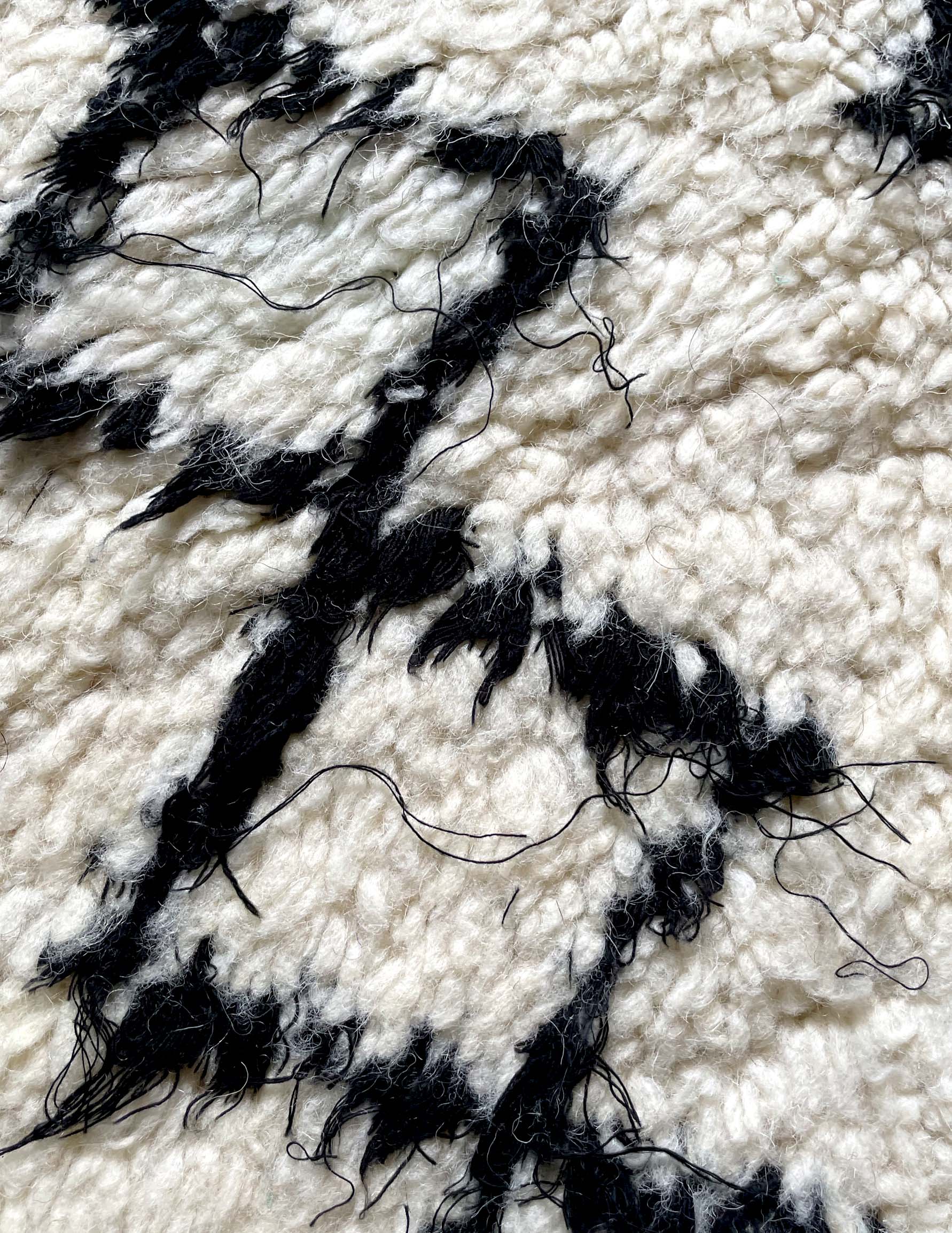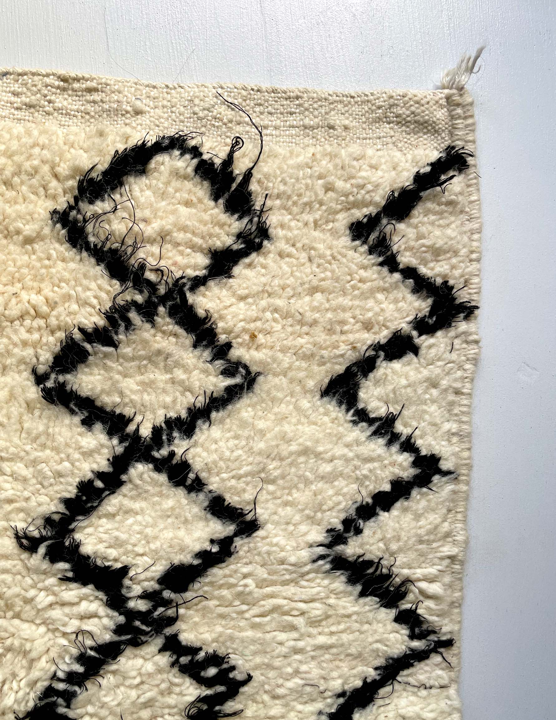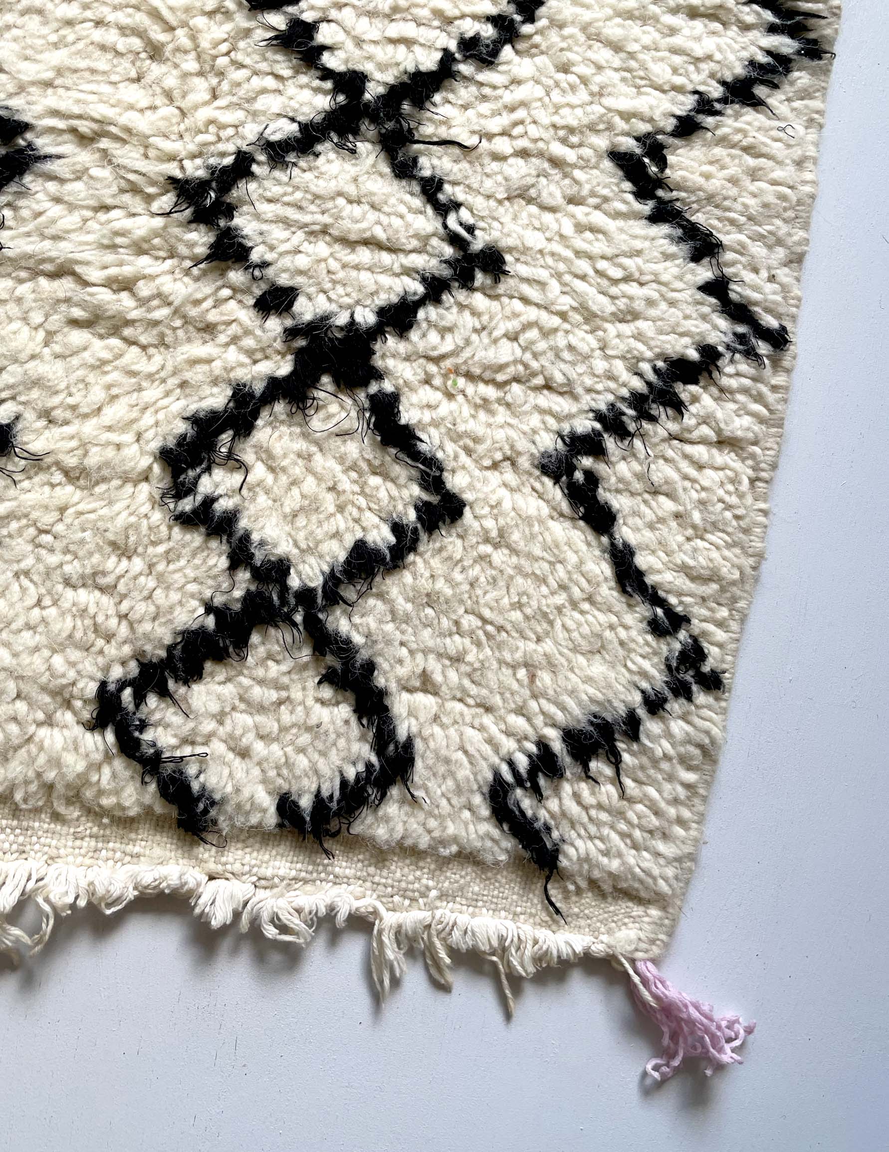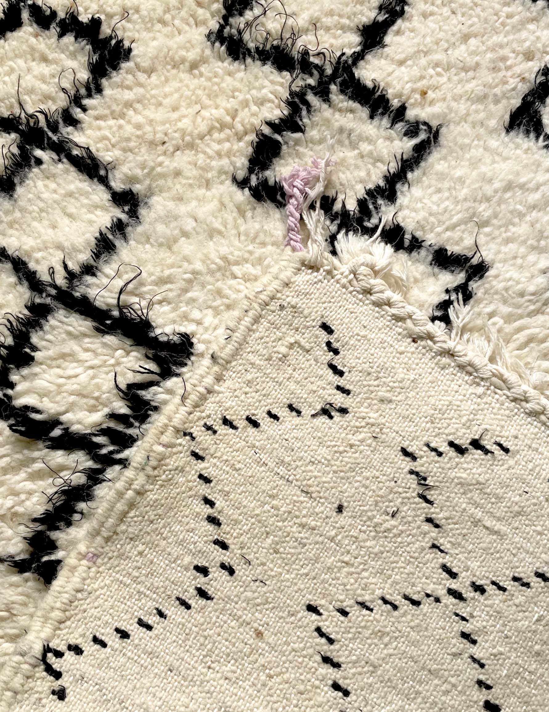 ベニワレンはモロッコのアトラス山脈に住むベルベル人女性によって、一目一目しっかりと結びながら織らているハンドメイドのウールラグです。白を基調とし黒の細いラインで模様が描かれています。触り心地はふわふわと柔らかく長い毛足が特徴です。白を基調としたシンプルなデザインとナチュラルな色合いは、コーディネートの幅も広く他のインテリアとも調和しやすいです。