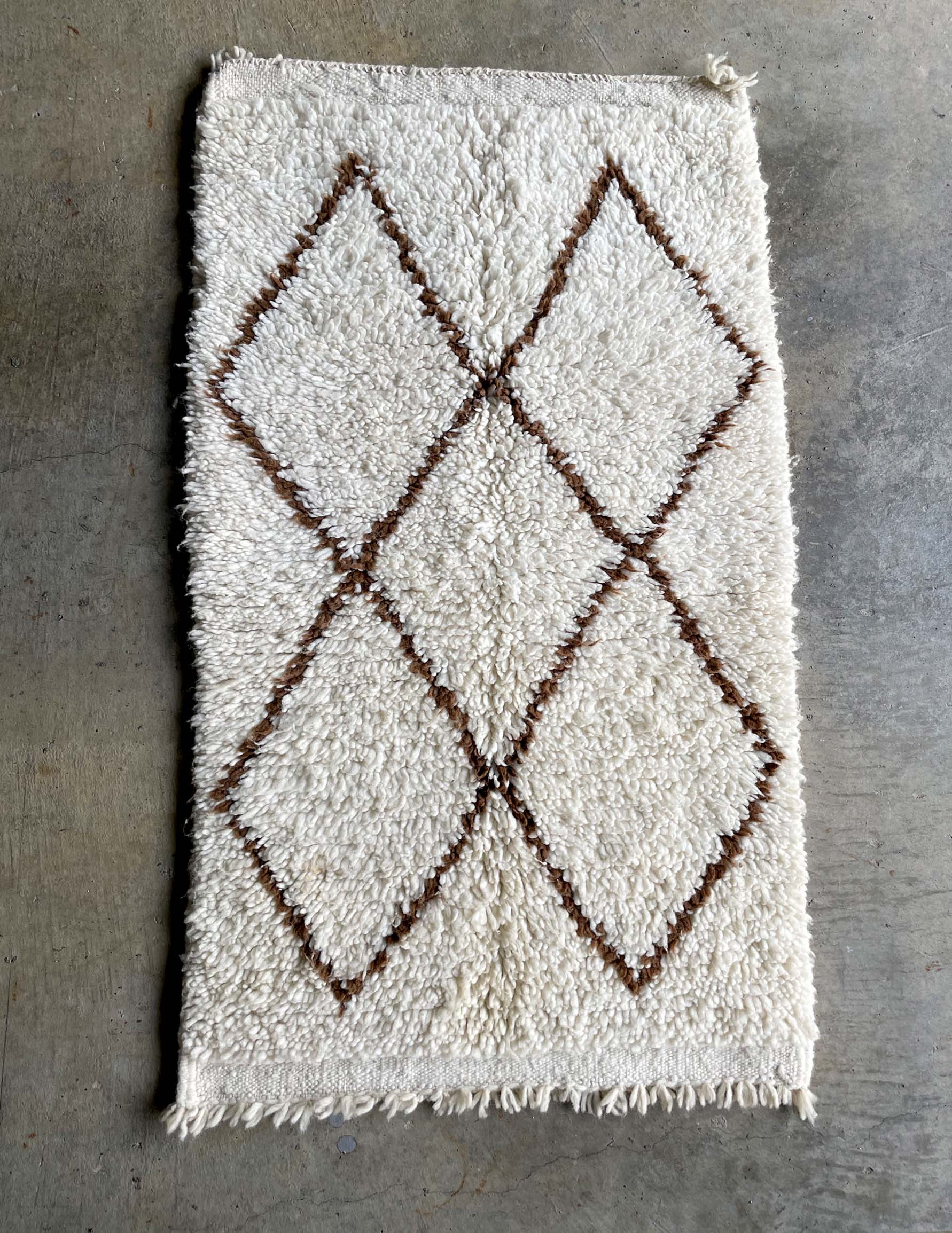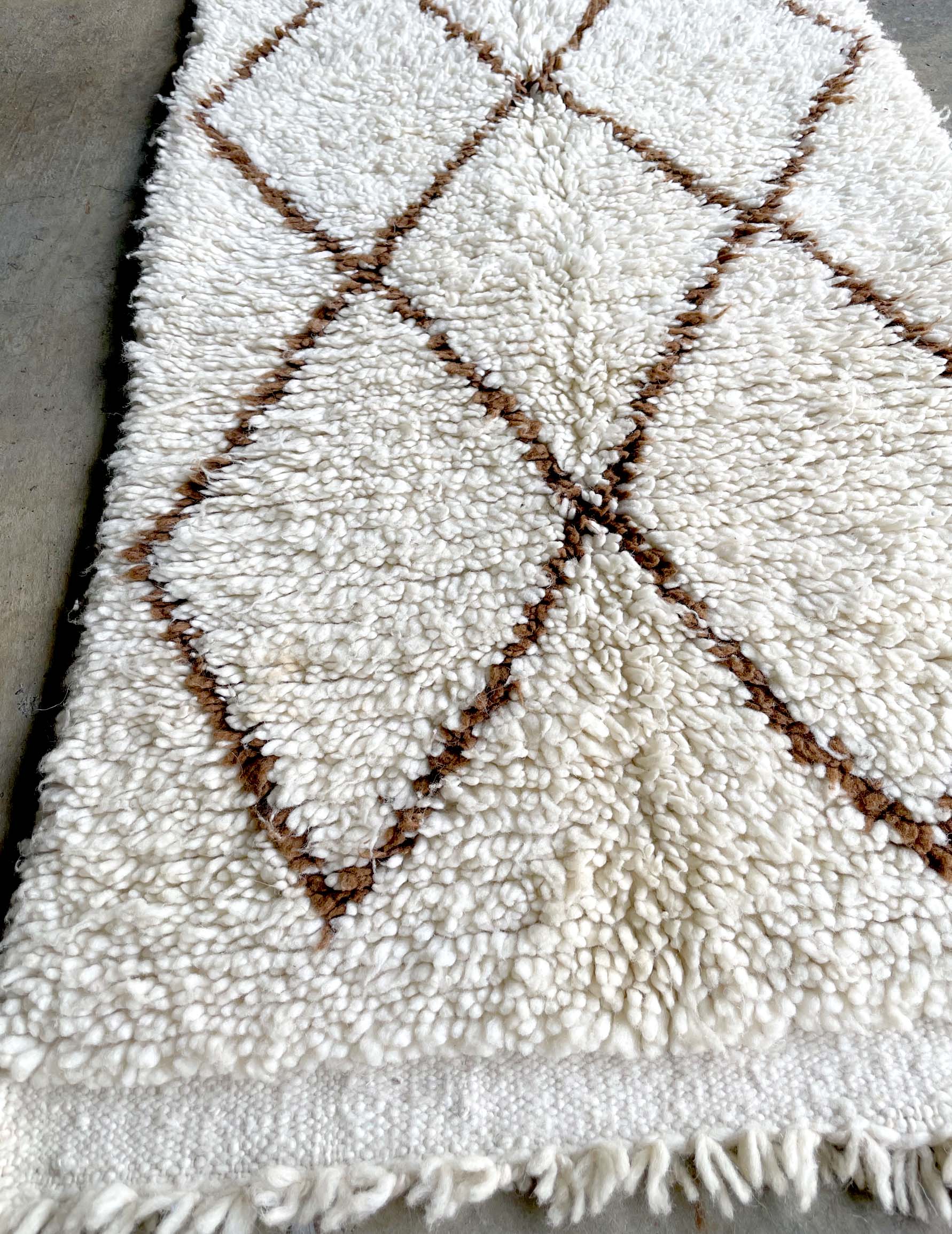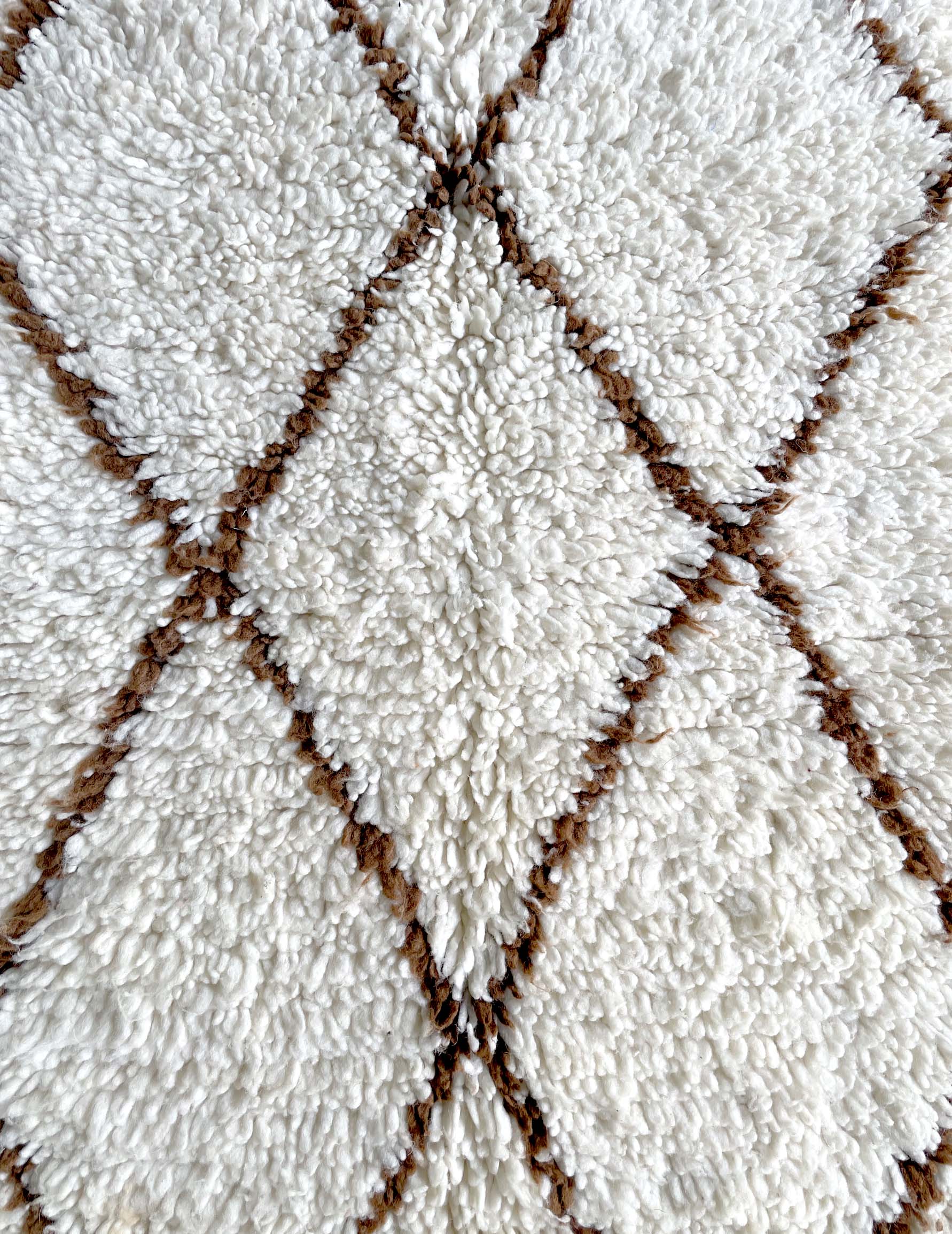 ベニワレンはモロッコのアトラス山脈に住むベルベル人女性によって、一目一目しっかりと結びながら織らているハンドメイドのウールラグです。白を基調とし黒の細いラインで模様が描かれています。触り心地はふわふわと柔らかく長い毛足が特徴です。白を基調としたシンプルなデザインとナチュラルな色合いは、コーディネートの幅も広く他のインテリアとも調和しやすいです。
