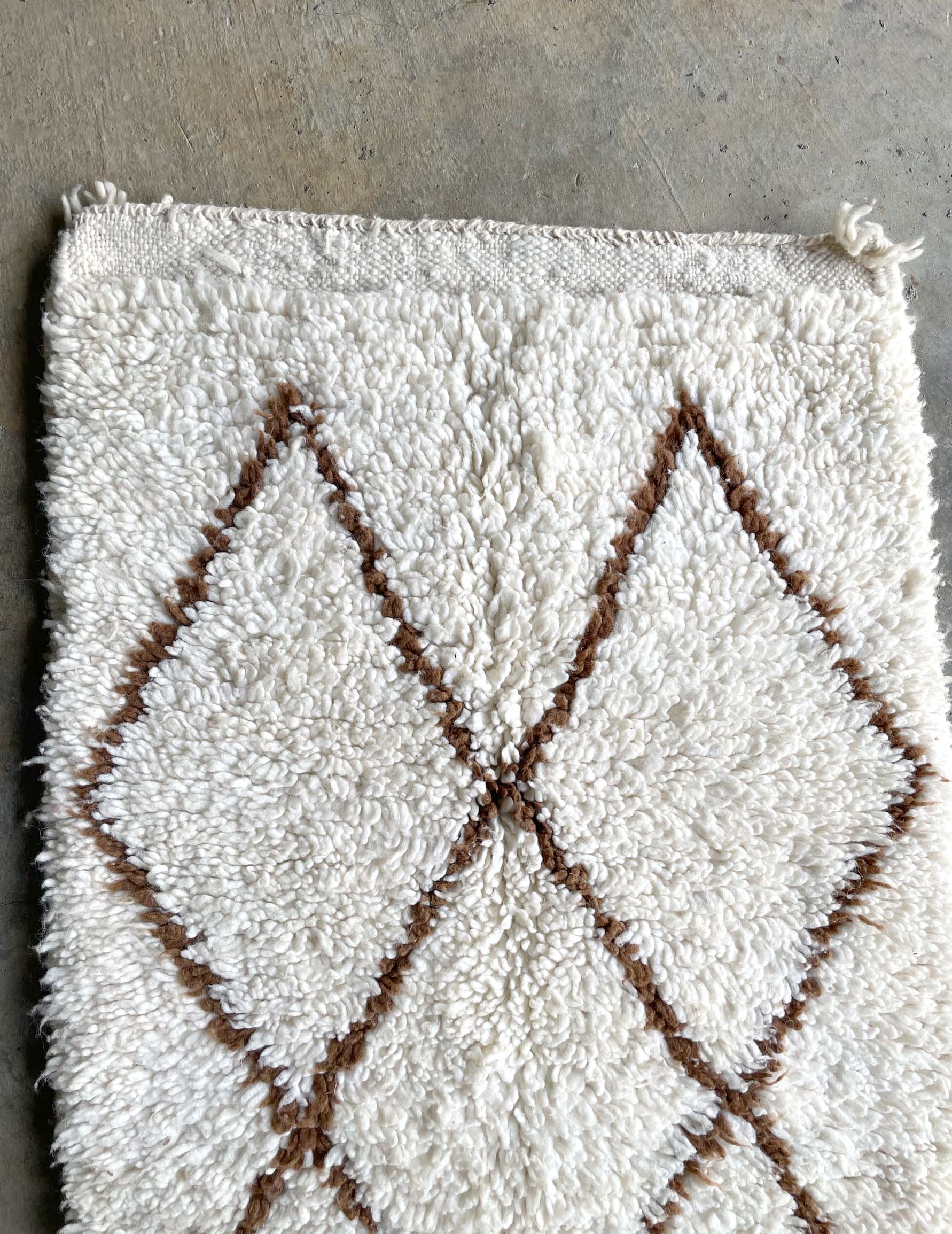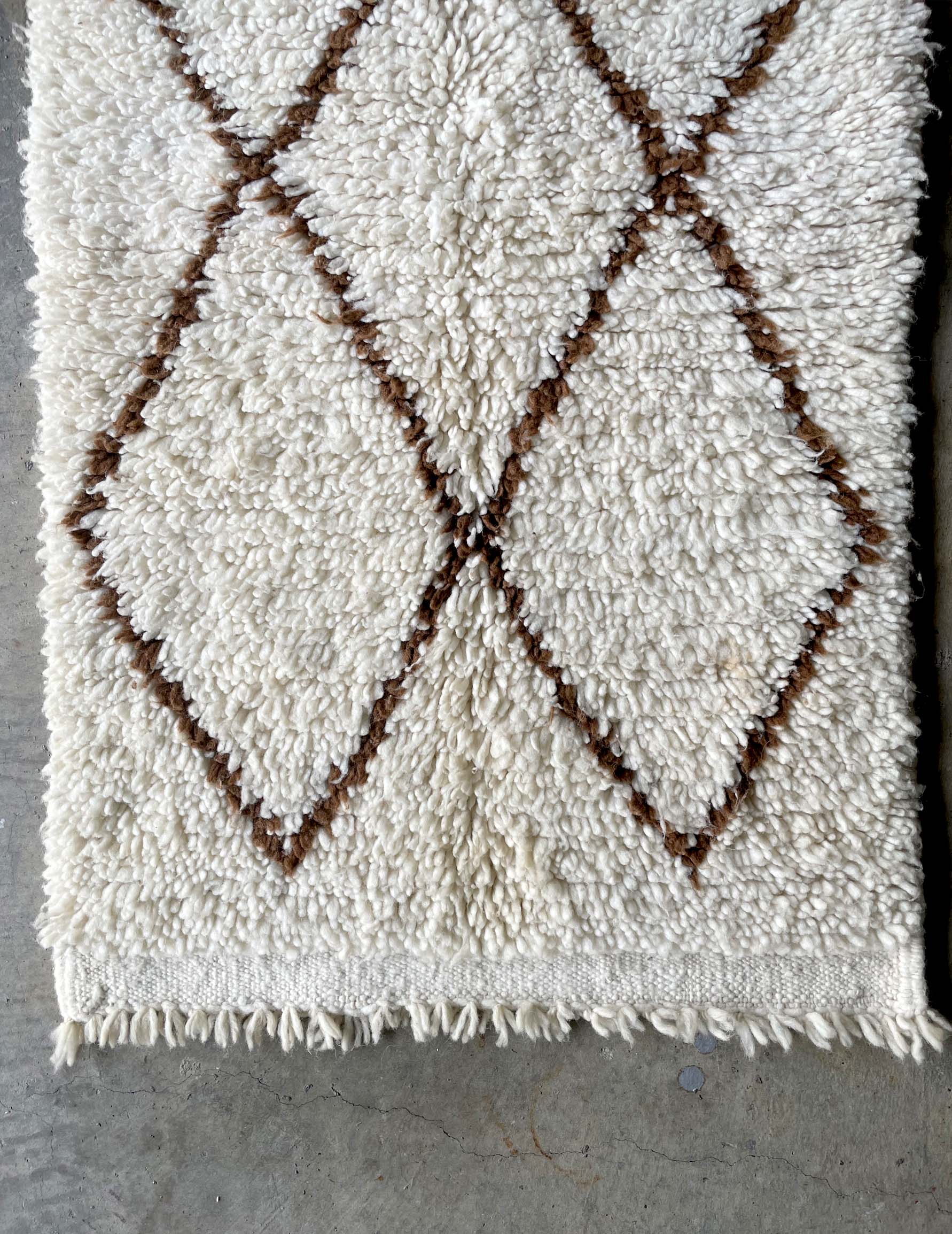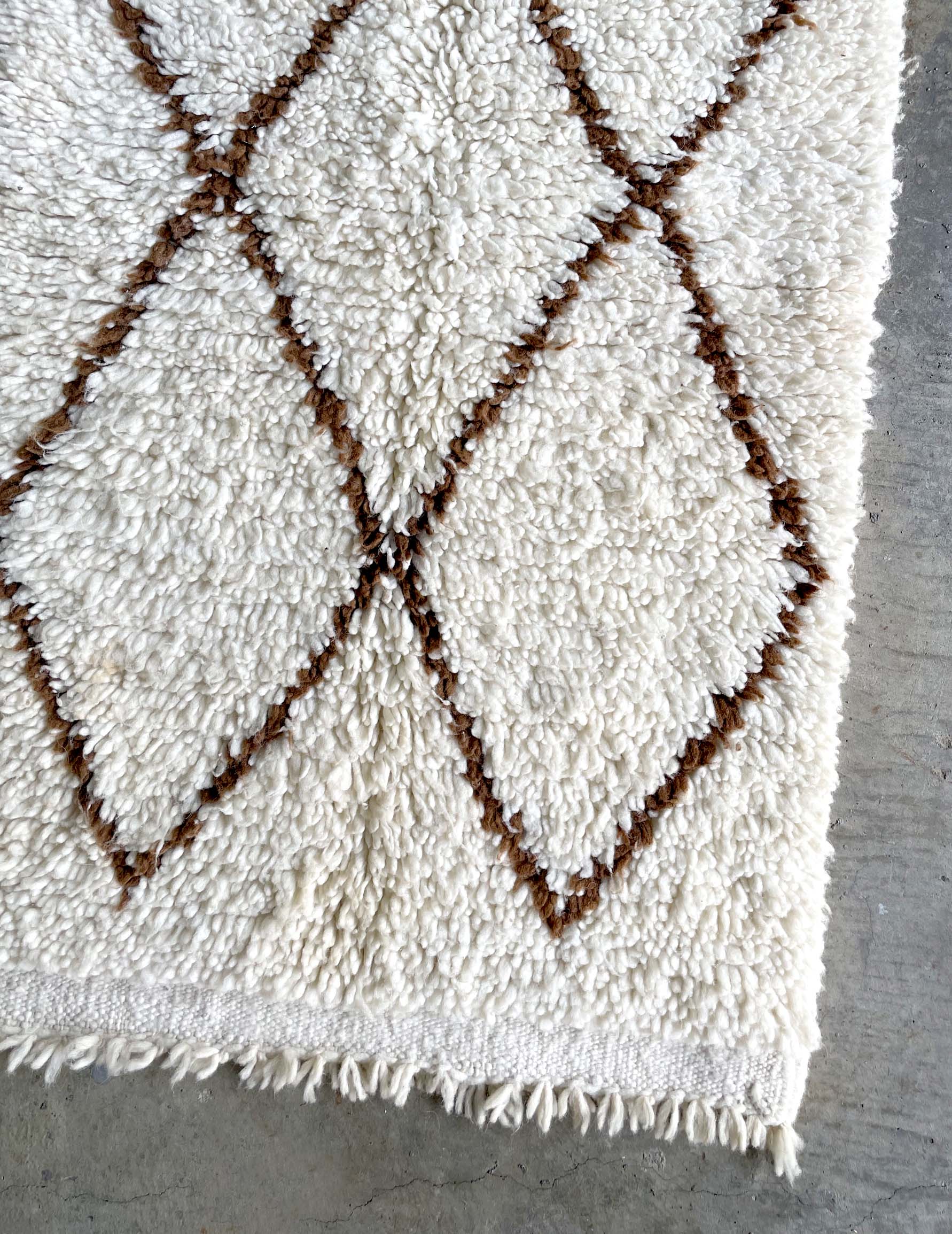 ベニワレンはモロッコのアトラス山脈に住むベルベル人女性によって、一目一目しっかりと結びながら織らているハンドメイドのウールラグです。白を基調とし黒の細いラインで模様が描かれています。触り心地はふわふわと柔らかく長い毛足が特徴です。白を基調としたシンプルなデザインとナチュラルな色合いは、コーディネートの幅も広く他のインテリアとも調和しやすいです。