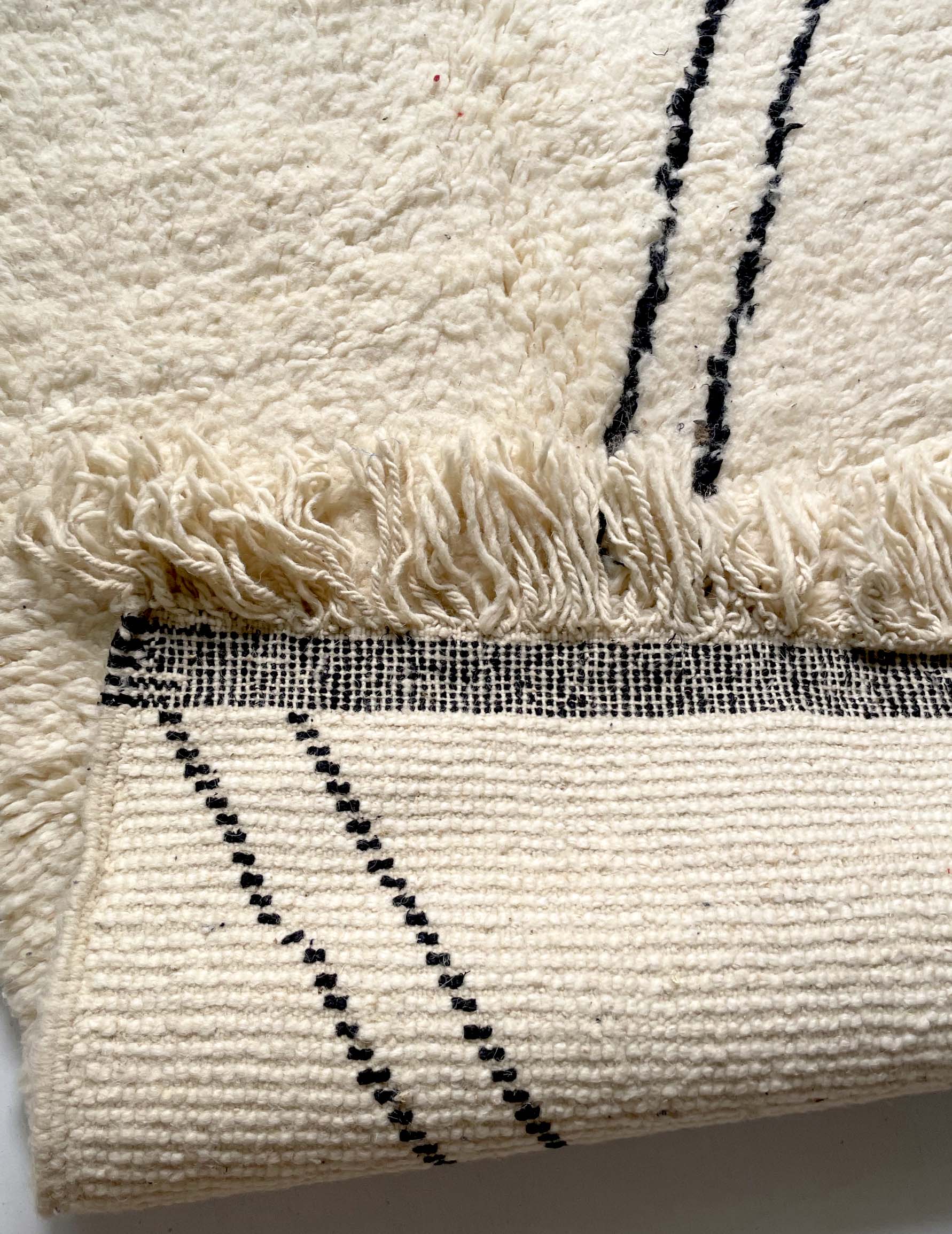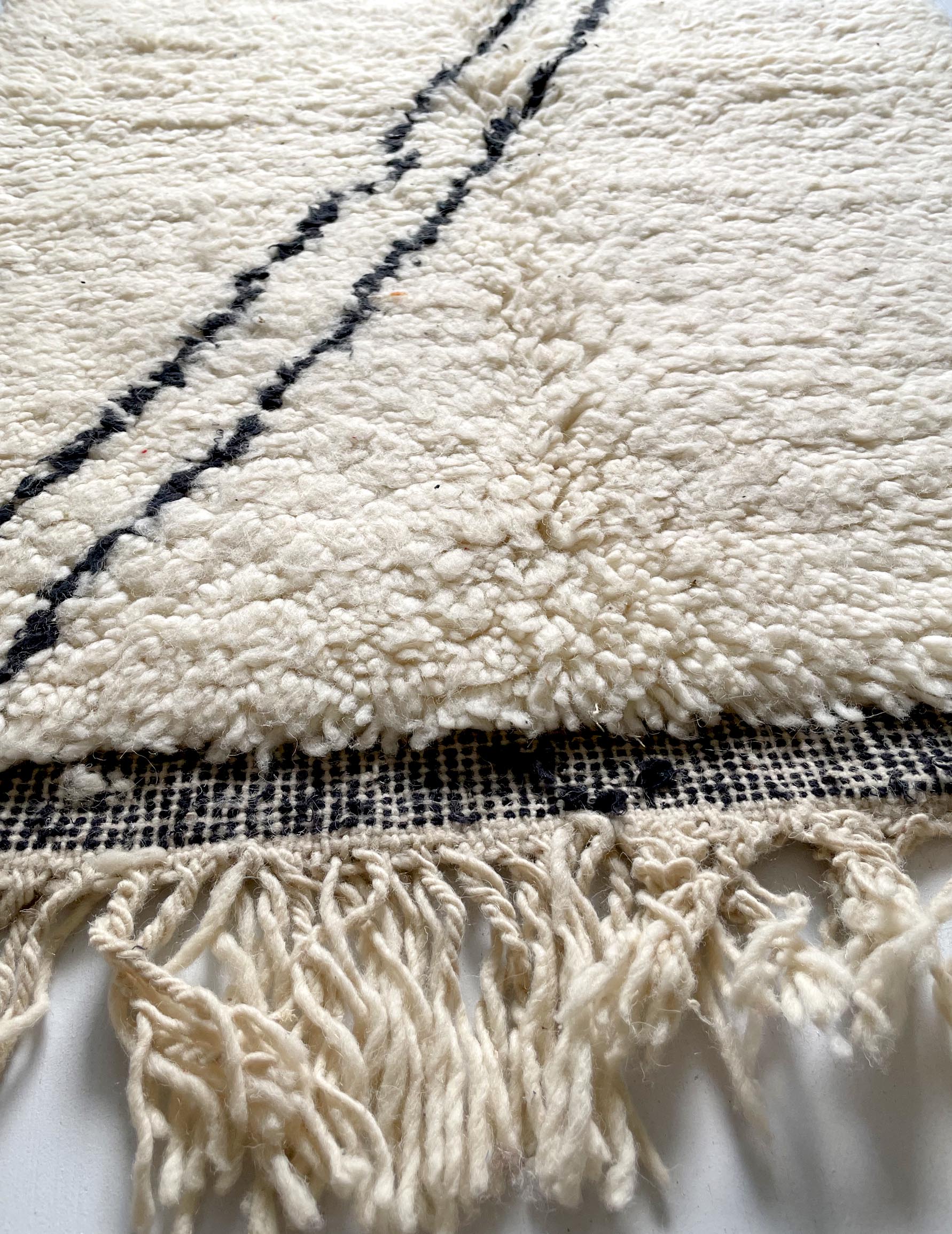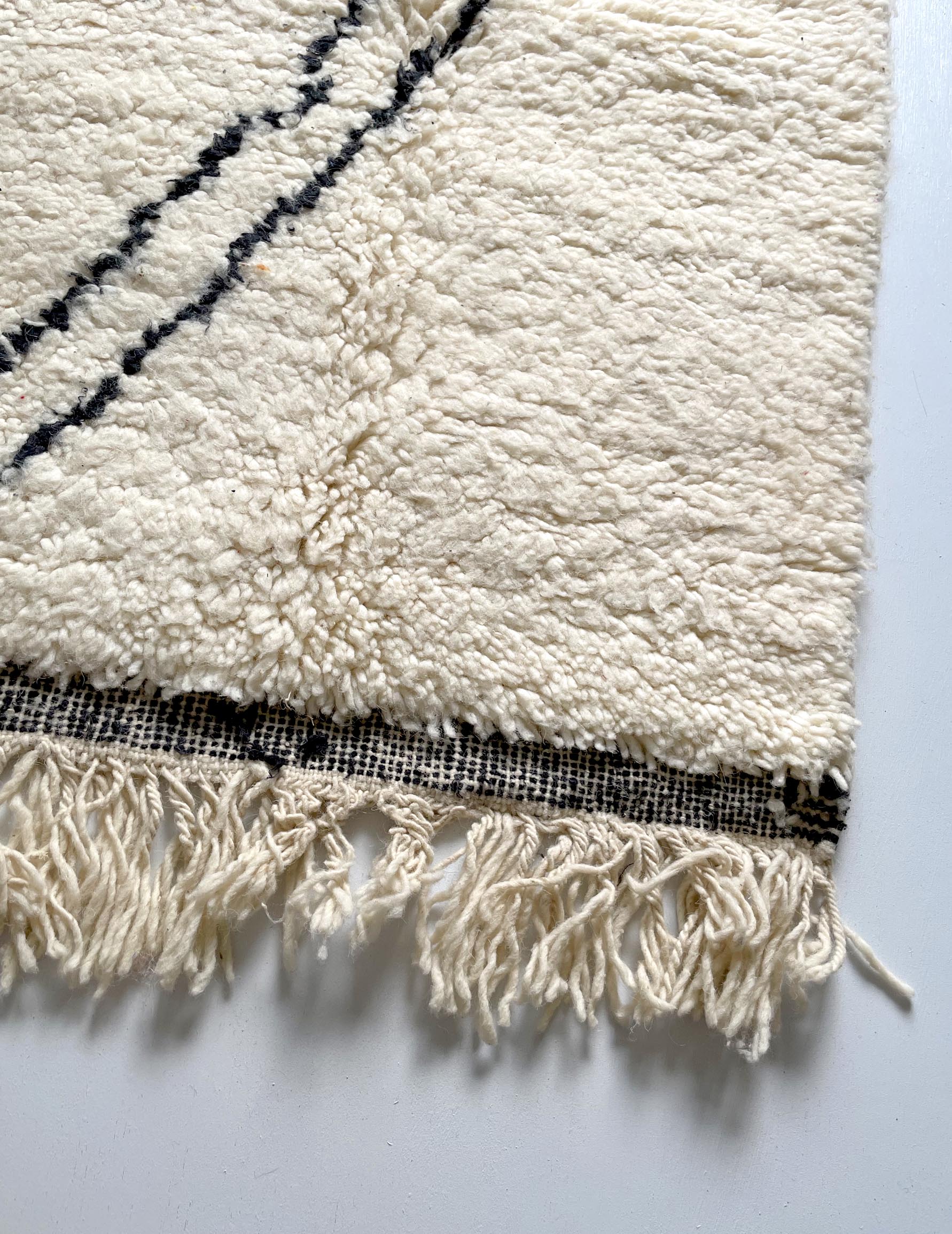 ベニワレンはモロッコのアトラス山脈に住むベルベル人女性によって、一目一目しっかりと結びながら織らているハンドメイドのウールラグです。白を基調とし黒の細いラインで模様が描かれています。触り心地はふわふわと柔らかく長い毛足が特徴です。白を基調としたシンプルなデザインとナチュラルな色合いは、コーディネートの幅も広く他のインテリアとも調和しやすいです。