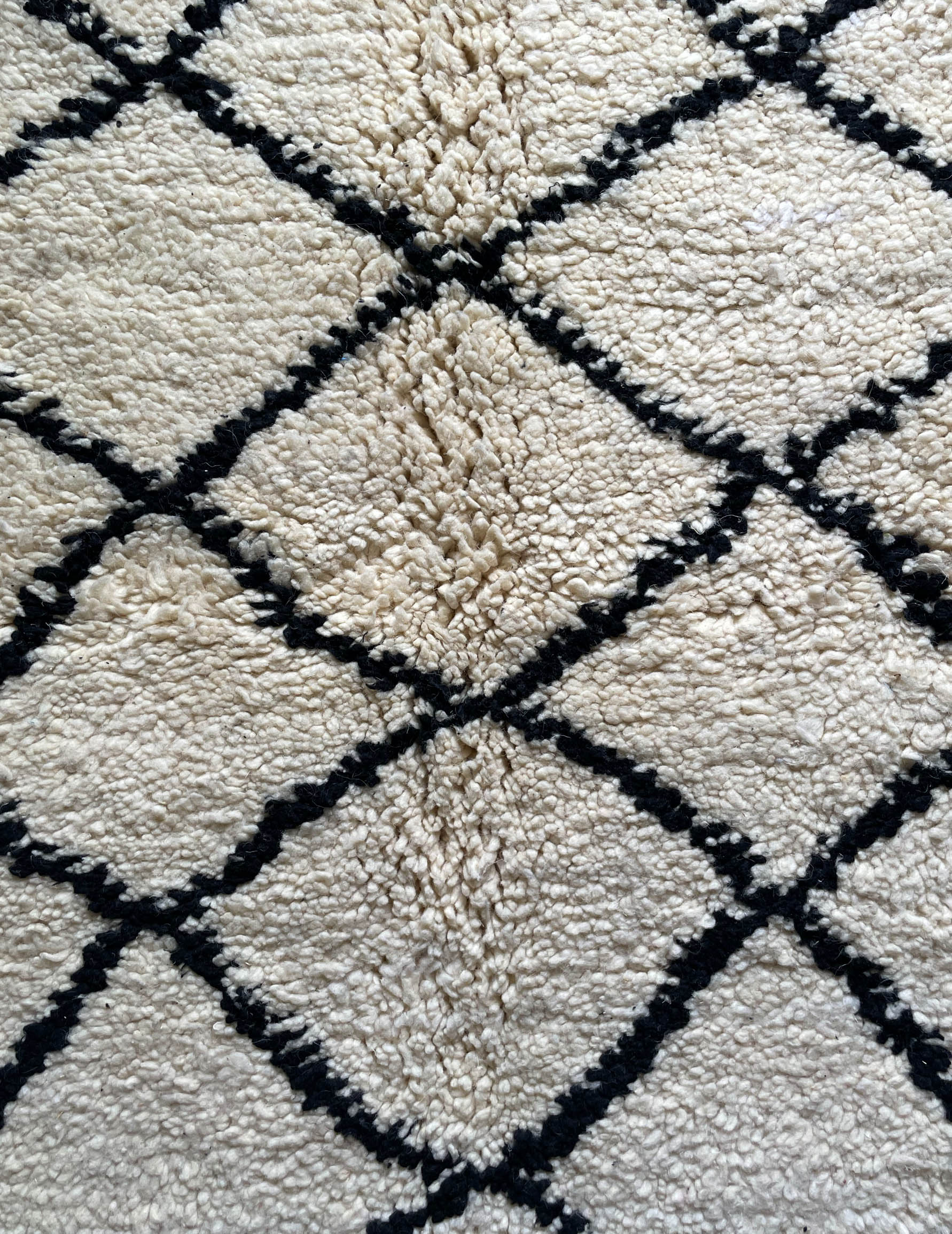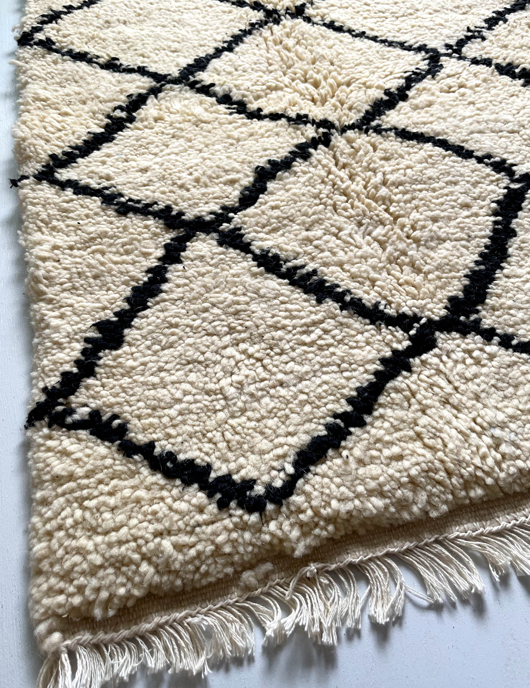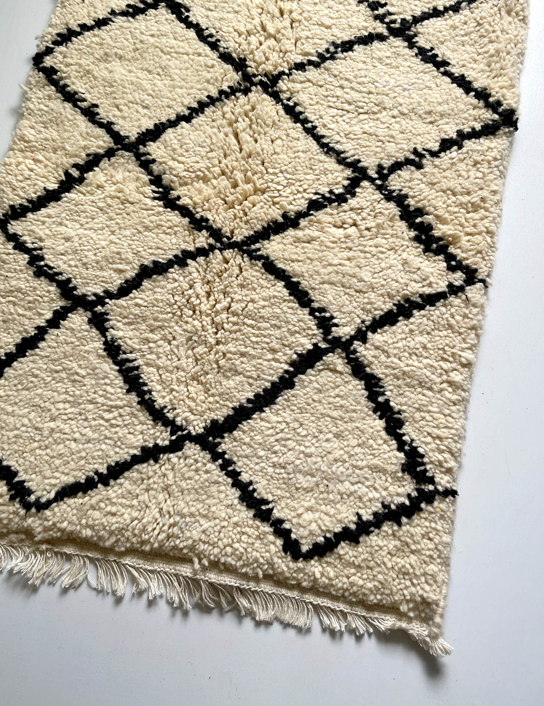 ベニワレンはモロッコのアトラス山脈に住むベルベル人女性によって、一目一目しっかりと結びながら織らているハンドメイドのウールラグです。白を基調とし黒の細いラインで模様が描かれています。触り心地はふわふわと柔らかく長い毛足が特徴です。白を基調としたシンプルなデザインとナチュラルな色合いは、コーディネートの幅も広く他のインテリアとも調和しやすいです。