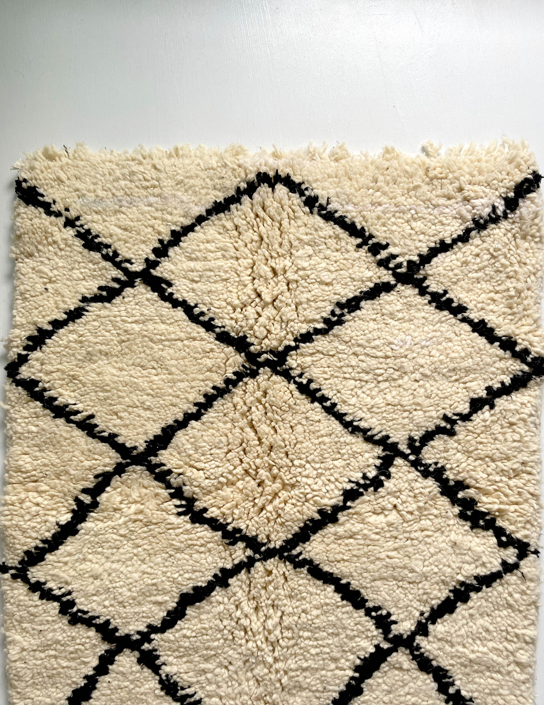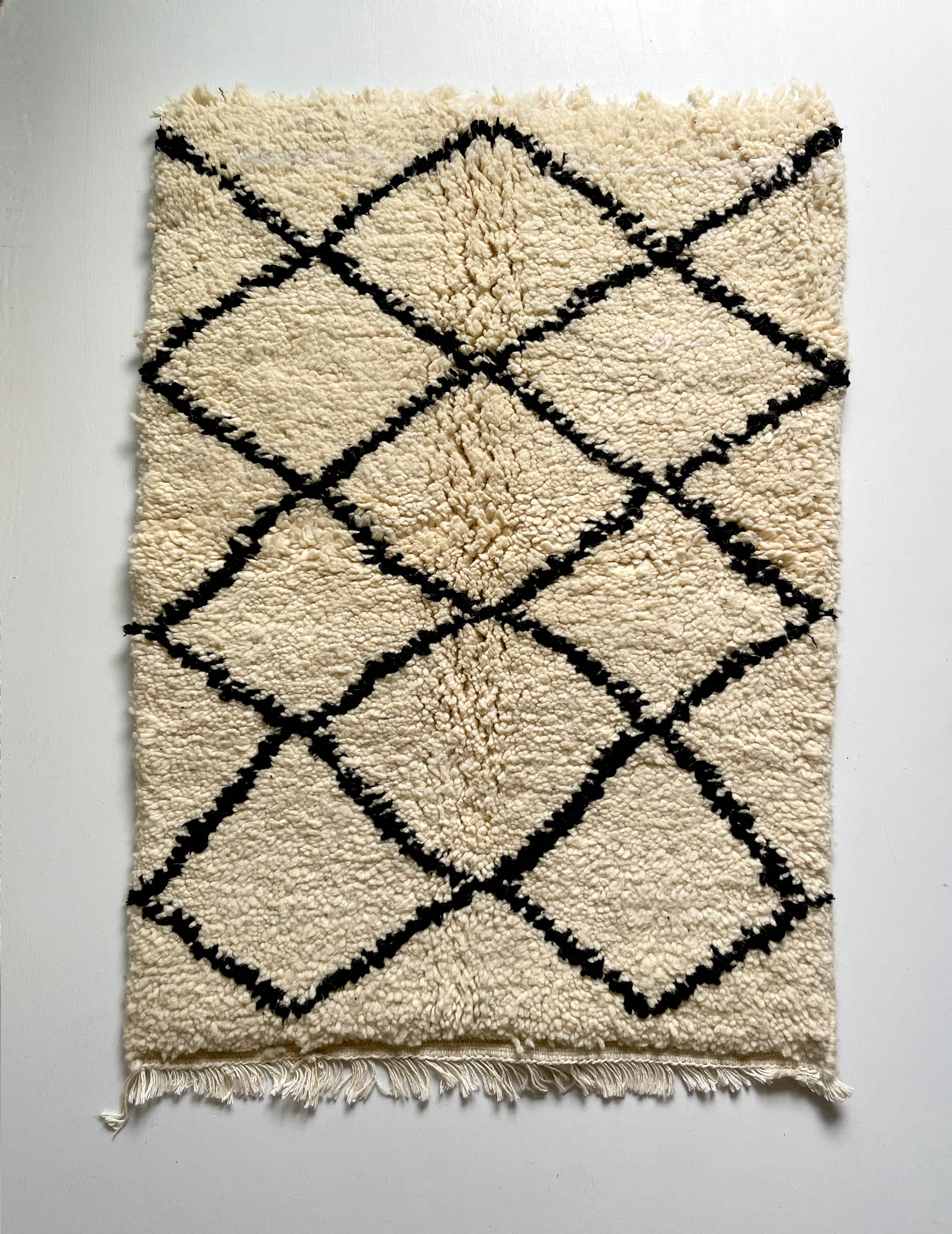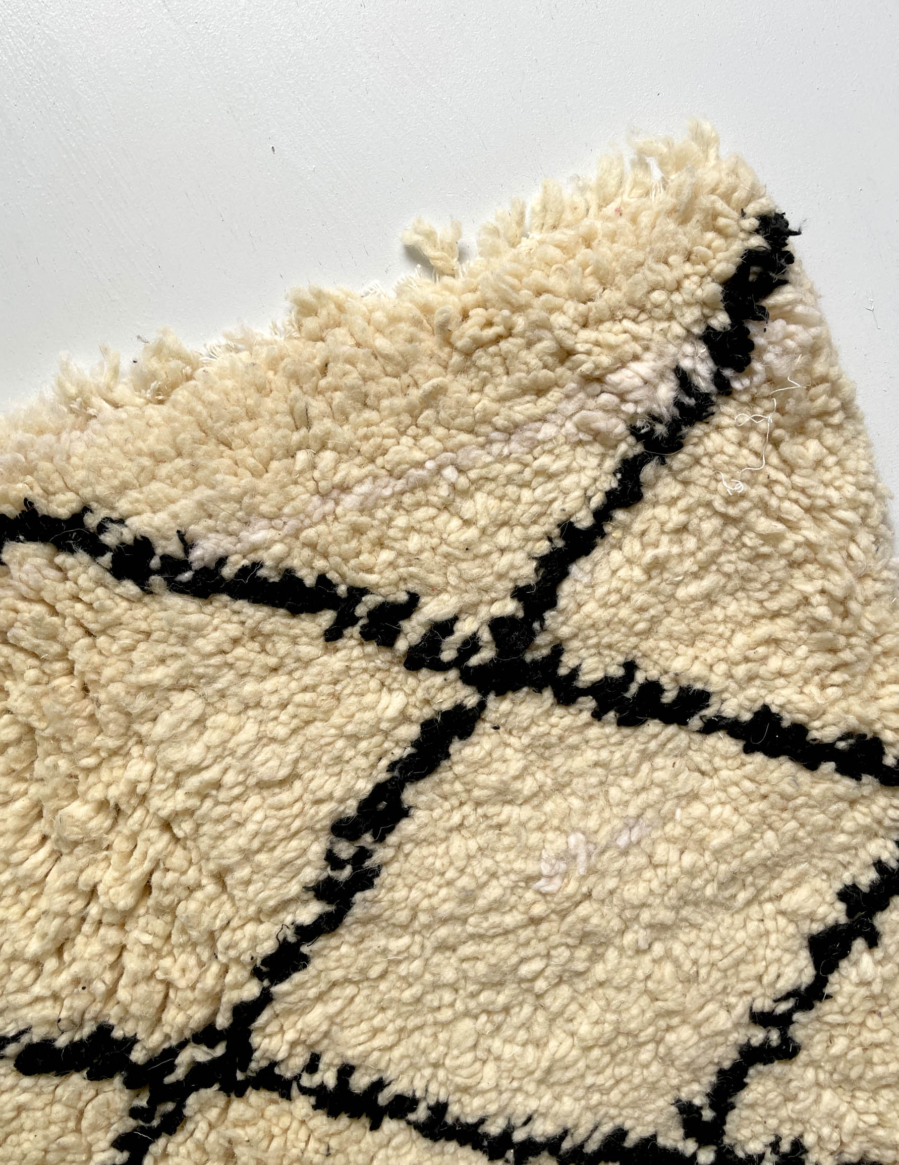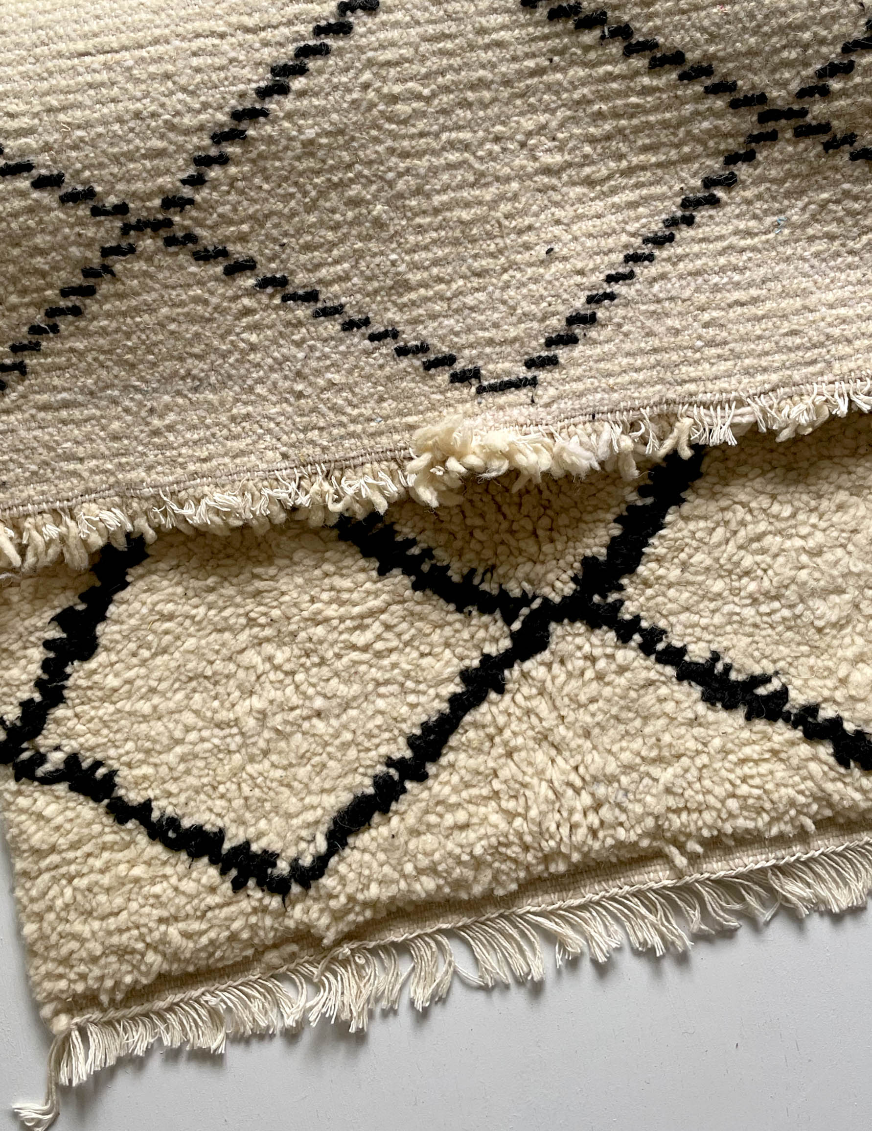 ベニワレンはモロッコのアトラス山脈に住むベルベル人女性によって、一目一目しっかりと結びながら織らているハンドメイドのウールラグです。白を基調とし黒の細いラインで模様が描かれています。触り心地はふわふわと柔らかく長い毛足が特徴です。白を基調としたシンプルなデザインとナチュラルな色合いは、コーディネートの幅も広く他のインテリアとも調和しやすいです。