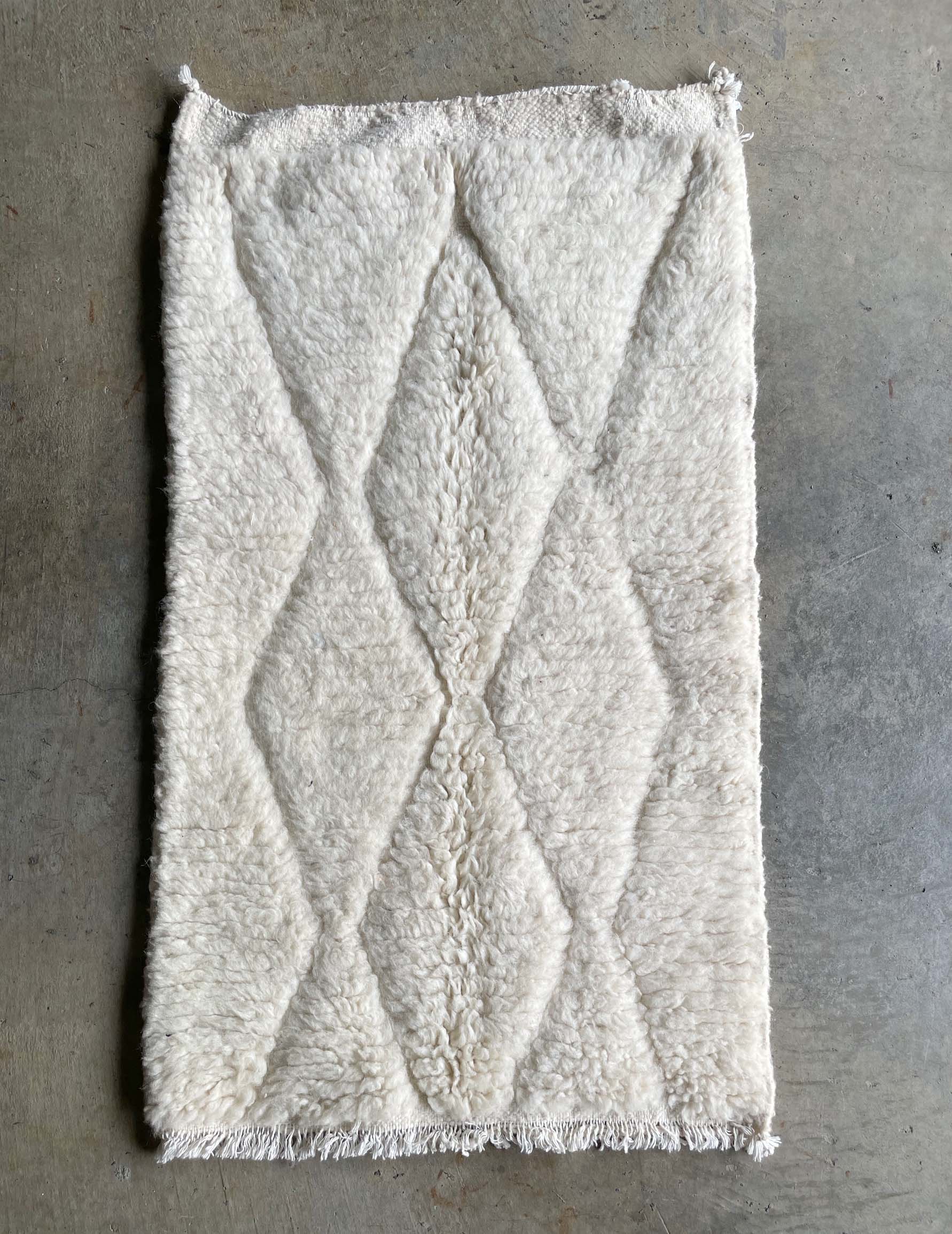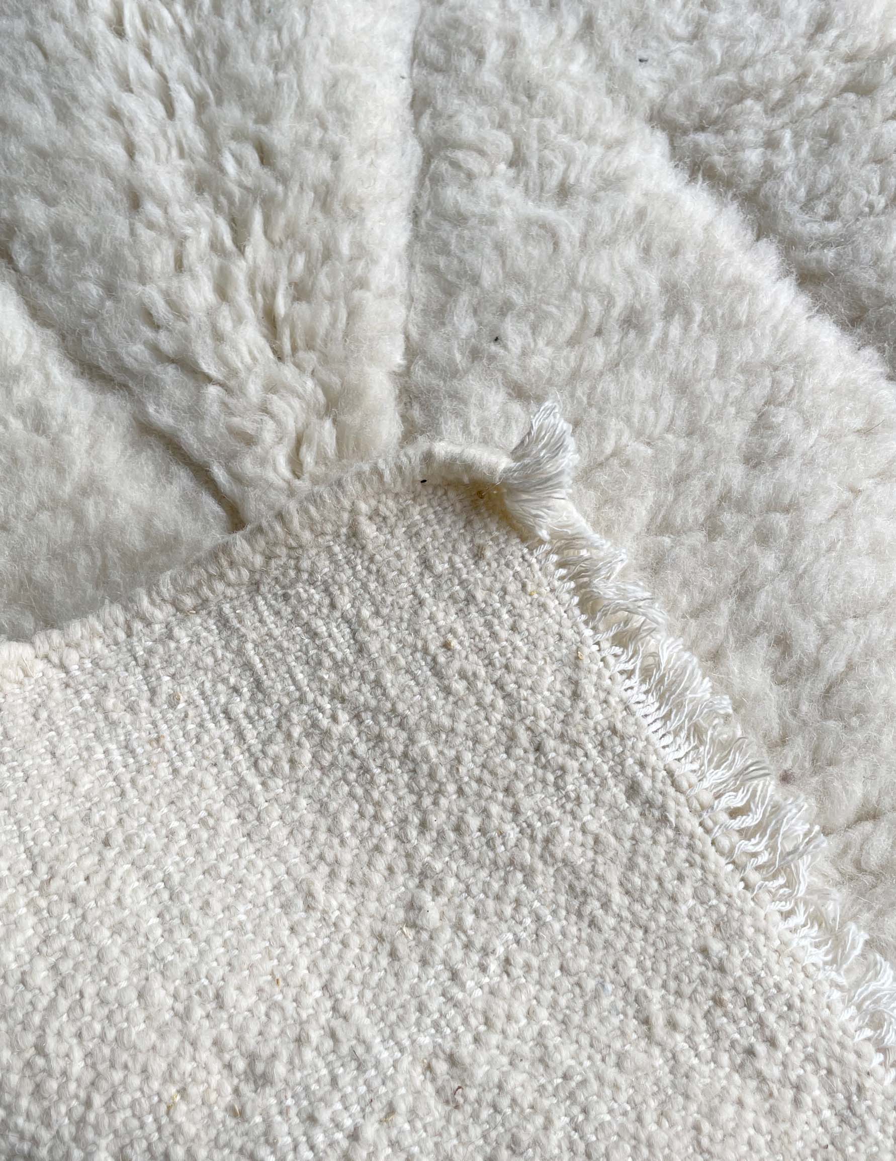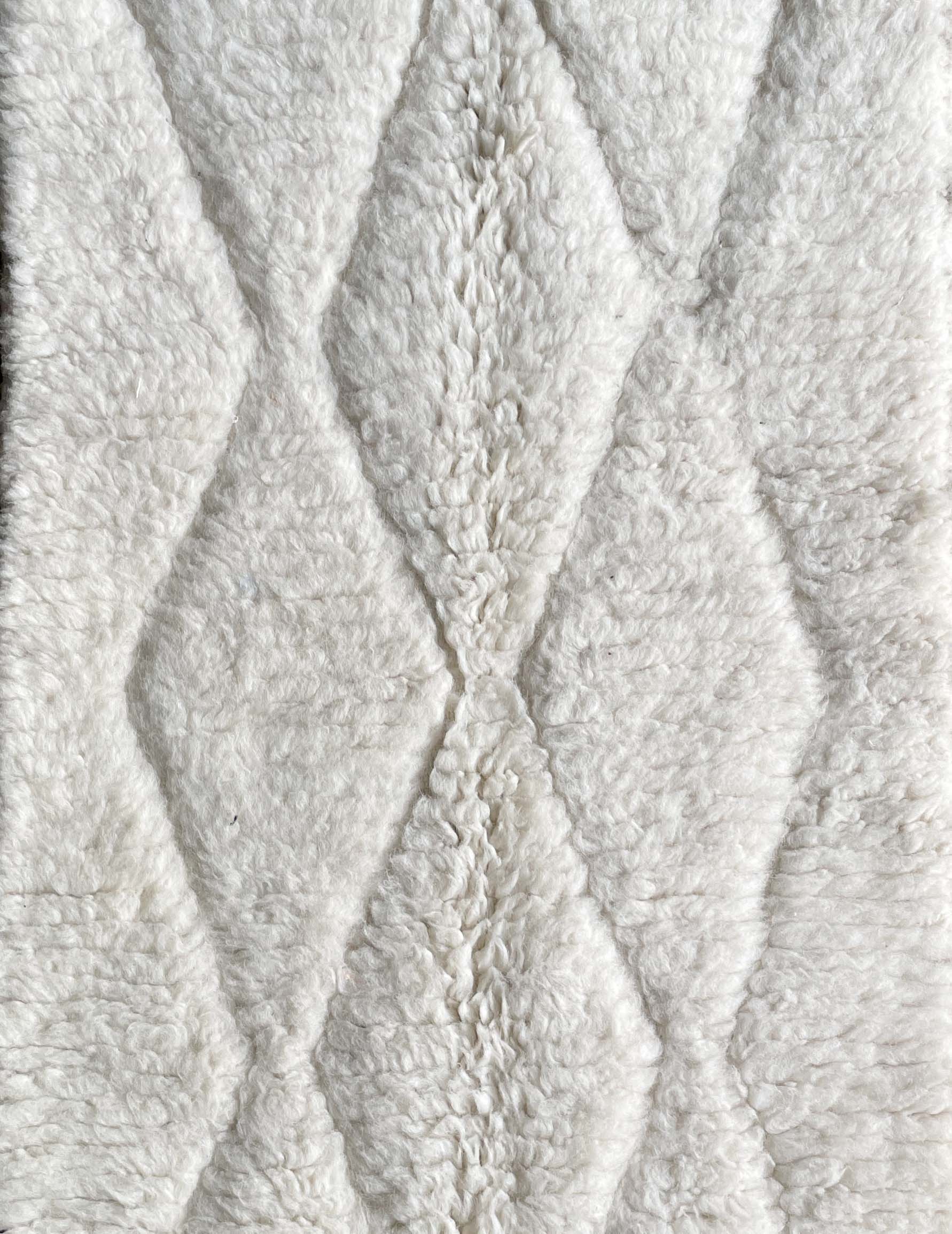 ベニワレンはモロッコのアトラス山脈に住むベルベル人女性によって、一目一目しっかりと結びながら織らているハンドメイドのウールラグです。白を基調とし黒の細いラインで模様が描かれています。触り心地はふわふわと柔らかく長い毛足が特徴です。白を基調としたシンプルなデザインとナチュラルな色合いは、コーディネートの幅も広く他のインテリアとも調和しやすいです。