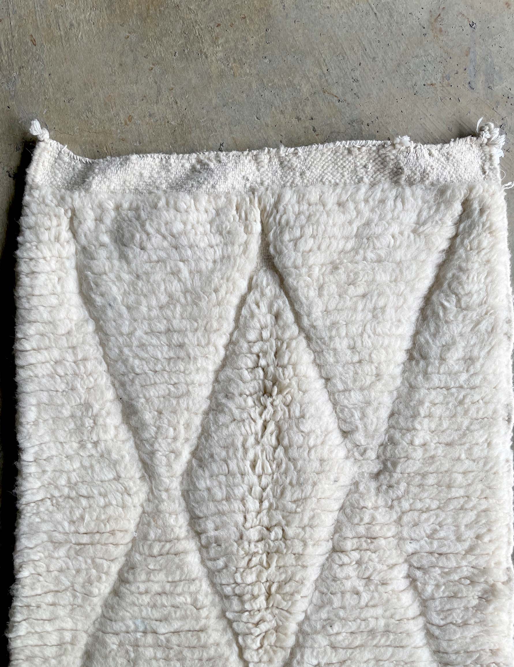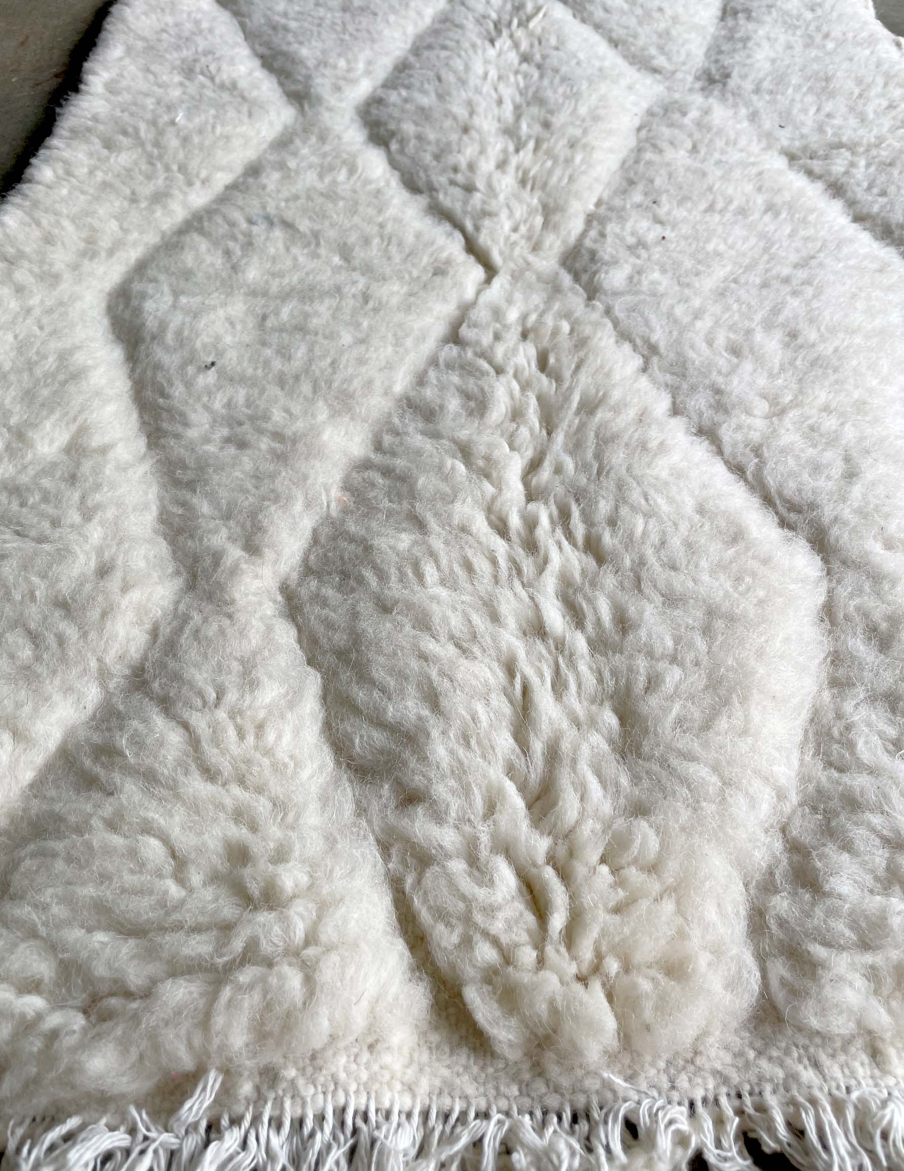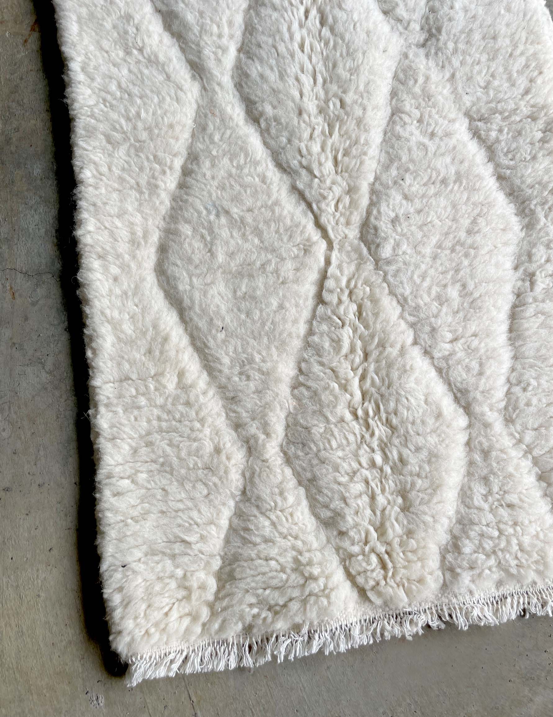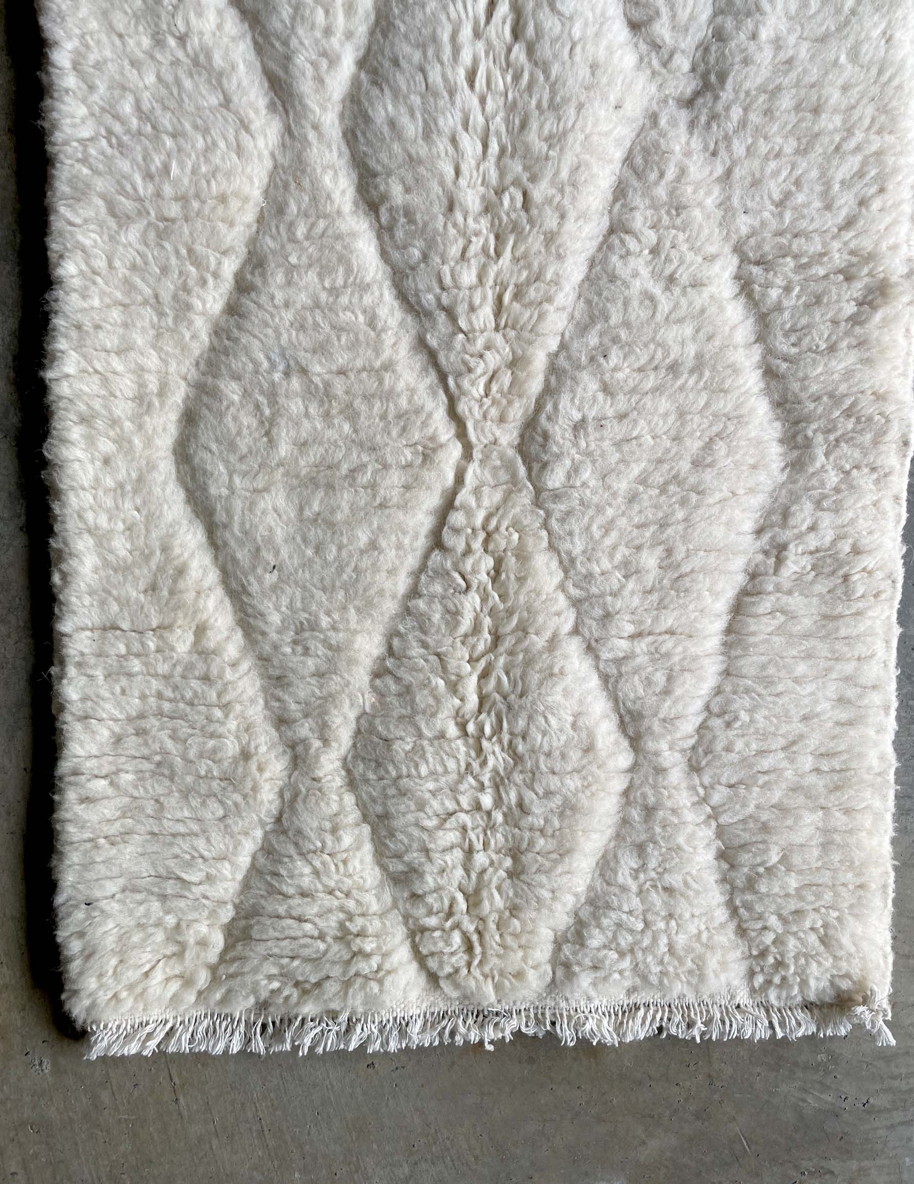 ベニワレンはモロッコのアトラス山脈に住むベルベル人女性によって、一目一目しっかりと結びながら織らているハンドメイドのウールラグです。白を基調とし黒の細いラインで模様が描かれています。触り心地はふわふわと柔らかく長い毛足が特徴です。白を基調としたシンプルなデザインとナチュラルな色合いは、コーディネートの幅も広く他のインテリアとも調和しやすいです。