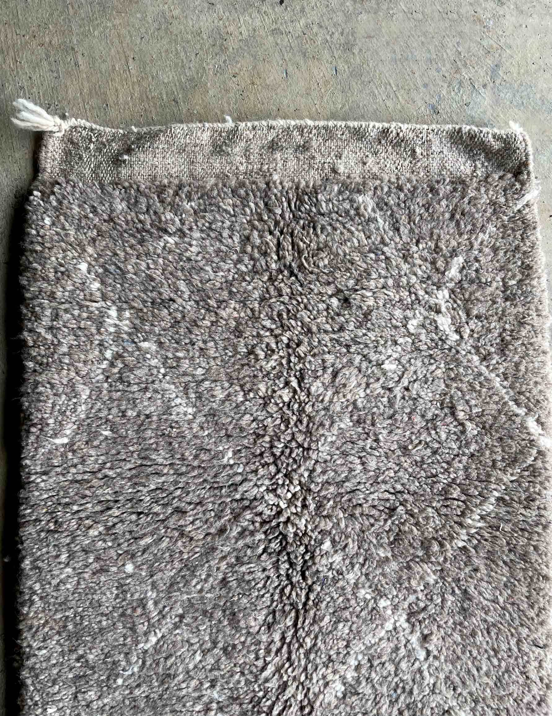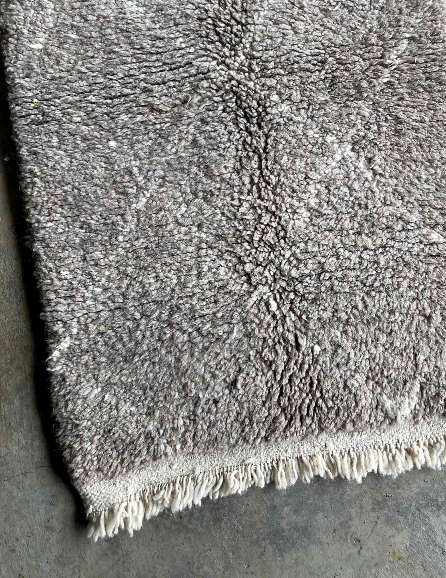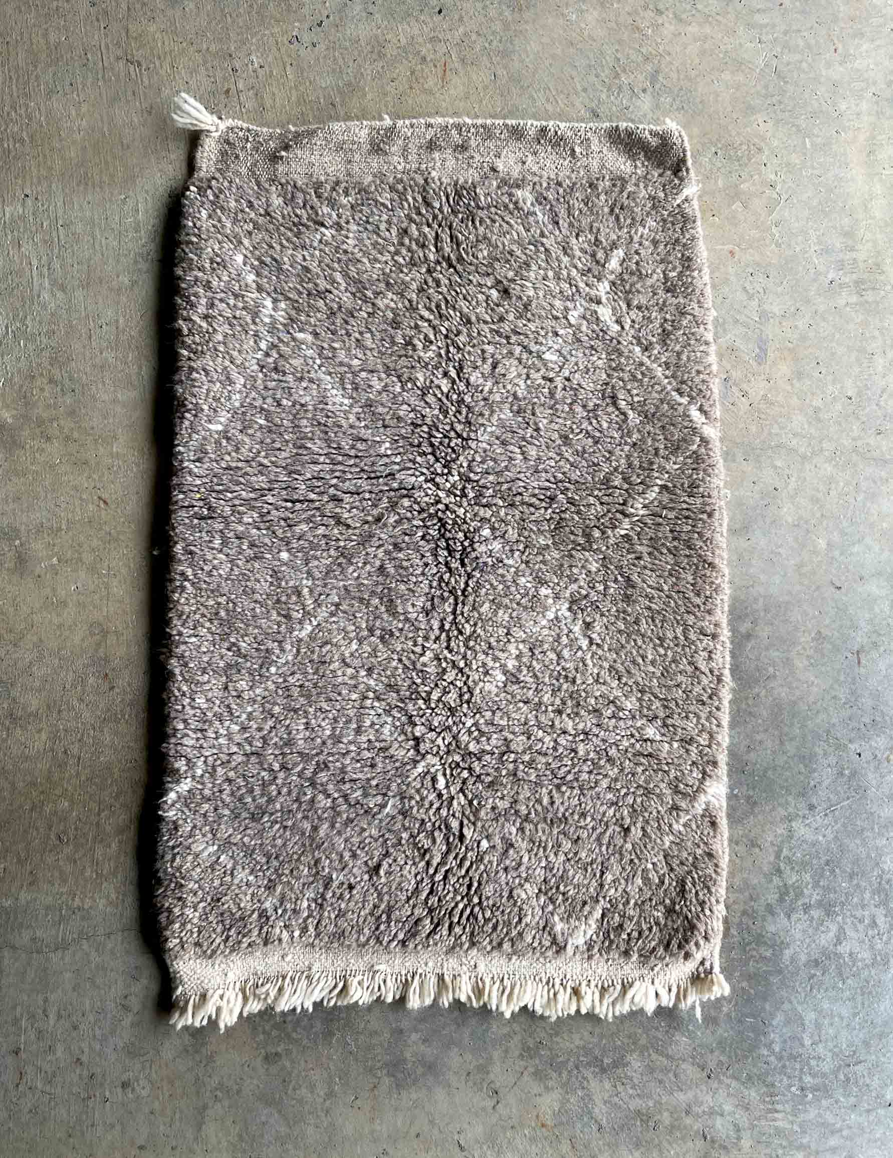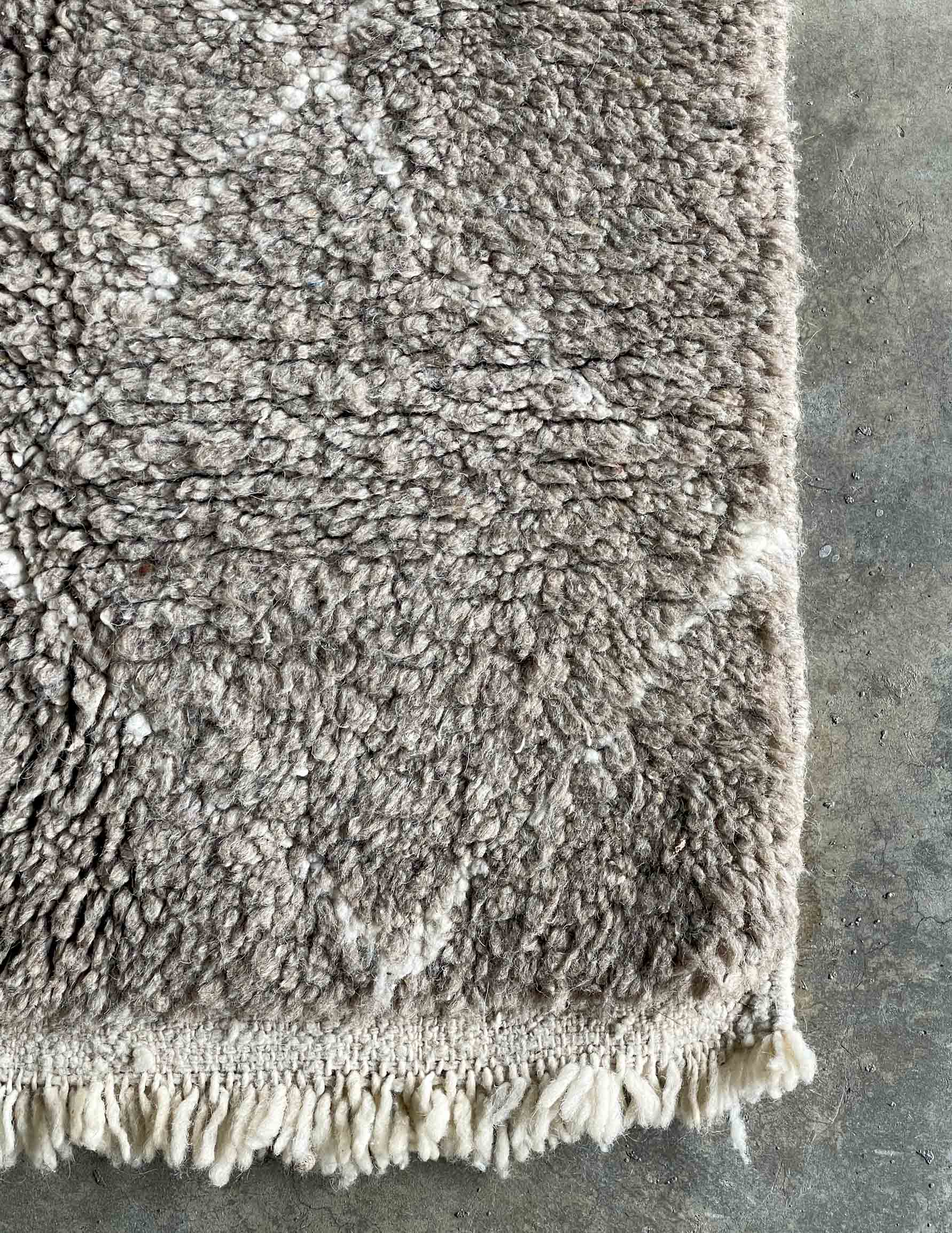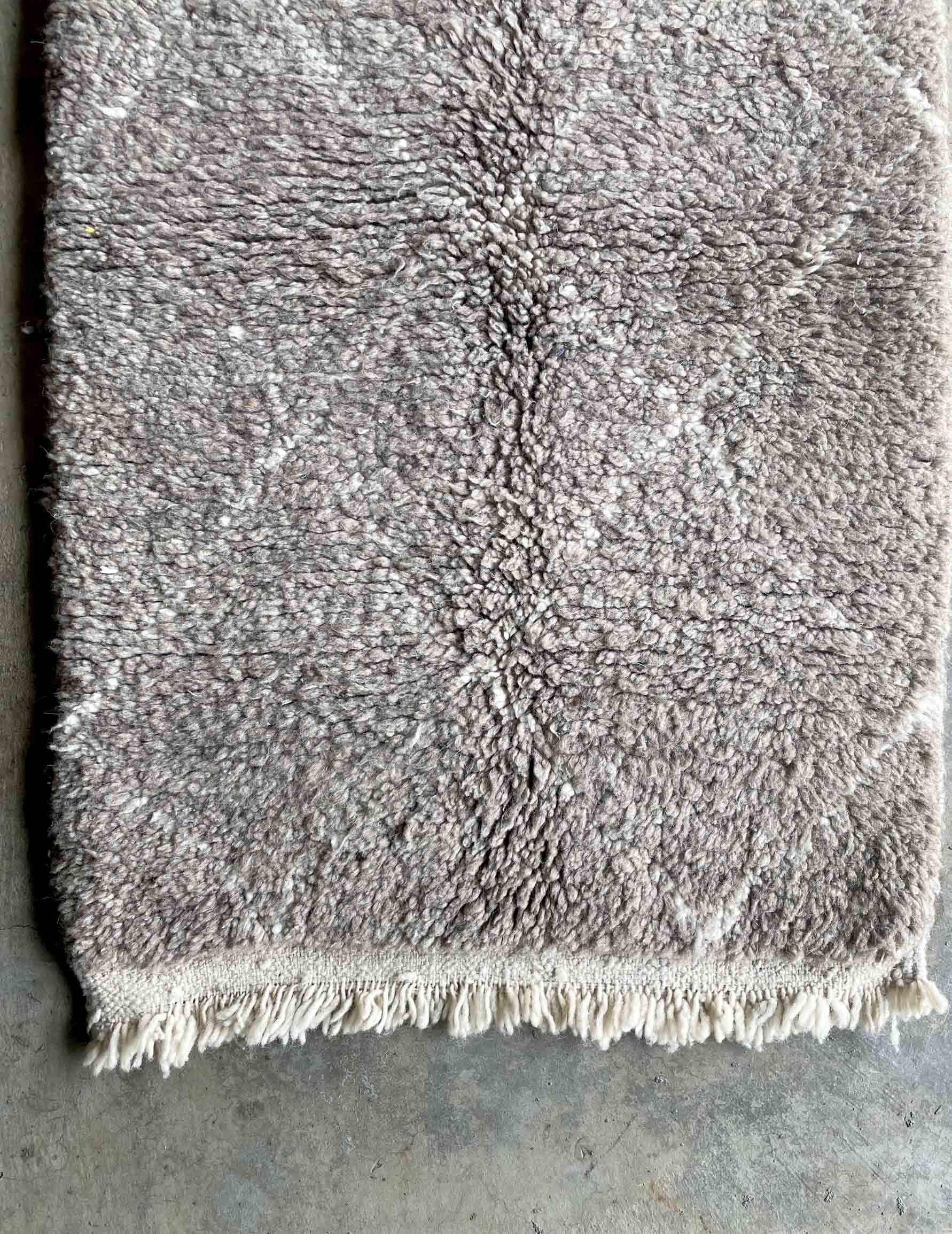 ベニワレンはモロッコのアトラス山脈に住むベルベル人女性によって、一目一目しっかりと結びながら織らているハンドメイドのウールラグです。白を基調とし黒の細いラインで模様が描かれています。触り心地はふわふわと柔らかく長い毛足が特徴です。白を基調としたシンプルなデザインとナチュラルな色合いは、コーディネートの幅も広く他のインテリアとも調和しやすいです。