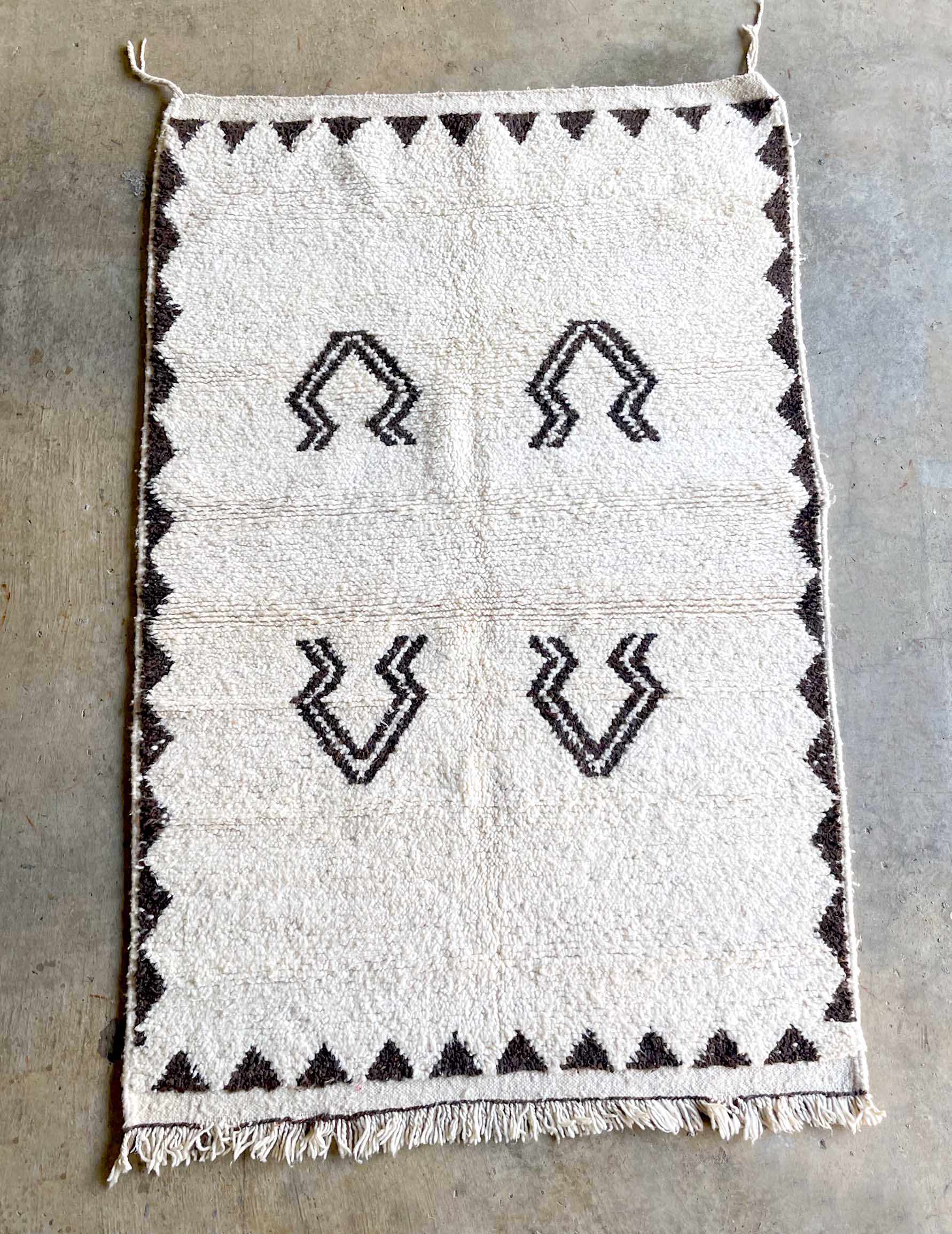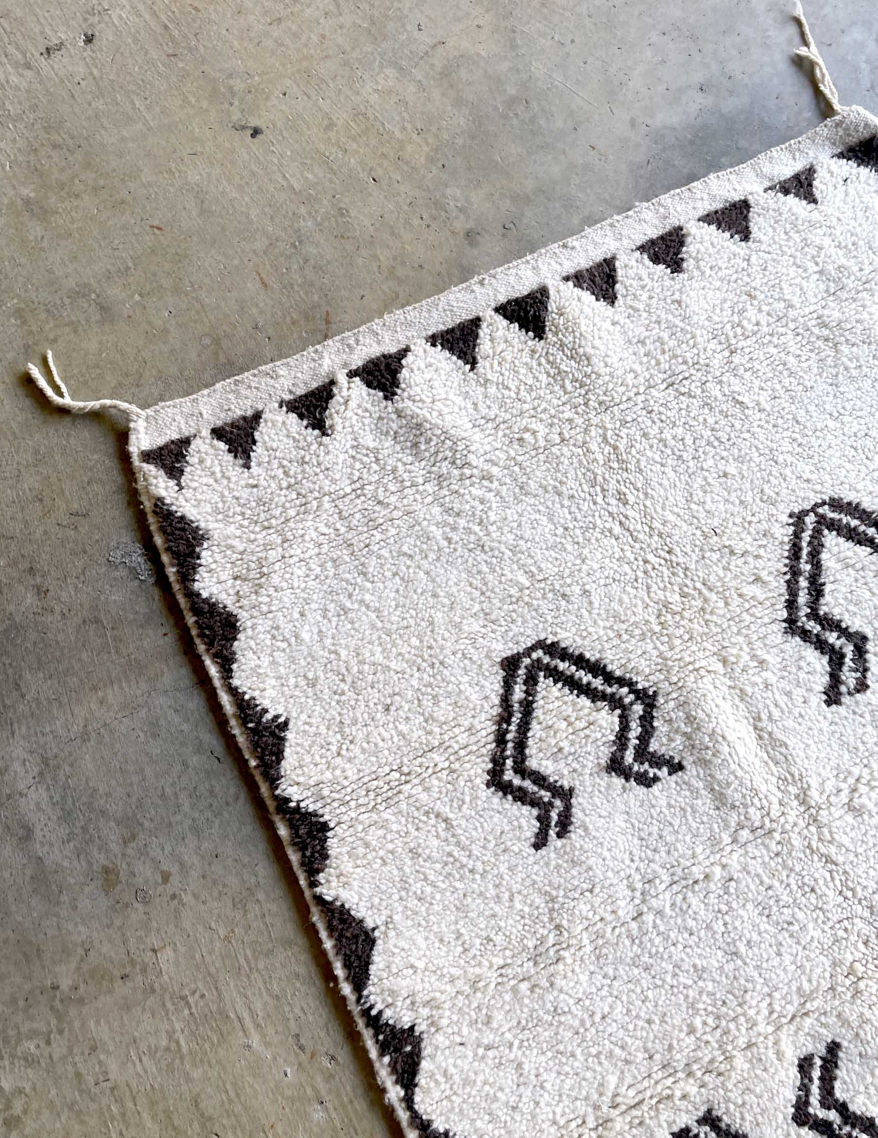 ベニワレンはモロッコのアトラス山脈に住むベルベル人女性によって、一目一目しっかりと結びながら織らているハンドメイドのウールラグです。白を基調とし黒の細いラインで模様が描かれています。触り心地はふわふわと柔らかく長い毛足が特徴です。白を基調としたシンプルなデザインとナチュラルな色合いは、コーディネートの幅も広く他のインテリアとも調和しやすいです。