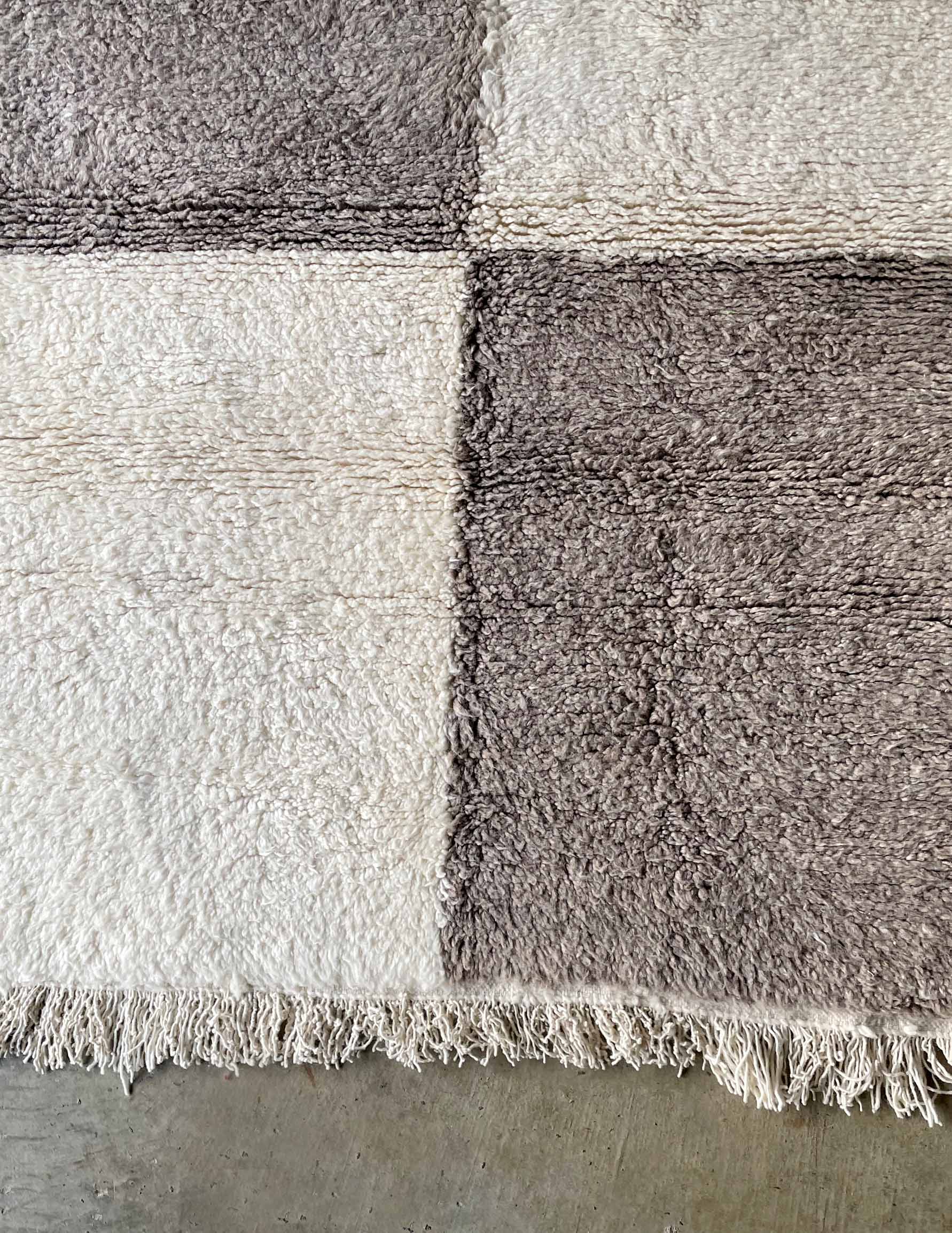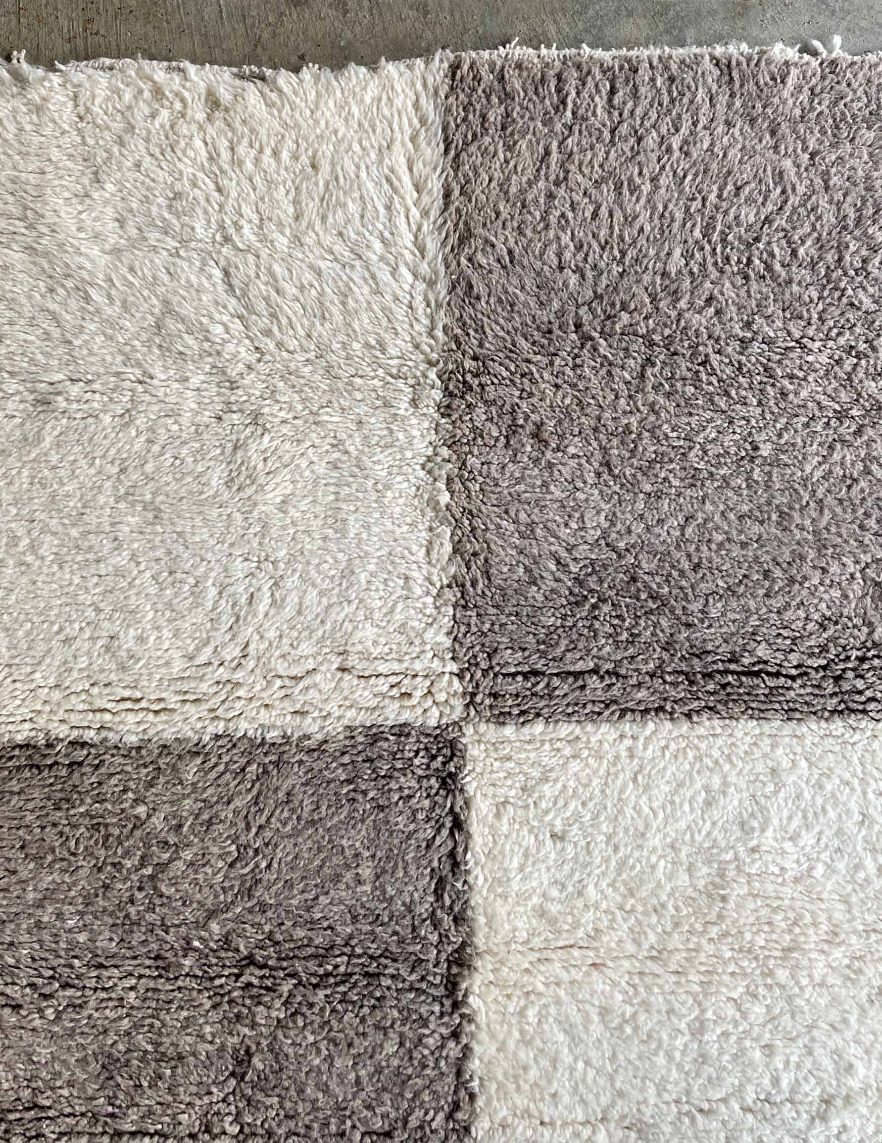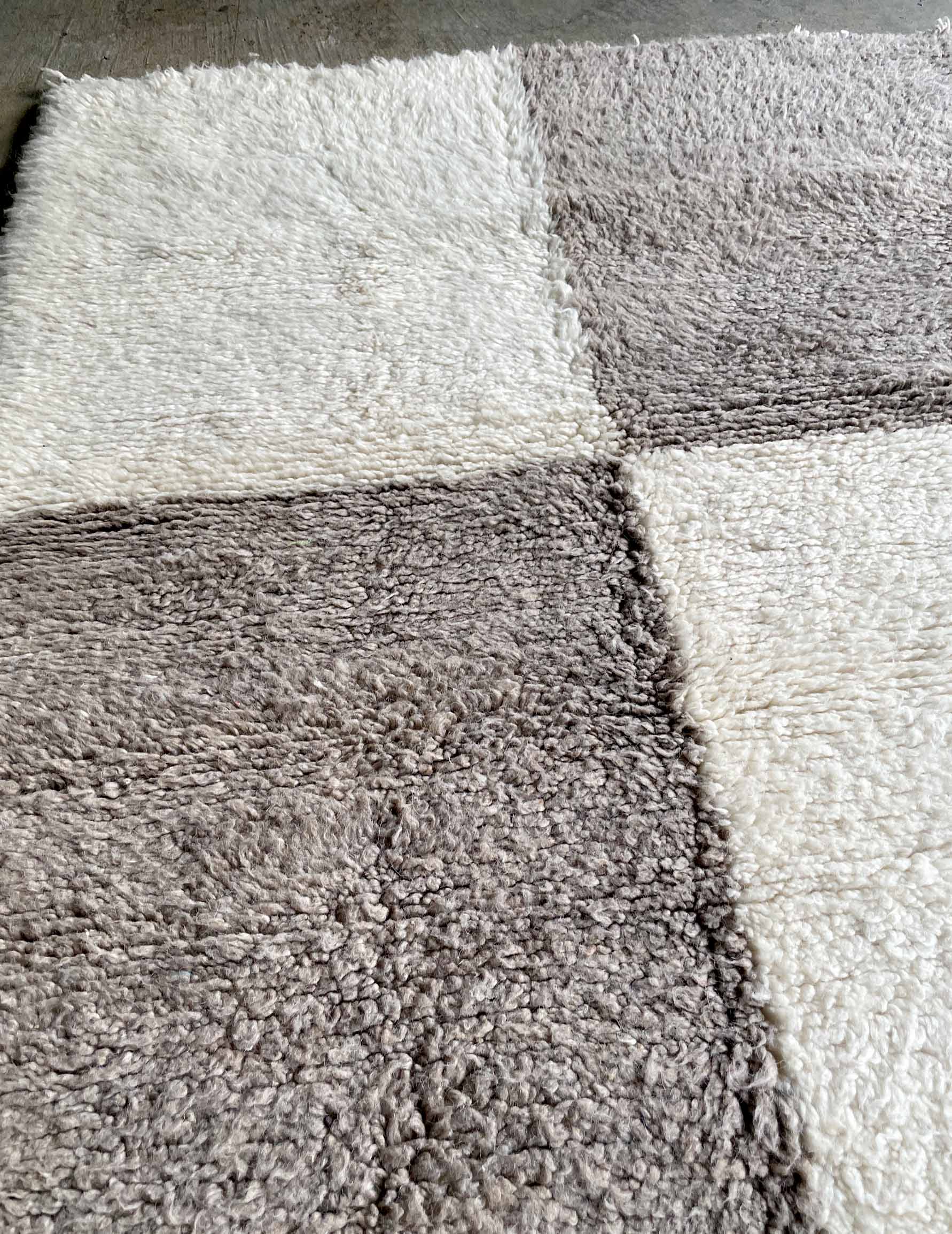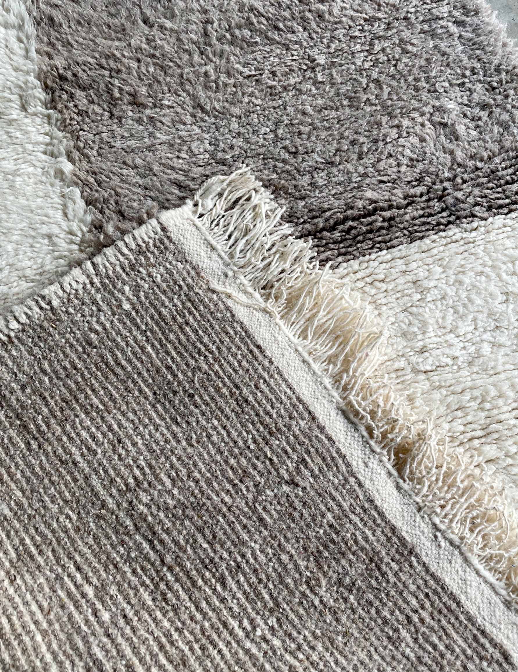 ベニワレンはモロッコのアトラス山脈に住むベルベル人女性によって、一目一目しっかりと結びながら織らているハンドメイドのウールラグです。白を基調とし黒の細いラインで模様が描かれています。触り心地はふわふわと柔らかく長い毛足が特徴です。白を基調としたシンプルなデザインとナチュラルな色合いは、コーディネートの幅も広く他のインテリアとも調和しやすいです。