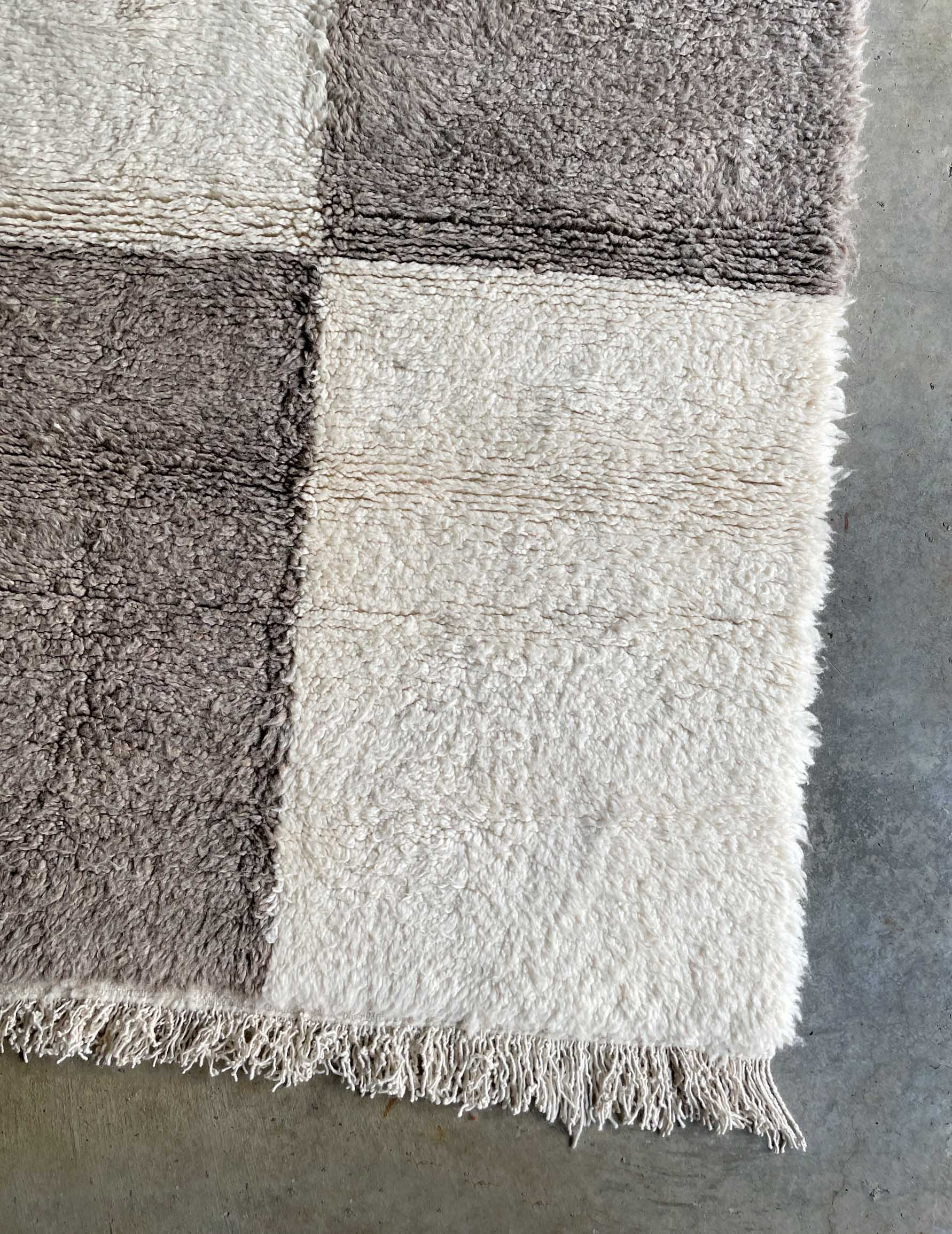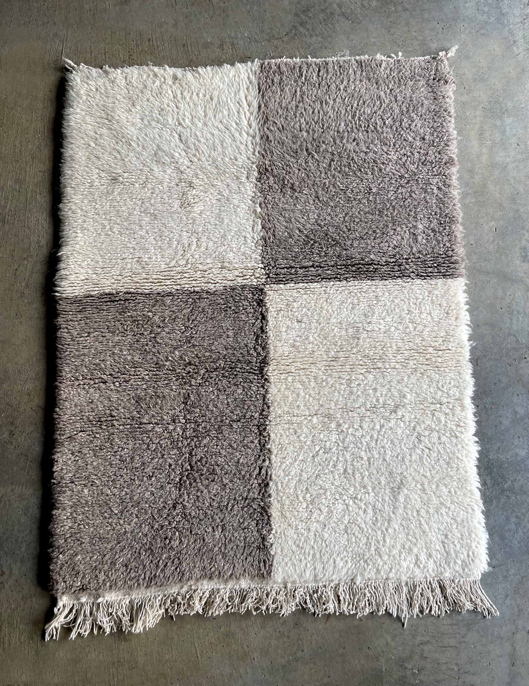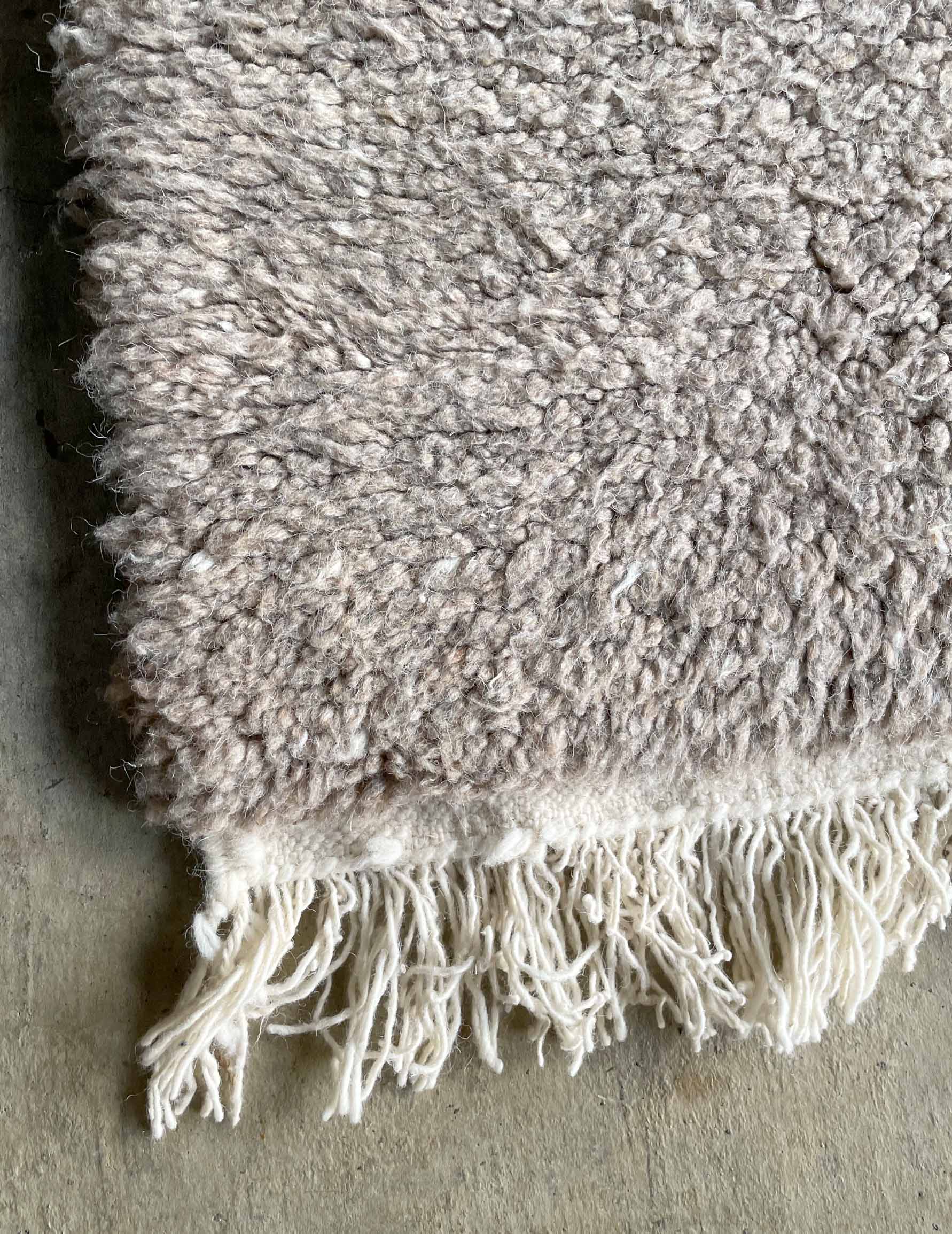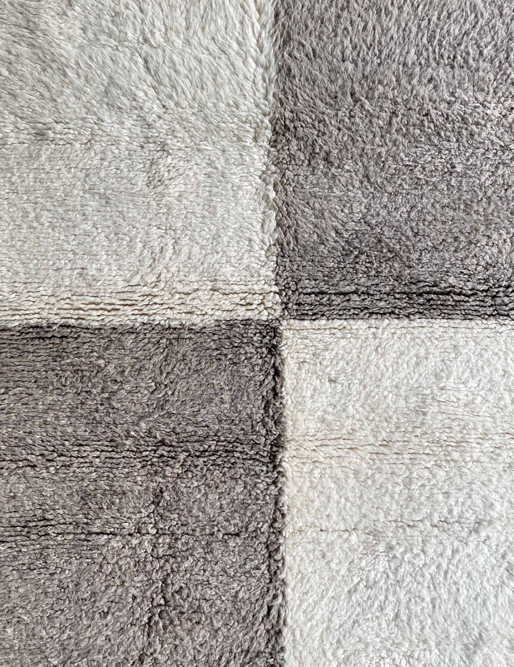 ベニワレンはモロッコのアトラス山脈に住むベルベル人女性によって、一目一目しっかりと結びながら織らているハンドメイドのウールラグです。白を基調とし黒の細いラインで模様が描かれています。触り心地はふわふわと柔らかく長い毛足が特徴です。白を基調としたシンプルなデザインとナチュラルな色合いは、コーディネートの幅も広く他のインテリアとも調和しやすいです。