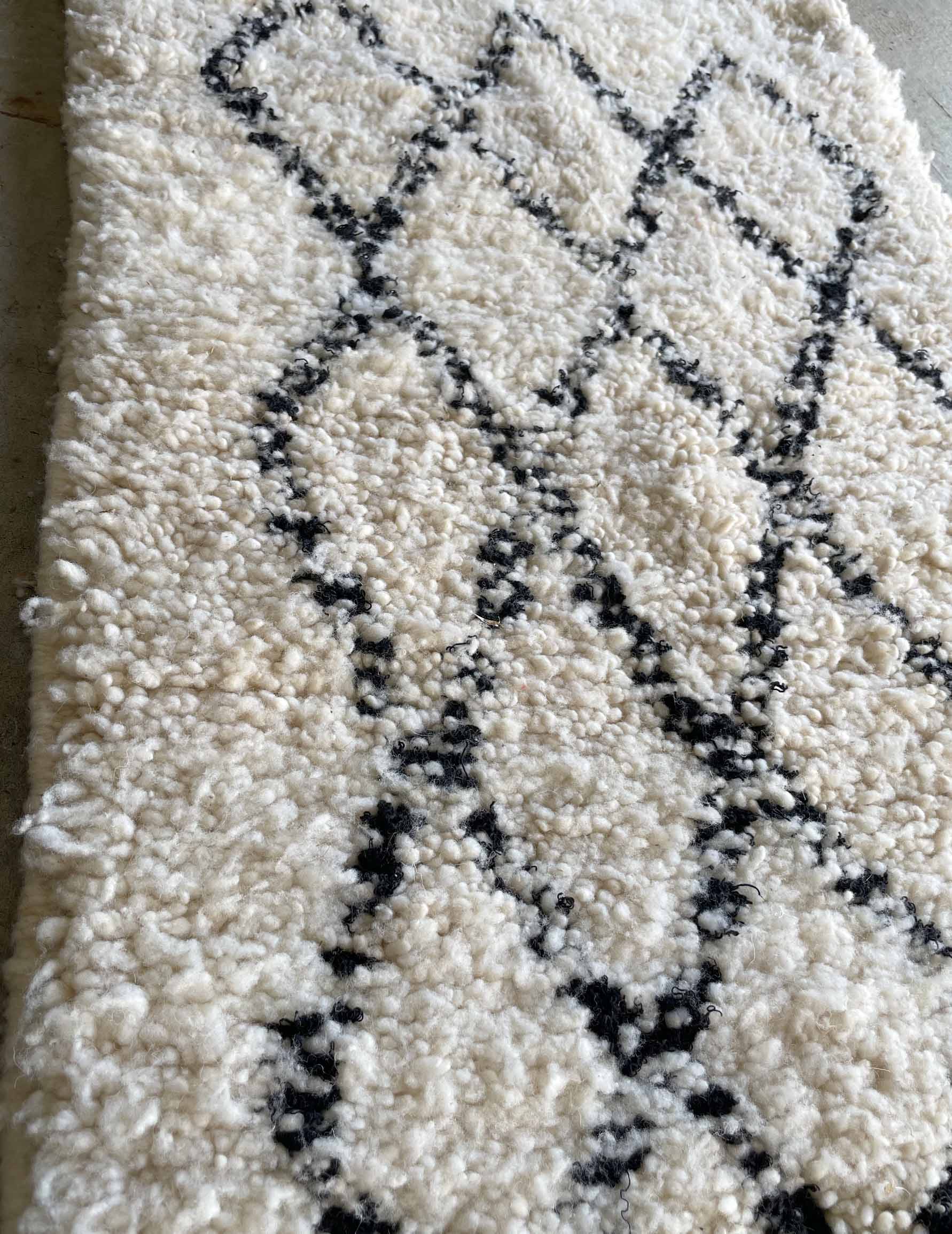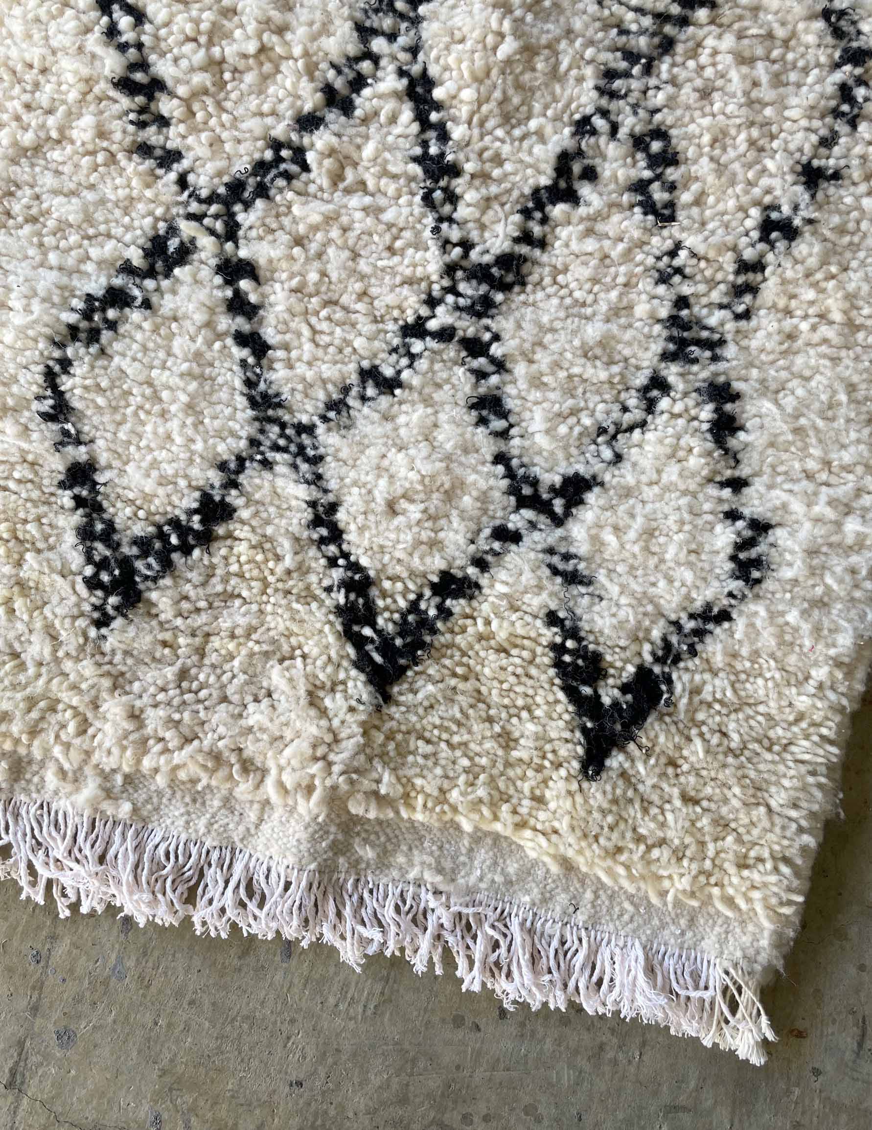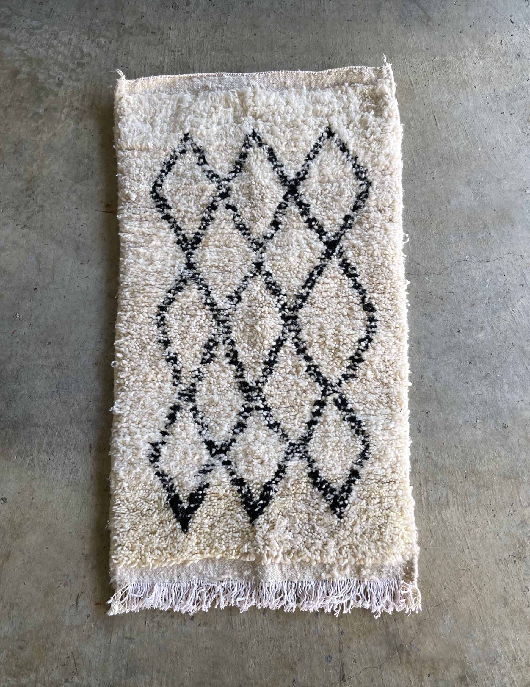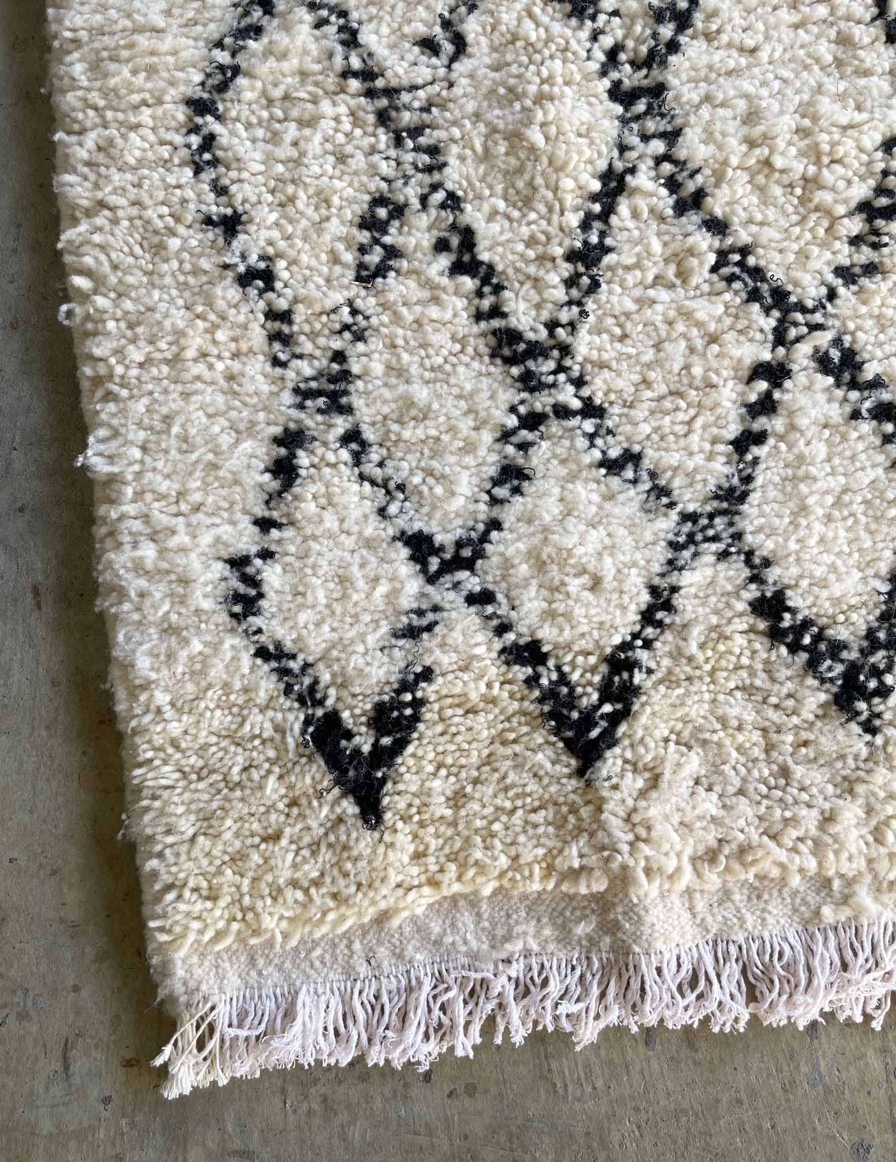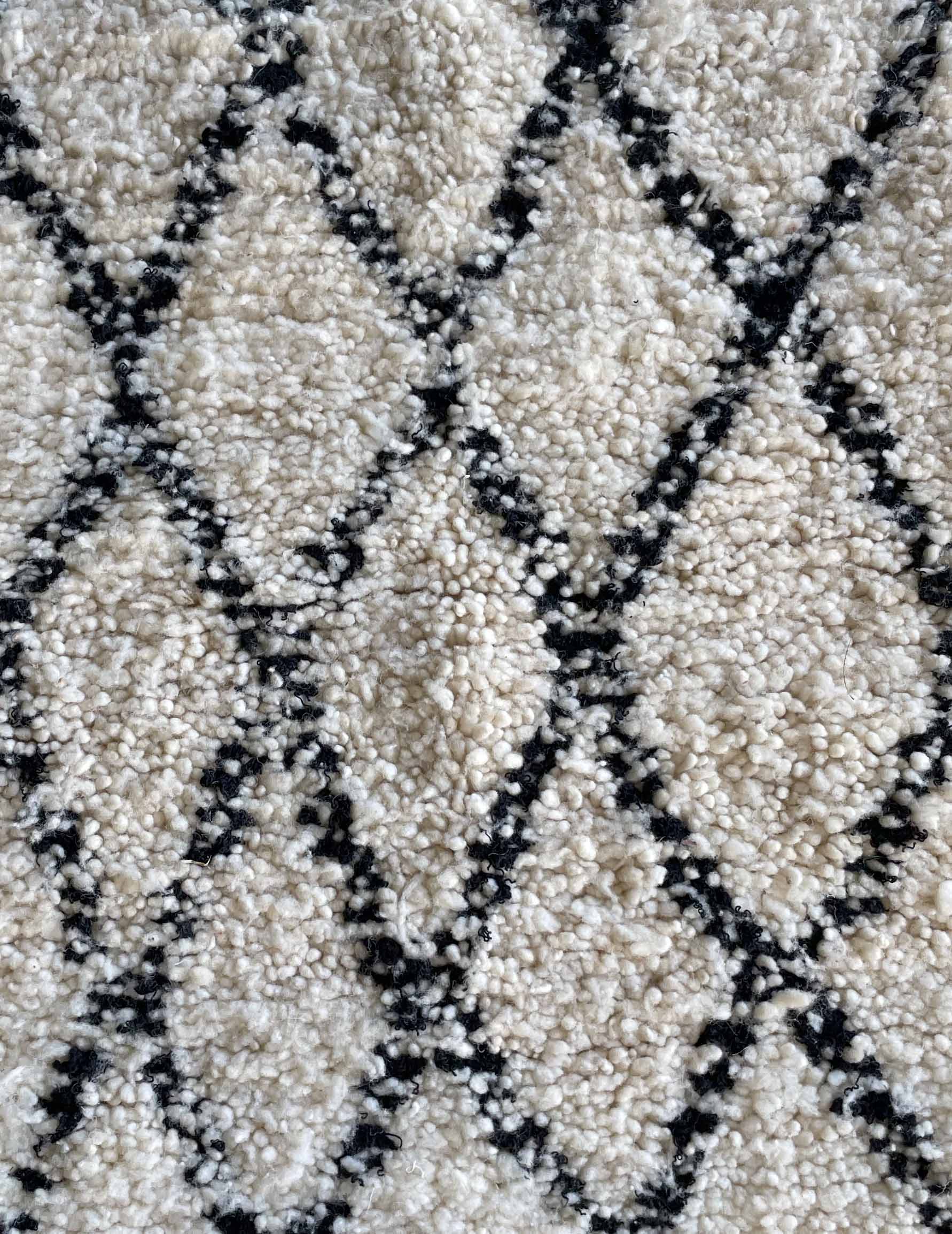 ベニワレンはモロッコのアトラス山脈に住むベルベル人女性によって、一目一目しっかりと結びながら織らているハンドメイドのウールラグです。白を基調とし黒の細いラインで模様が描かれています。触り心地はふわふわと柔らかく長い毛足が特徴です。白を基調としたシンプルなデザインとナチュラルな色合いは、コーディネートの幅も広く他のインテリアとも調和しやすいです。