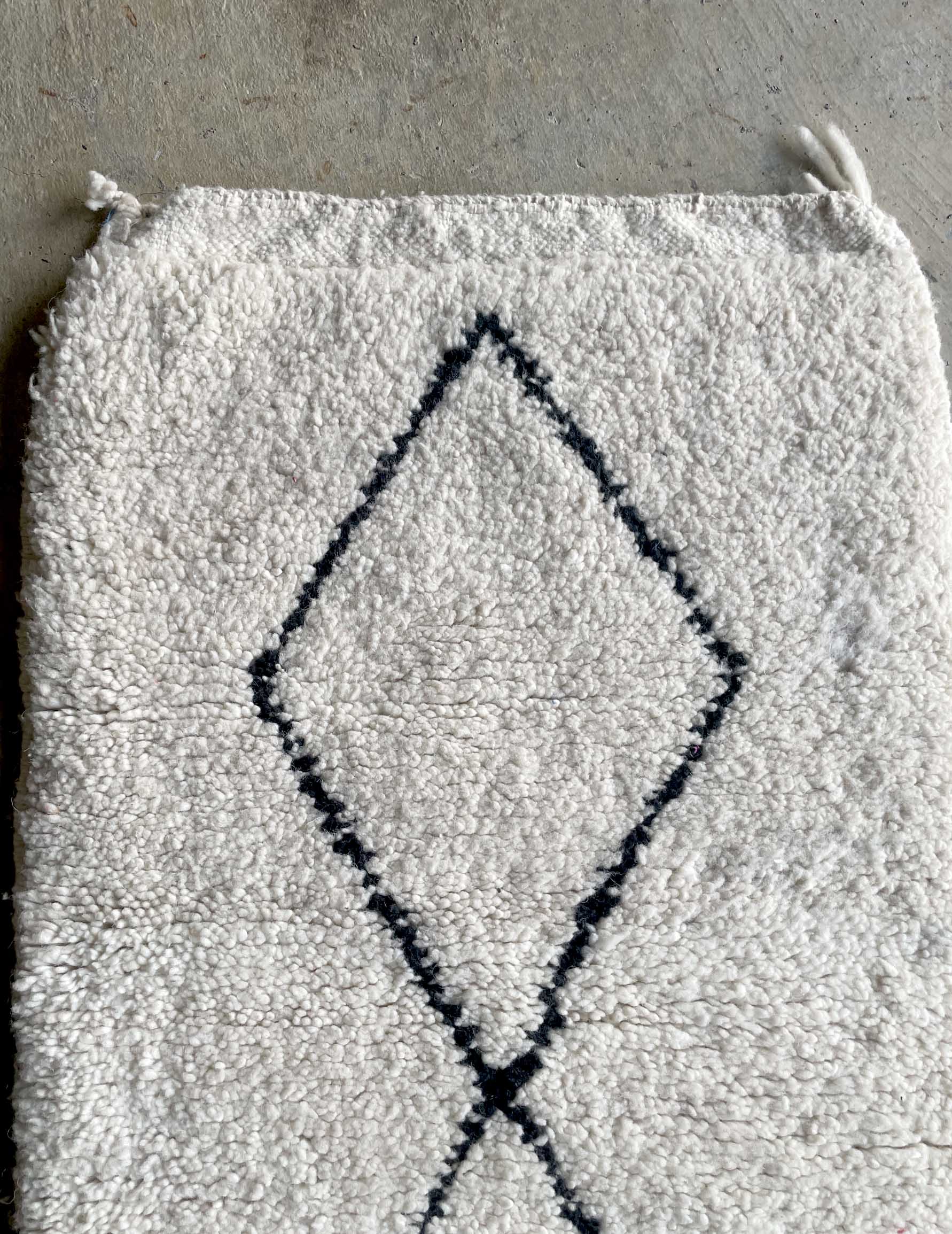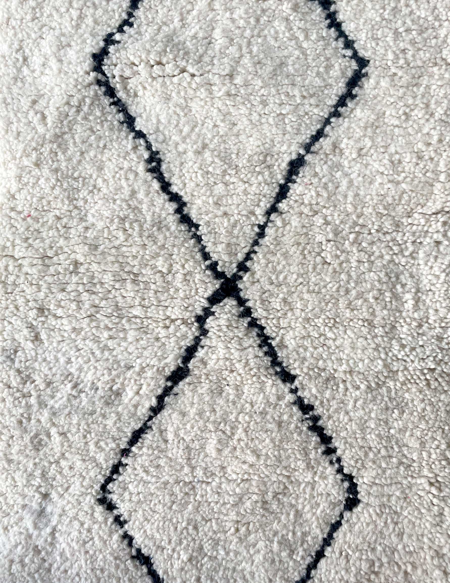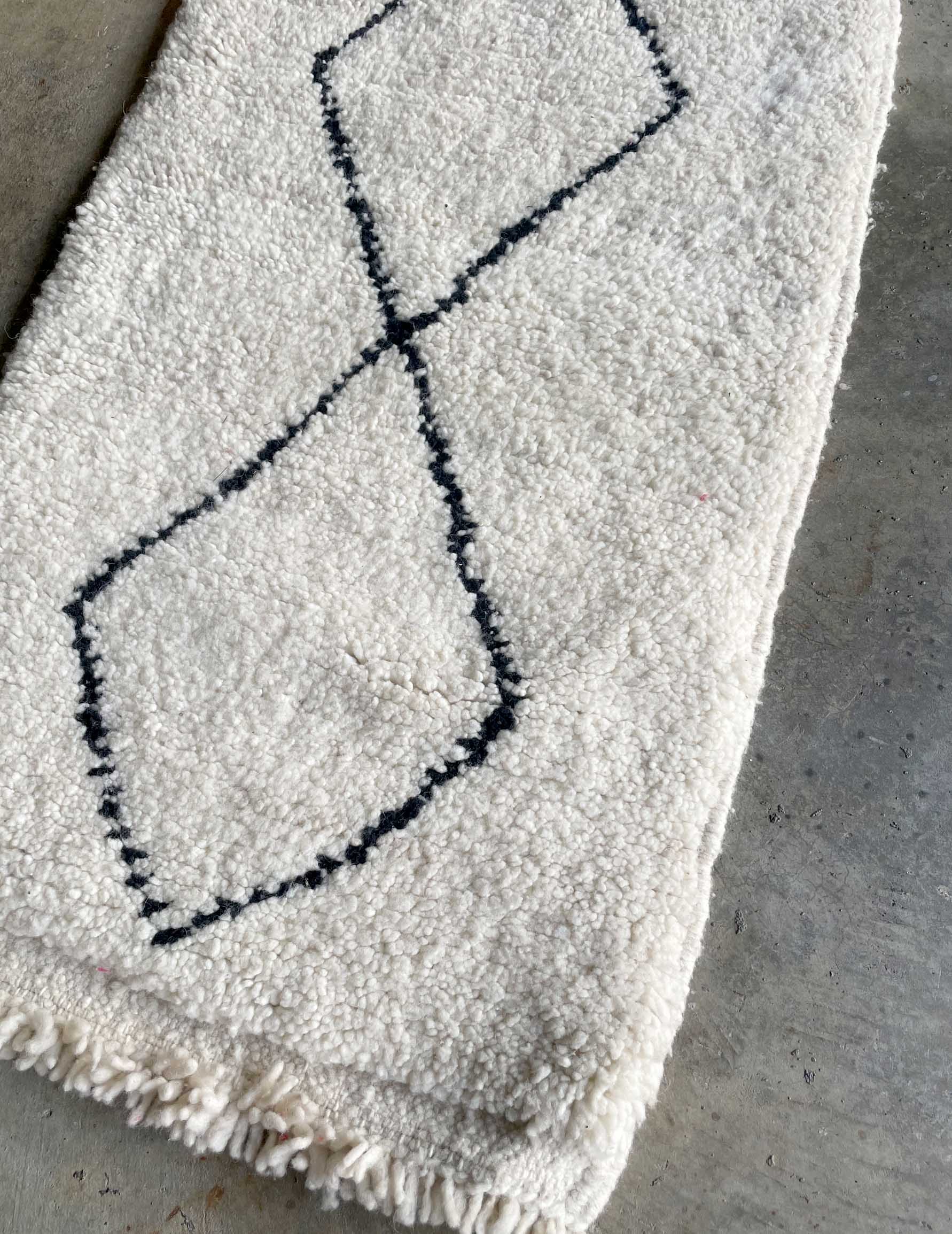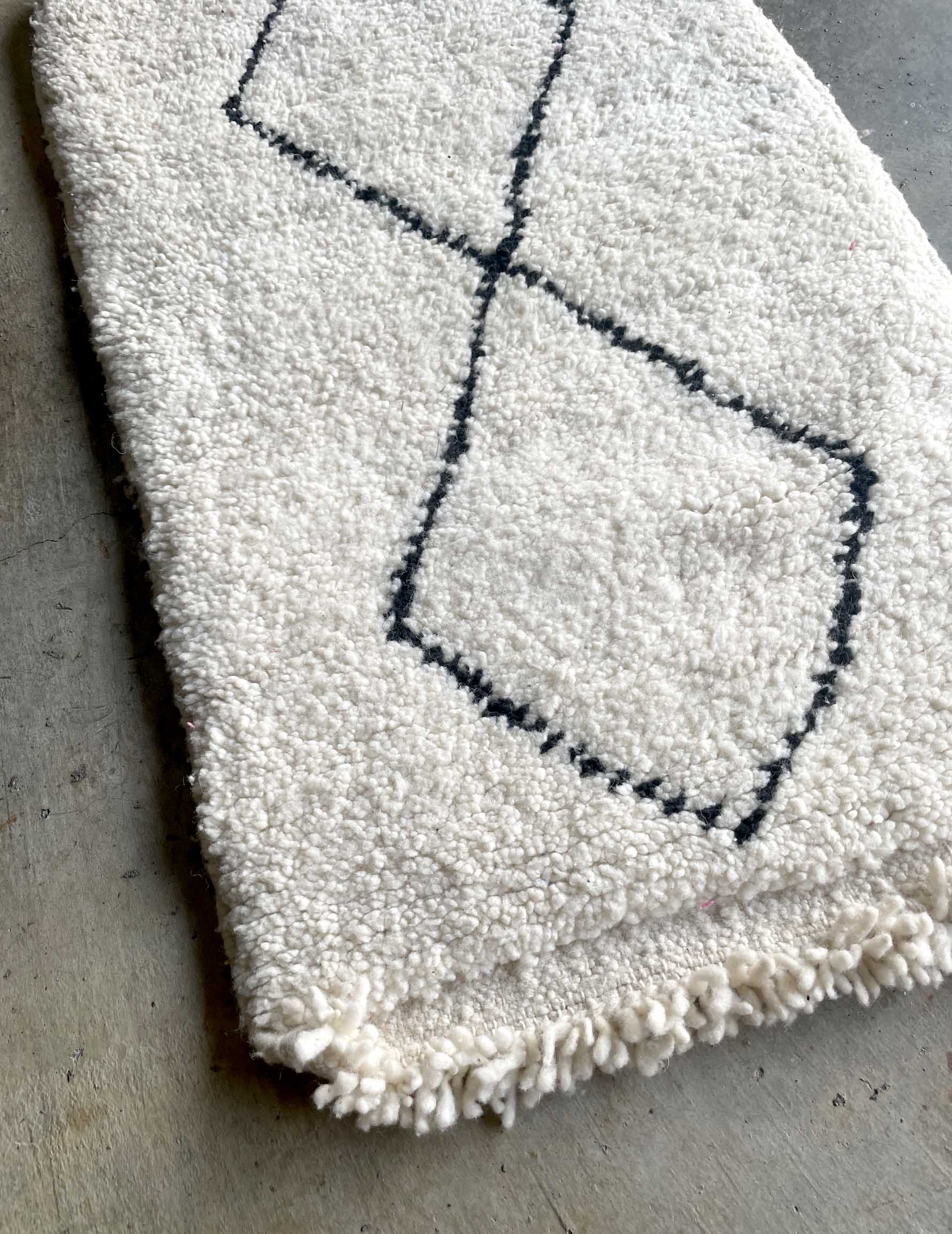 ベニワレンはモロッコのアトラス山脈に住むベルベル人女性によって、一目一目しっかりと結びながら織らているハンドメイドのウールラグです。白を基調とし黒の細いラインで模様が描かれています。触り心地はふわふわと柔らかく長い毛足が特徴です。白を基調としたシンプルなデザインとナチュラルな色合いは、コーディネートの幅も広く他のインテリアとも調和しやすいです。