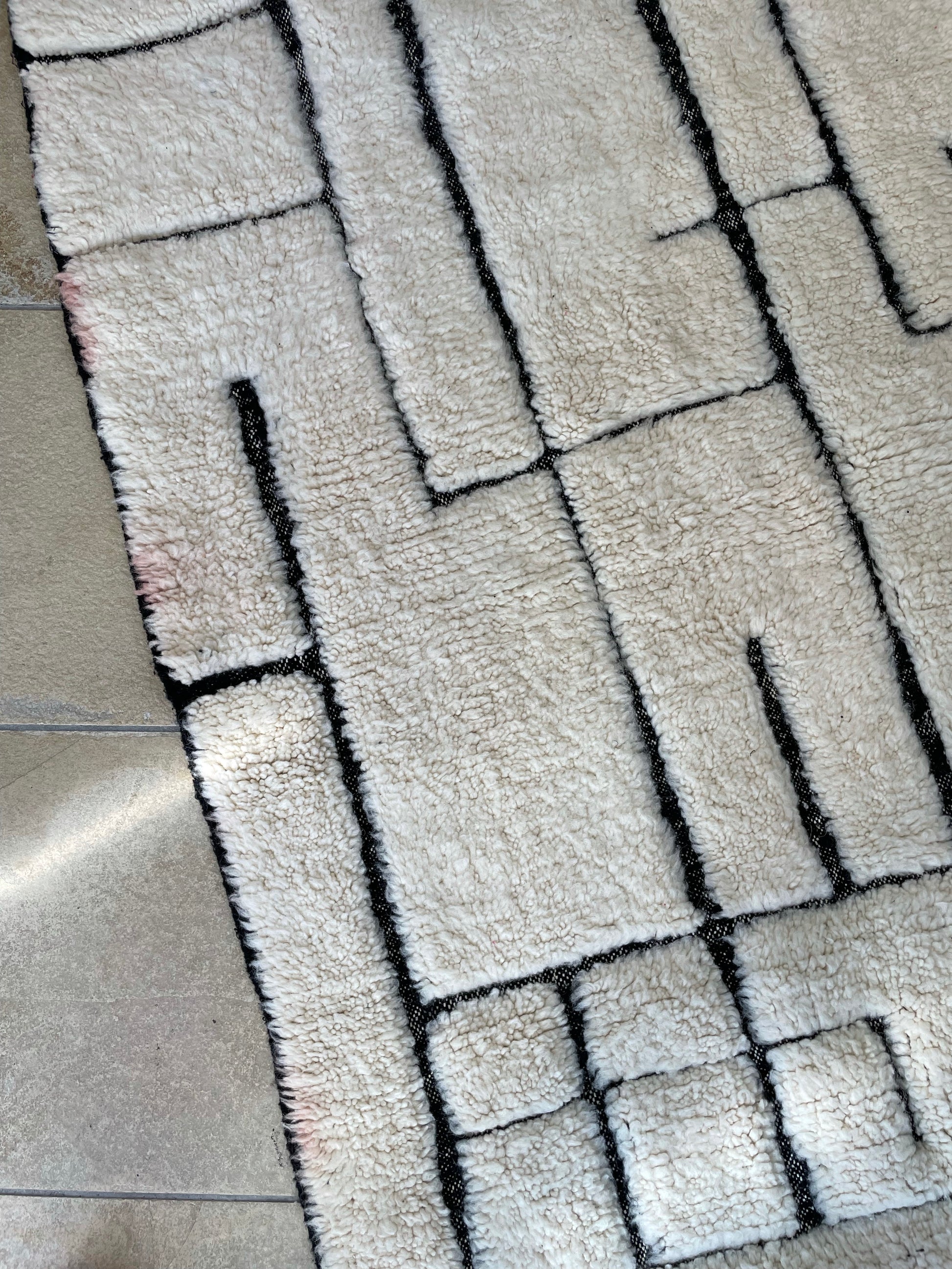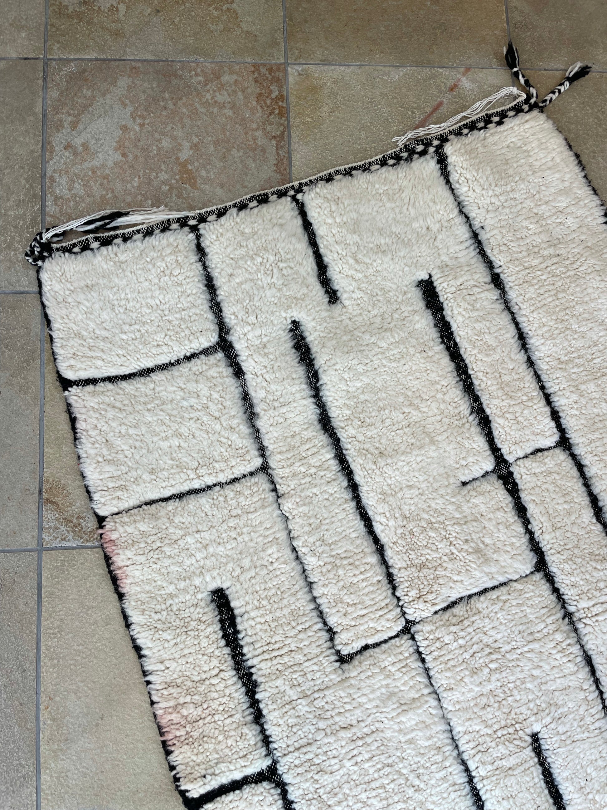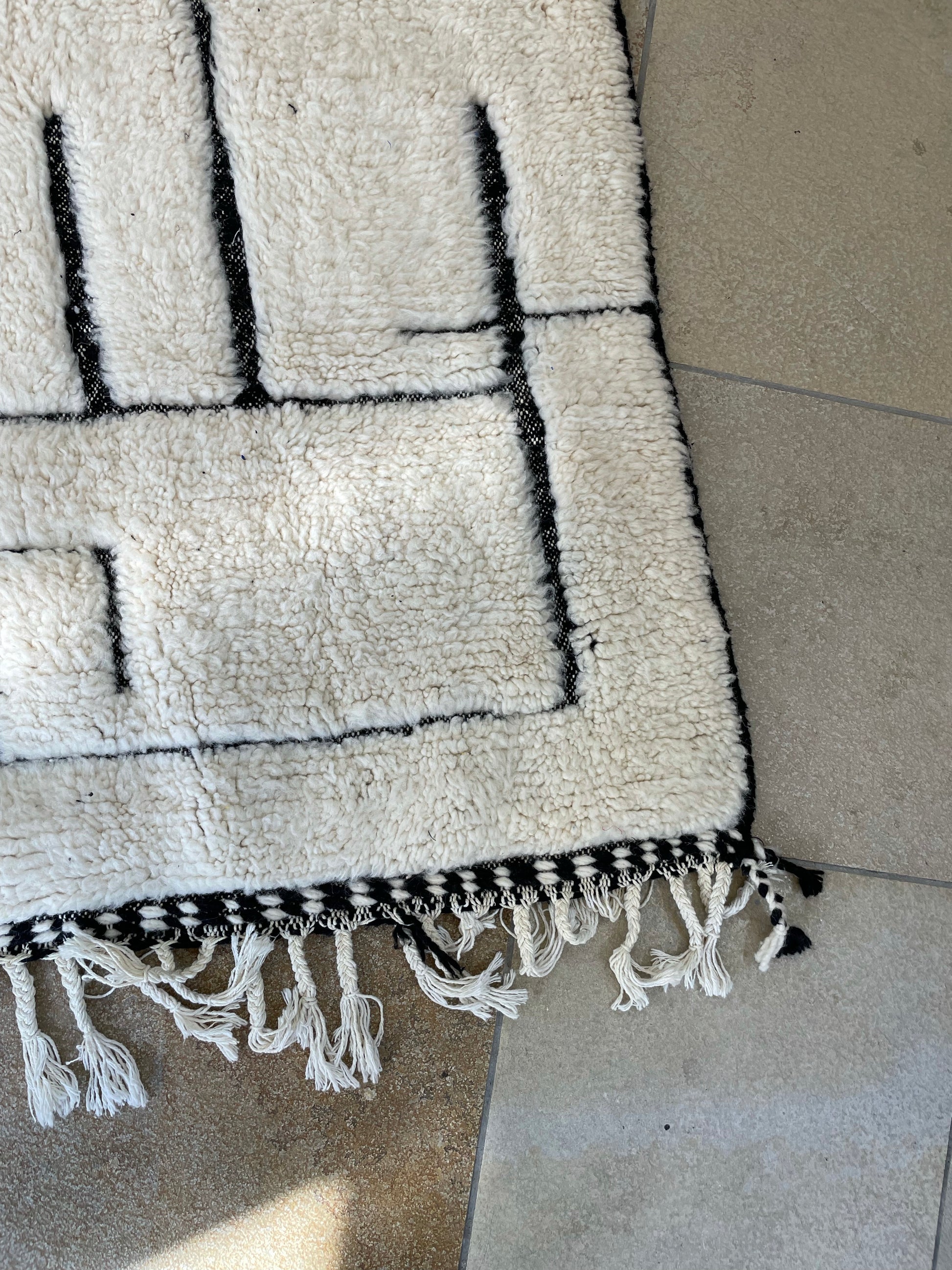 ベニワレンはモロッコのアトラス山脈に住むベルベル人女性によって、一目一目しっかりと結びながら織らているハンドメイドのウールラグです。白を基調とし黒の細いラインで模様が描かれています。触り心地はふわふわと柔らかく長い毛足が特徴です。白を基調としたシンプルなデザインとナチュラルな色合いは、コーディネートの幅も広く他のインテリアとも調和しやすいです。