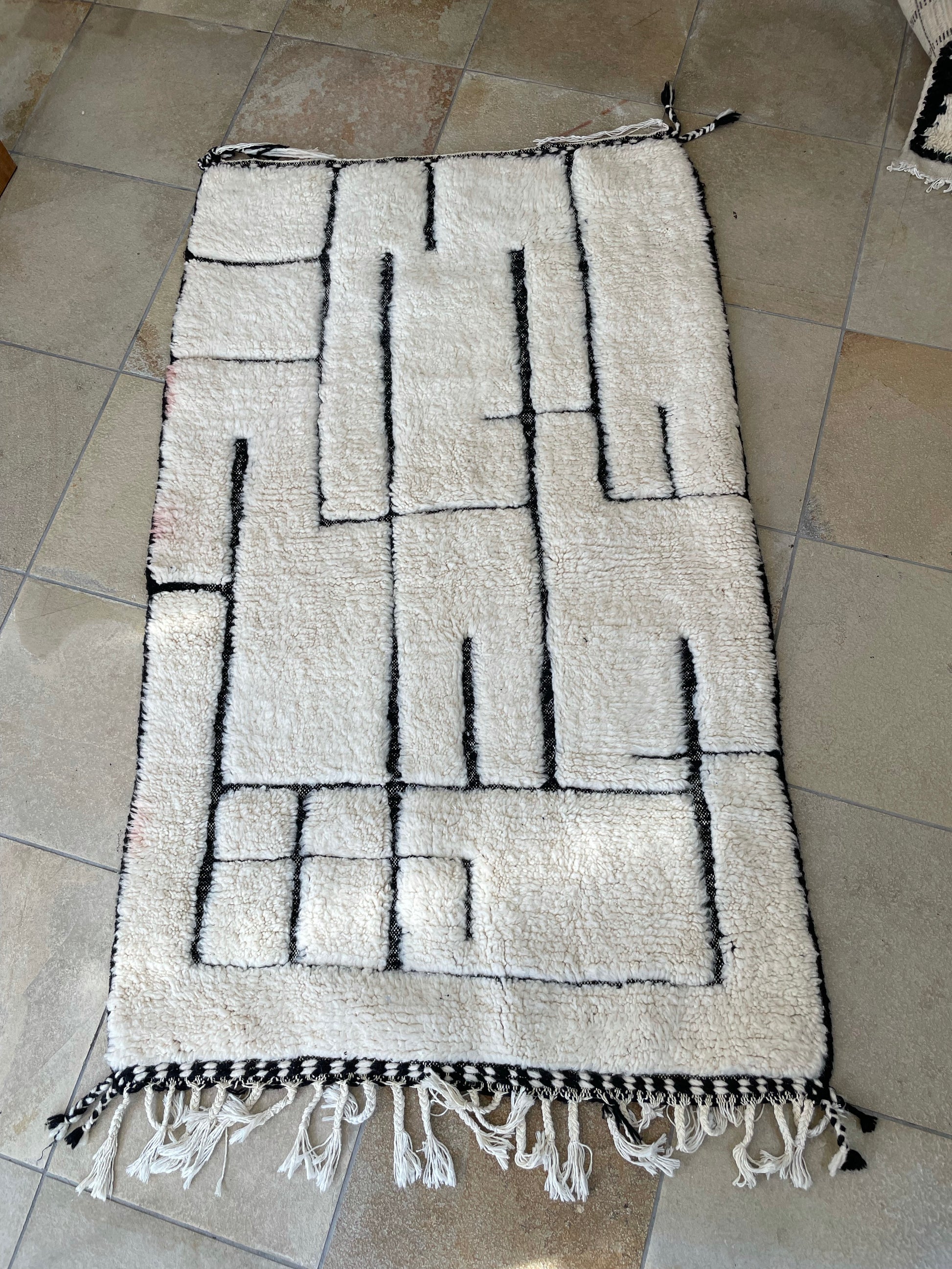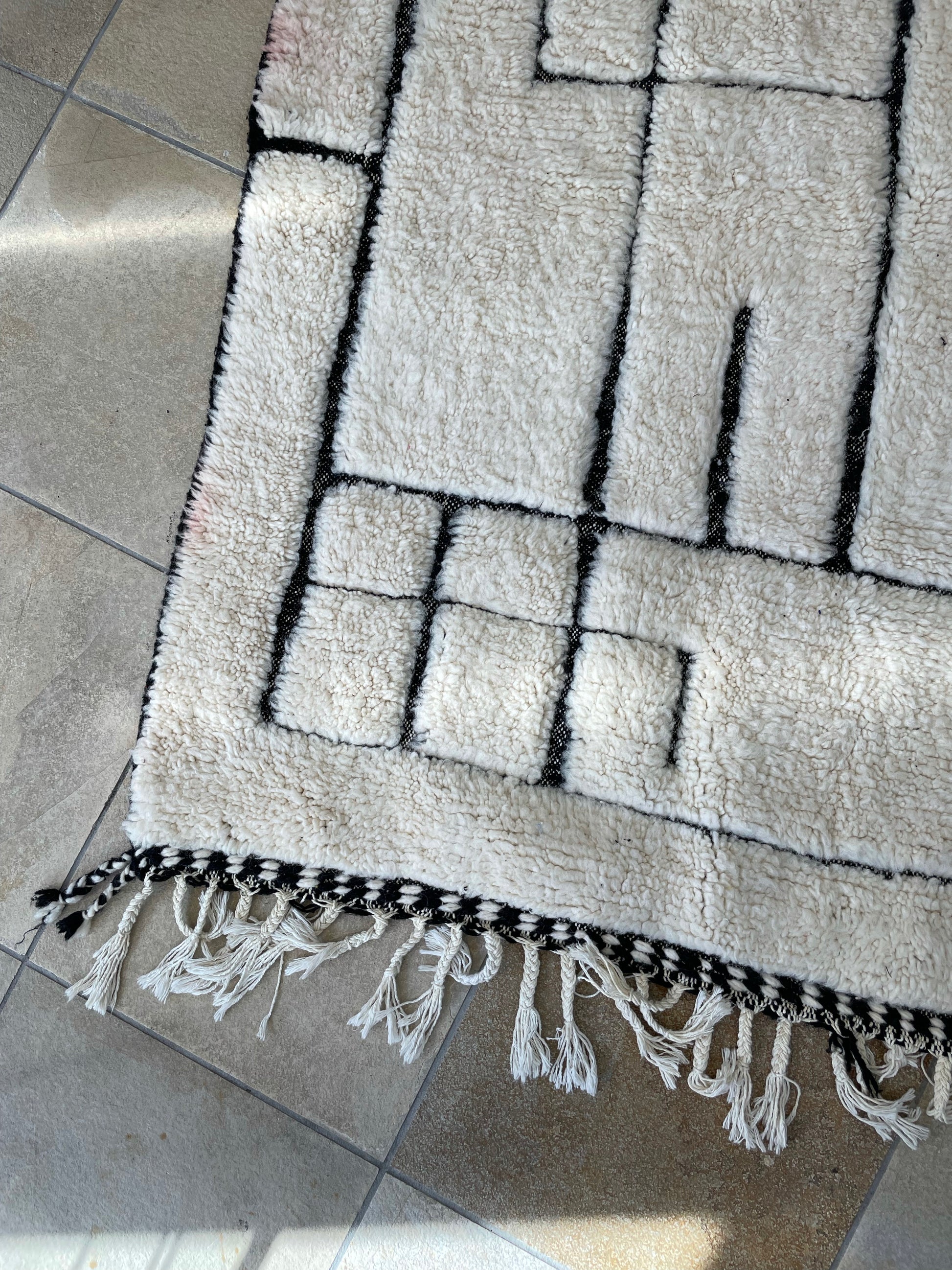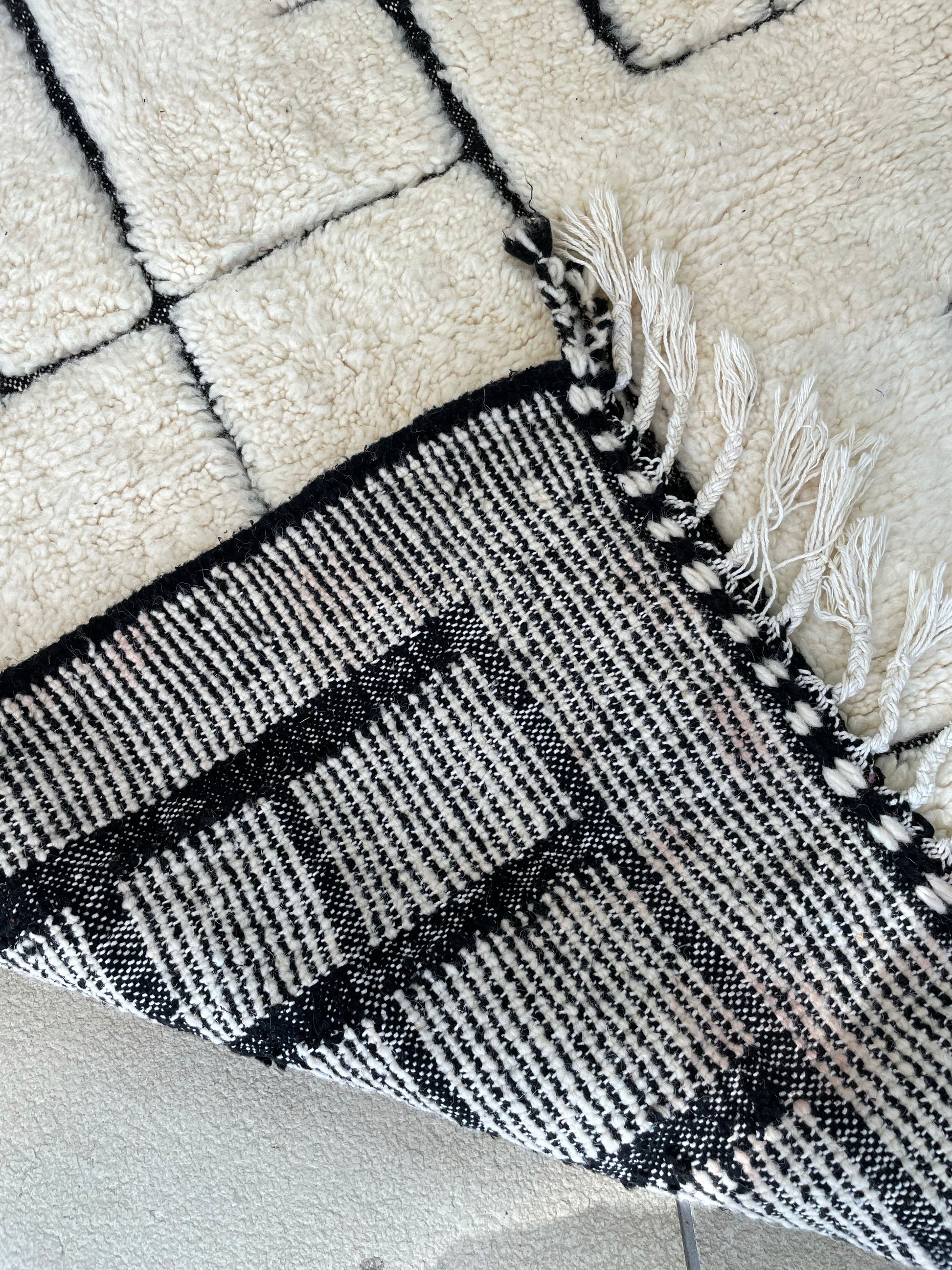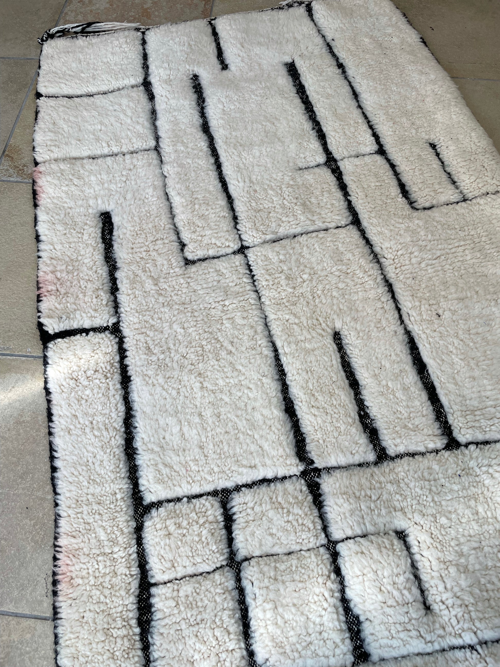 ベニワレンはモロッコのアトラス山脈に住むベルベル人女性によって、一目一目しっかりと結びながら織らているハンドメイドのウールラグです。白を基調とし黒の細いラインで模様が描かれています。触り心地はふわふわと柔らかく長い毛足が特徴です。白を基調としたシンプルなデザインとナチュラルな色合いは、コーディネートの幅も広く他のインテリアとも調和しやすいです。