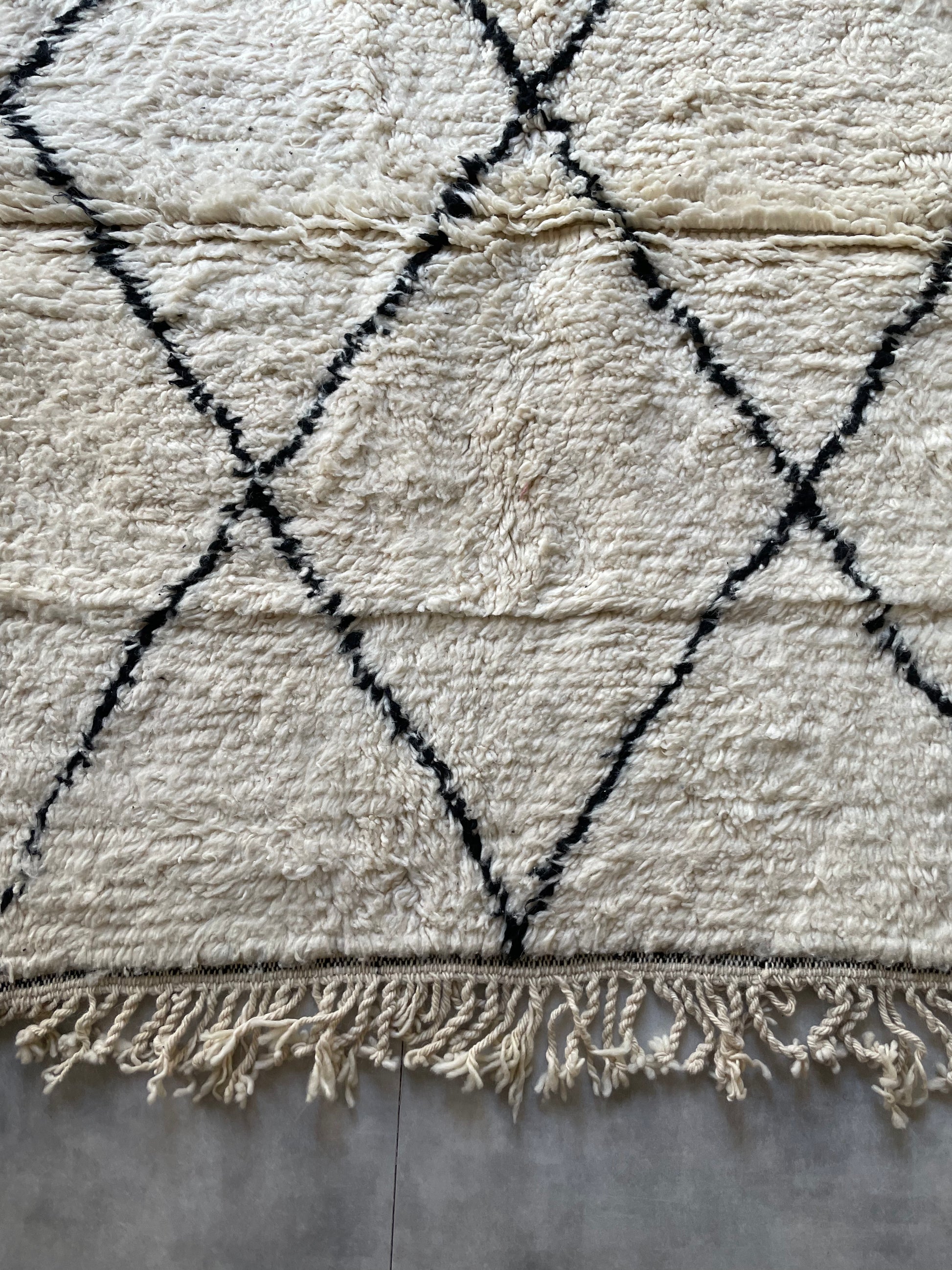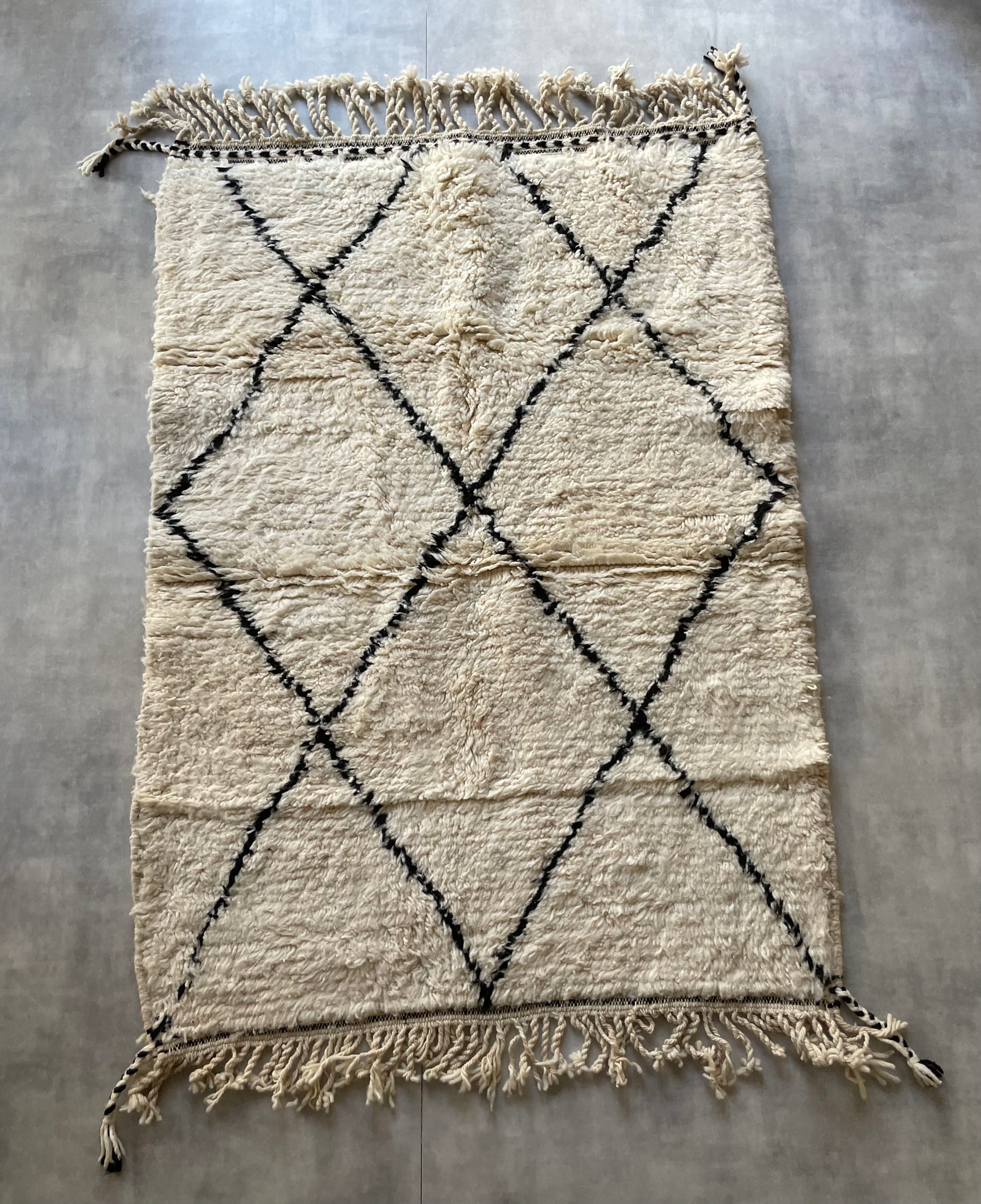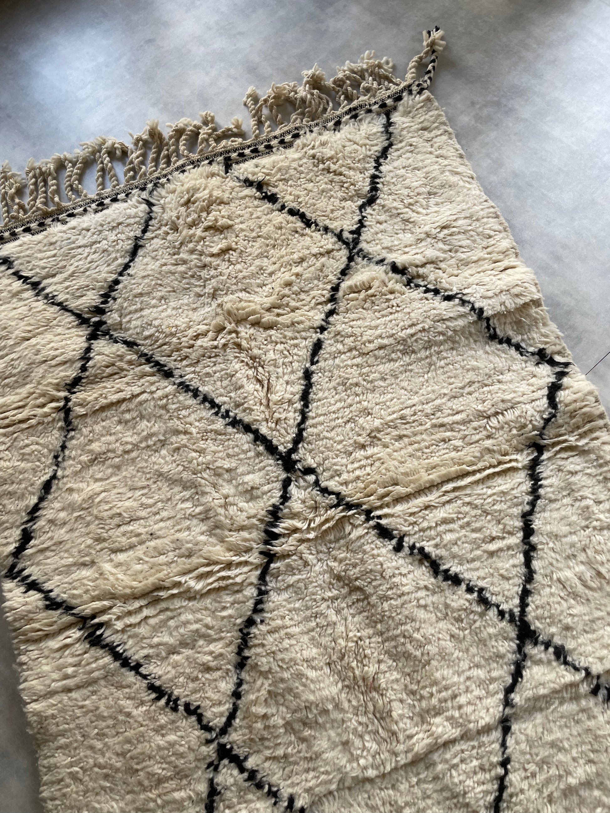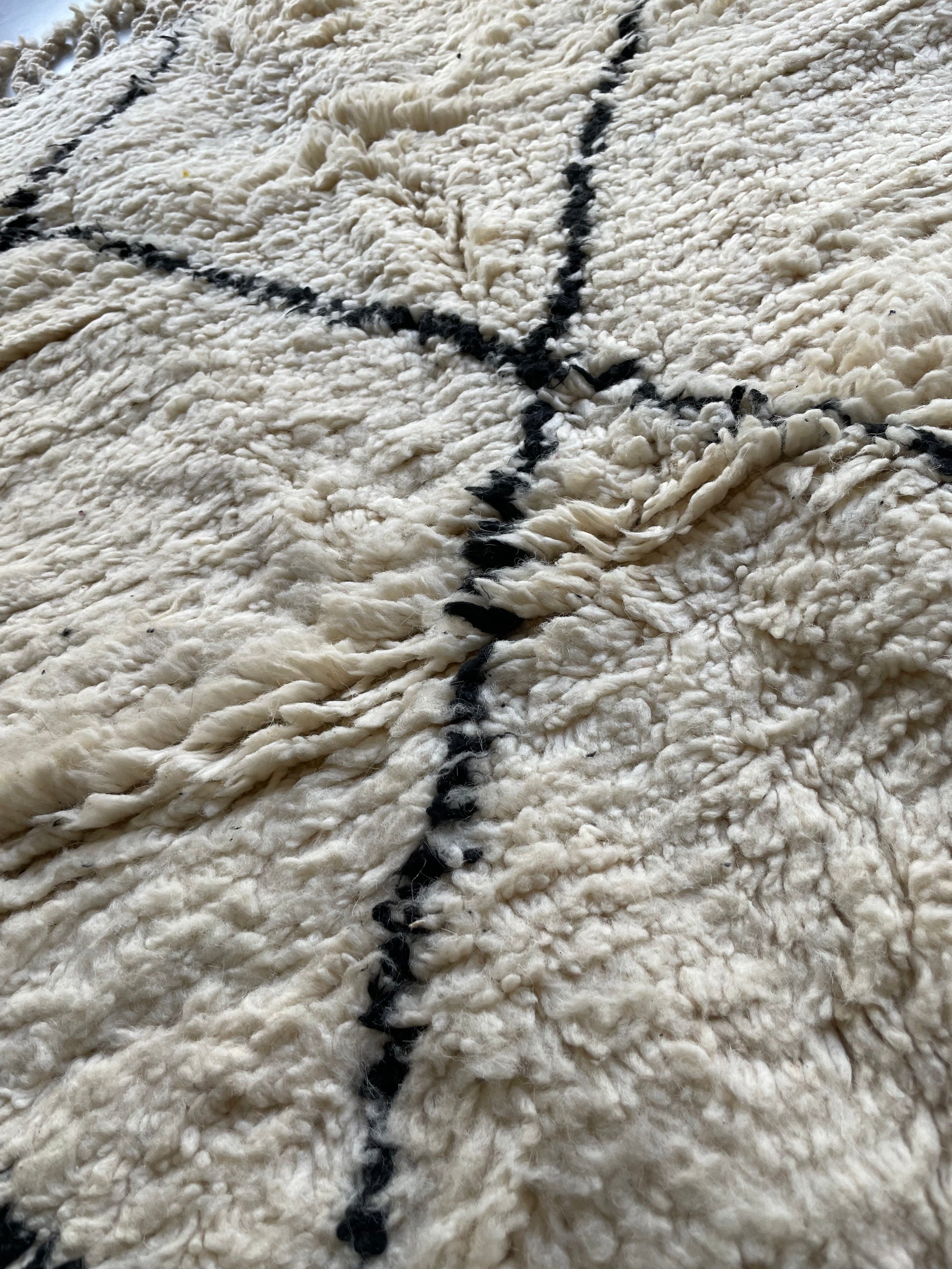 ベニワレンはモロッコのアトラス山脈に住むベルベル人女性によって、一目一目しっかりと結びながら織らているハンドメイドのウールラグです。白を基調とし黒の細いラインで模様が描かれています。触り心地はふわふわと柔らかく長い毛足が特徴です。白を基調としたシンプルなデザインとナチュラルな色合いは、コーディネートの幅も広く他のインテリアとも調和しやすいです。