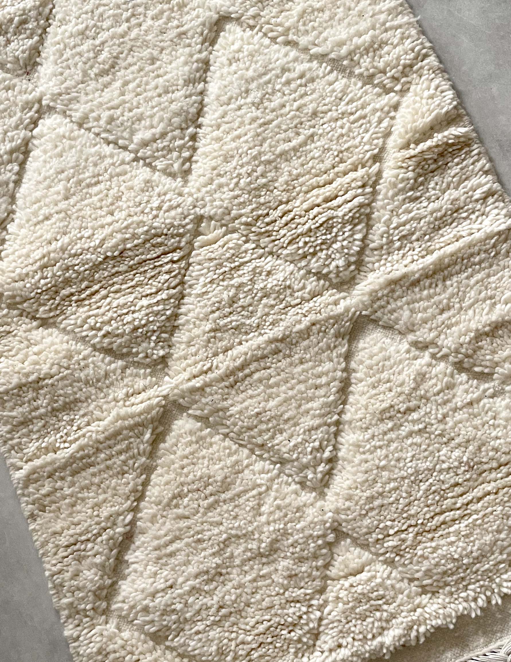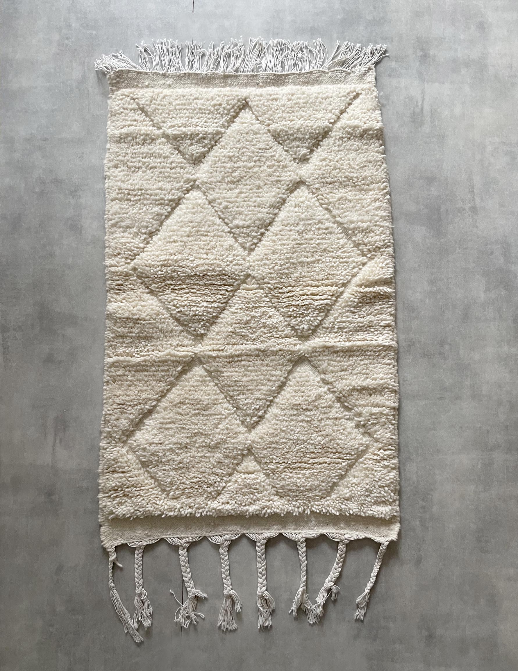 ベニワレンはモロッコのアトラス山脈に住むベルベル人女性によって、一目一目しっかりと結びながら織らているハンドメイドのウールラグです。白を基調とし黒の細いラインで模様が描かれています。触り心地はふわふわと柔らかく長い毛足が特徴です。白を基調としたシンプルなデザインとナチュラルな色合いは、コーディネートの幅も広く他のインテリアとも調和しやすいです。