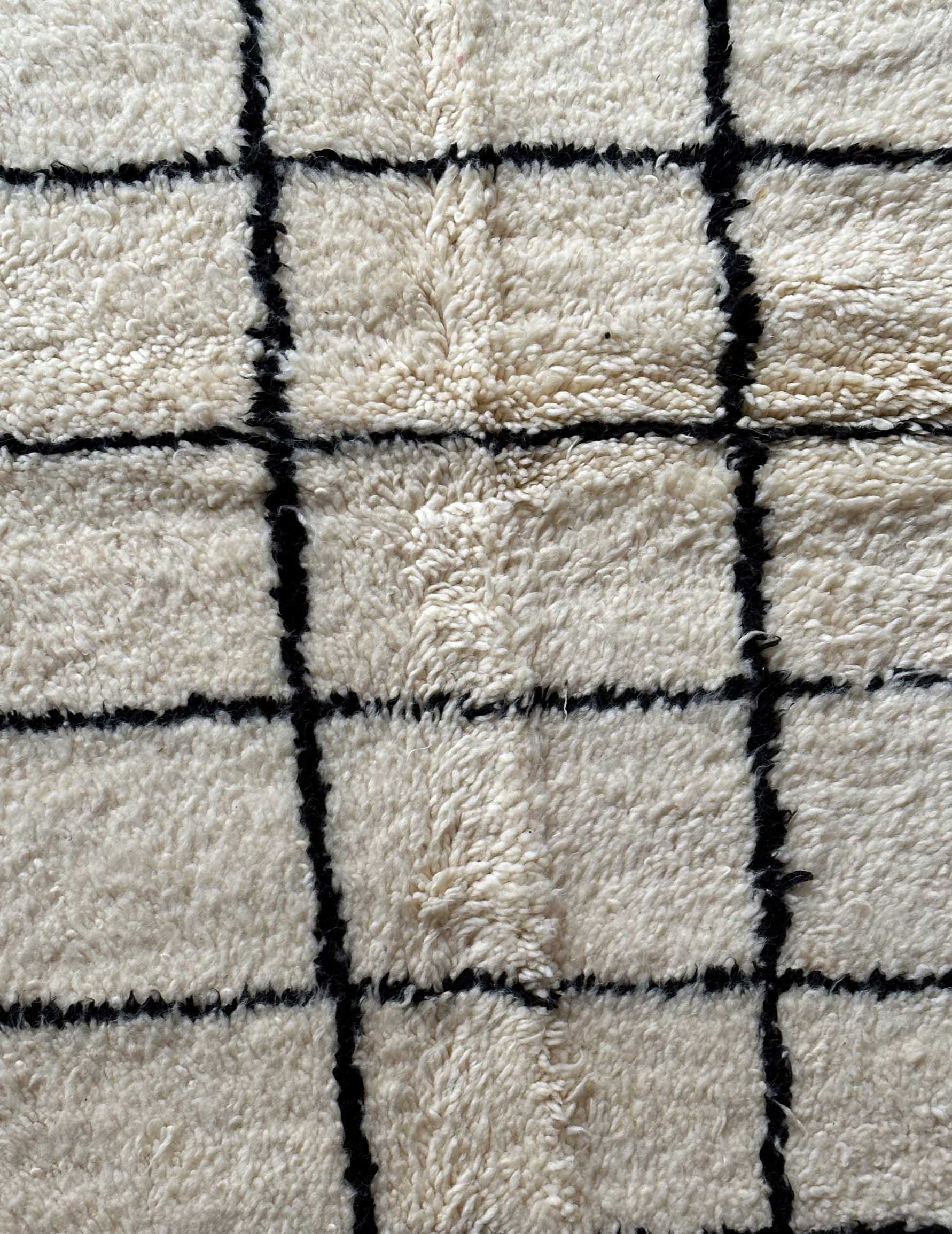 ベニワレンはモロッコのアトラス山脈に住むベルベル人女性によって、一目一目しっかりと結びながら織らているハンドメイドのウールラグです。白を基調とし黒の細いラインで模様が描かれています。触り心地はふわふわと柔らかく長い毛足が特徴です。白を基調としたシンプルなデザインとナチュラルな色合いは、コーディネートの幅も広く他のインテリアとも調和しやすいです。