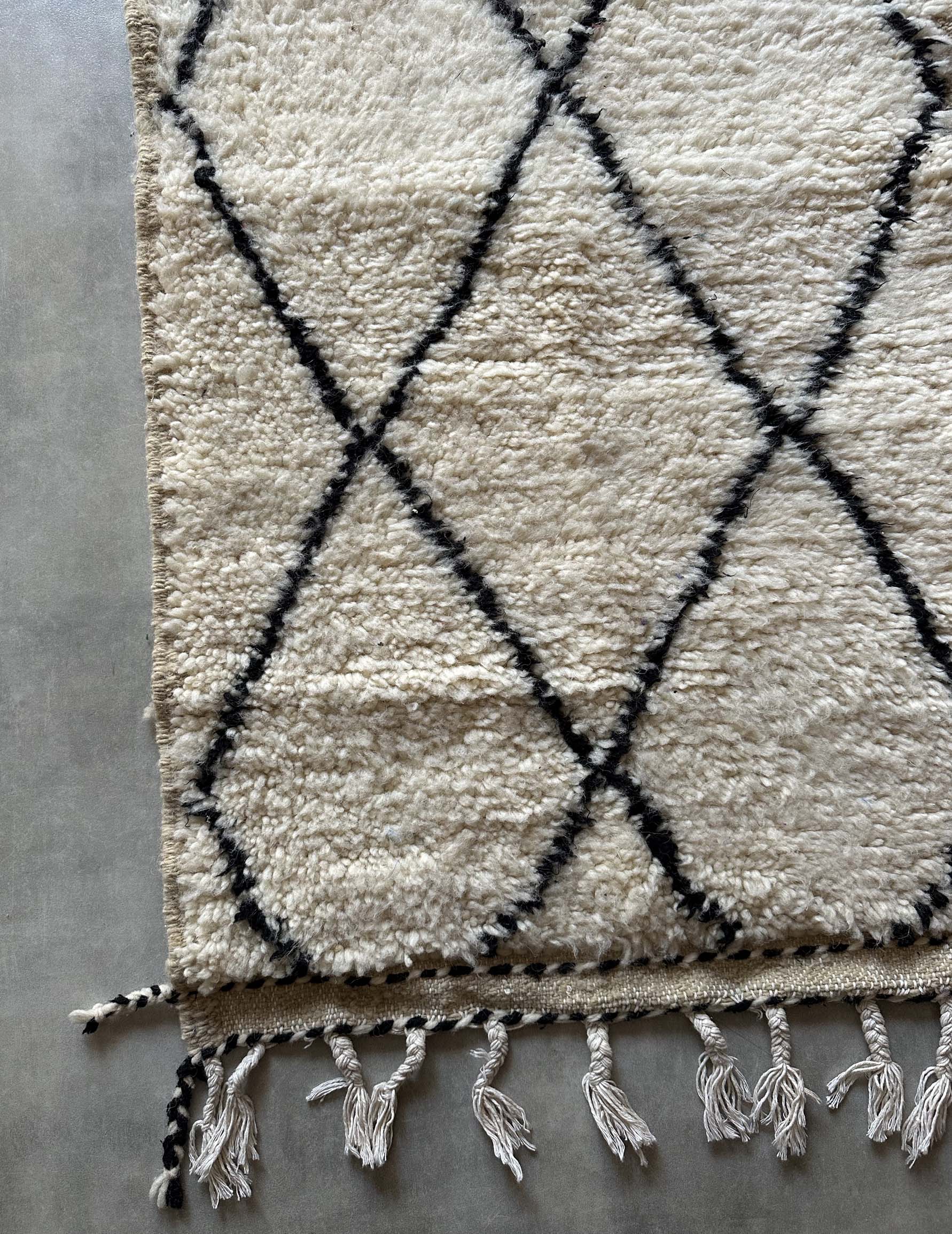 ベニワレンはモロッコのアトラス山脈に住むベルベル人女性によって、一目一目しっかりと結びながら織らているハンドメイドのウールラグです。白を基調とし黒の細いラインで模様が描かれています。触り心地はふわふわと柔らかく長い毛足が特徴です。白を基調としたシンプルなデザインとナチュラルな色合いは、コーディネートの幅も広く他のインテリアとも調和しやすいです。