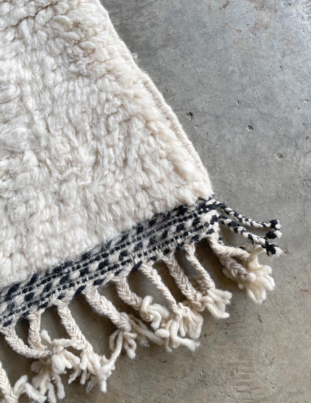 ベニワレンはモロッコのアトラス山脈に住むベルベル人女性によって、一目一目しっかりと結びながら織らているハンドメイドのウールラグです。白を基調とし黒の細いラインで模様が描かれています。触り心地はふわふわと柔らかく長い毛足が特徴です。白を基調としたシンプルなデザインとナチュラルな色合いは、コーディネートの幅も広く他のインテリアとも調和しやすいです。
