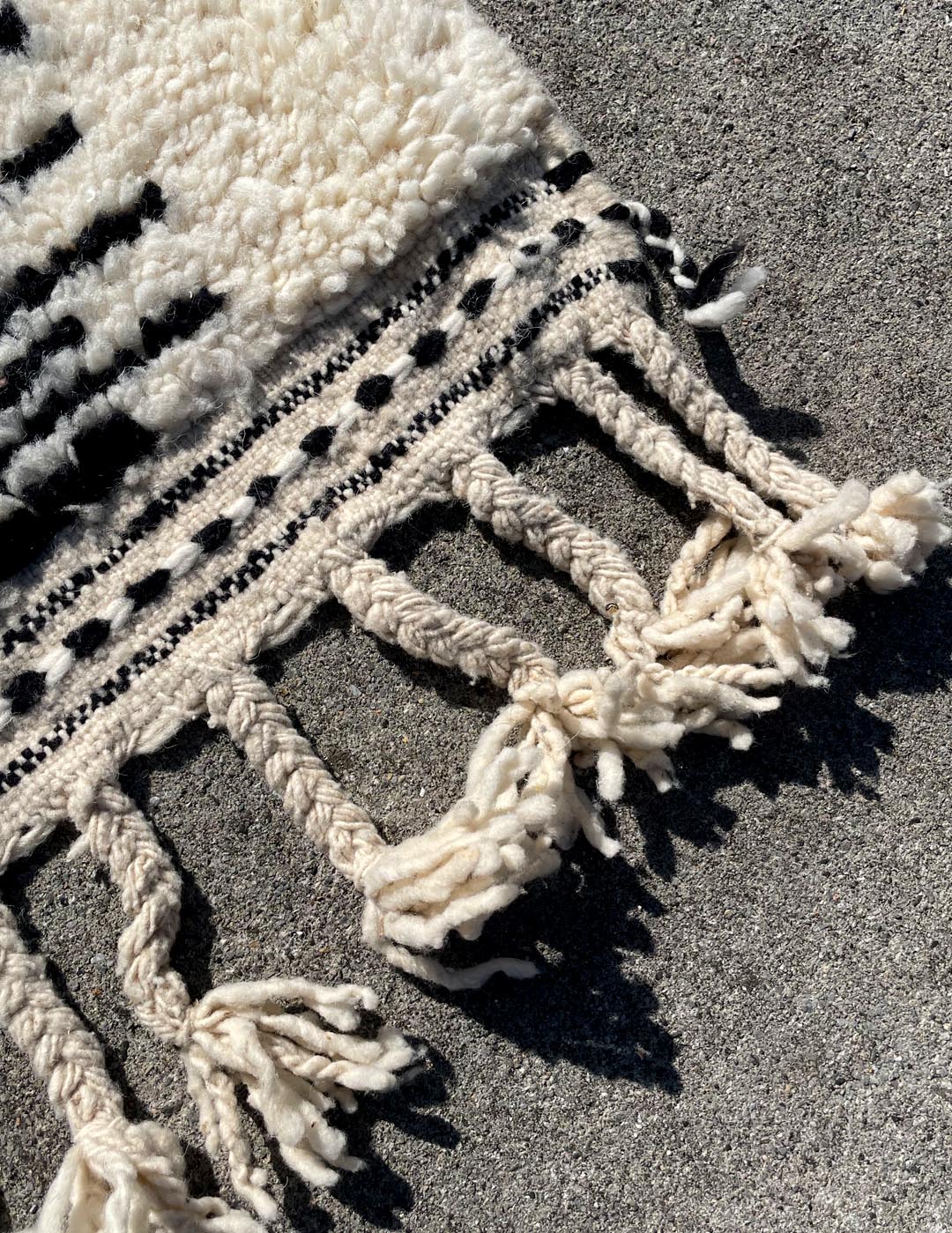 ベニワレンはモロッコのアトラス山脈に住むベルベル人女性によって、一目一目しっかりと結びながら織らているハンドメイドのウールラグです。白を基調とし黒の細いラインで模様が描かれています。触り心地はふわふわと柔らかく長い毛足が特徴です。白を基調としたシンプルなデザインとナチュラルな色合いは、コーディネートの幅も広く他のインテリアとも調和しやすいです。