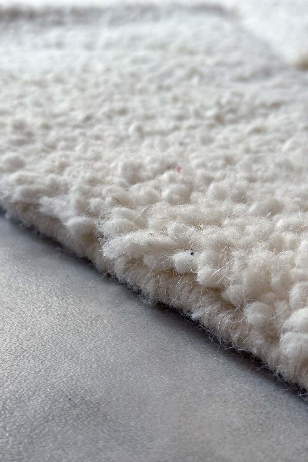ベニワレンはモロッコのアトラス山脈に住むベルベル人女性によって、一目一目しっかりと結びながら織らているハンドメイドのウールラグです。白を基調とし黒の細いラインで模様が描かれています。触り心地はふわふわと柔らかく長い毛足が特徴です。白を基調としたシンプルなデザインとナチュラルな色合いは、コーディネートの幅も広く他のインテリアとも調和しやすいです。