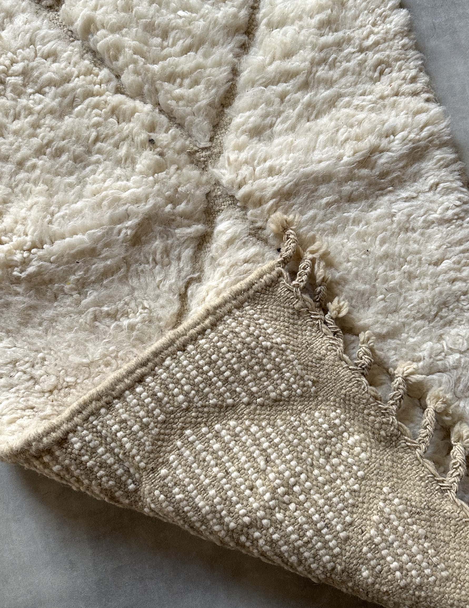 ベニワレンはモロッコのアトラス山脈に住むベルベル人女性によって、一目一目しっかりと結びながら織らているハンドメイドのウールラグです。白を基調とし黒の細いラインで模様が描かれています。触り心地はふわふわと柔らかく長い毛足が特徴です。白を基調としたシンプルなデザインとナチュラルな色合いは、コーディネートの幅も広く他のインテリアとも調和しやすいです。