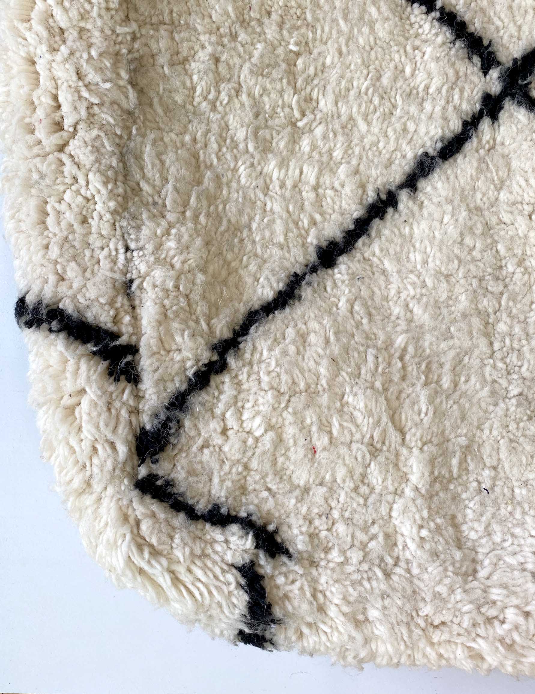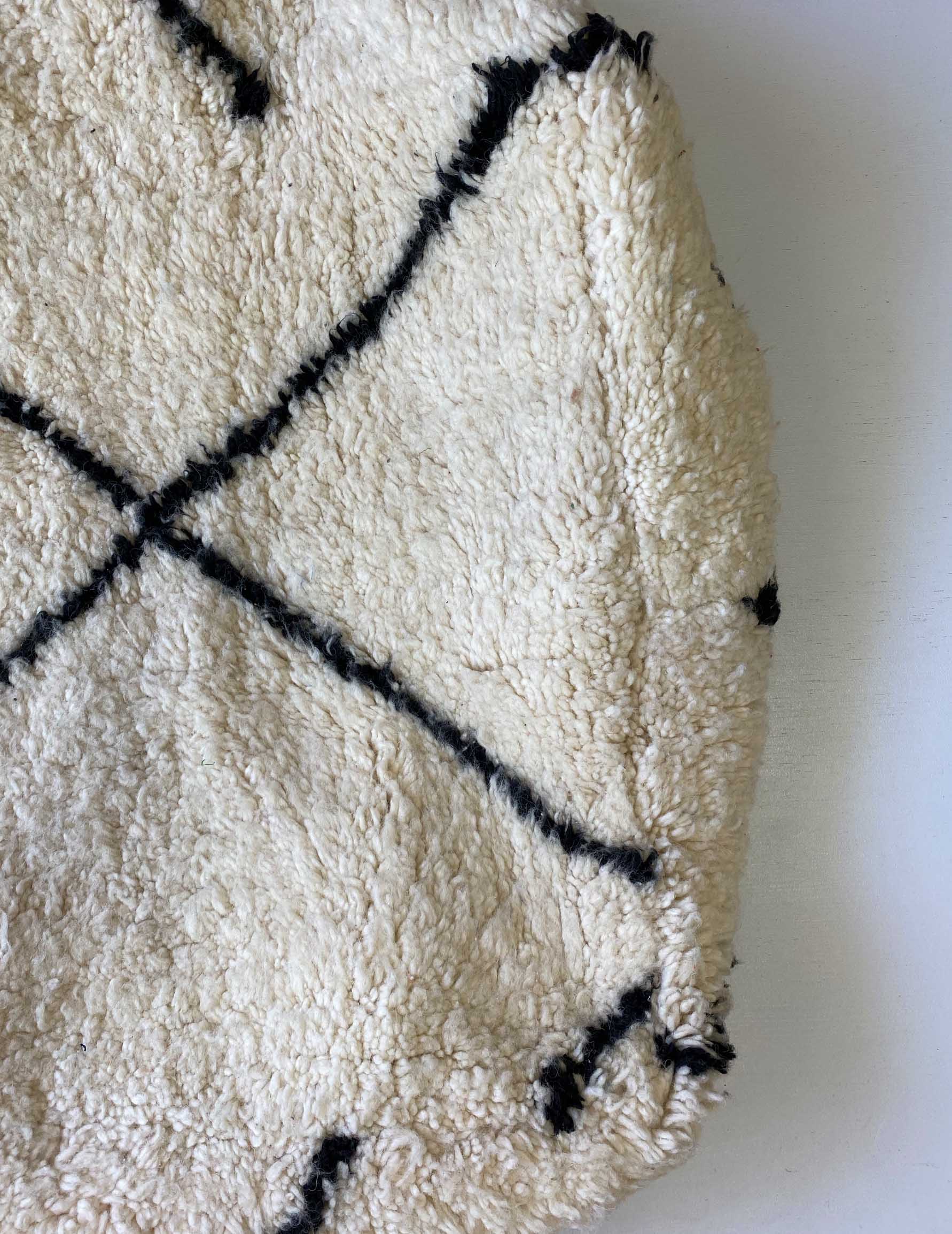 ベニワレンはモロッコのアトラス山脈に住むベルベル人女性によって、一目一目しっかりと結びながら織らているハンドメイドのウールラグです。白を基調とし黒の細いラインで模様が描かれています。触り心地はふわふわと柔らかく長い毛足が特徴です。このラグを使用し作られたプフとなります。