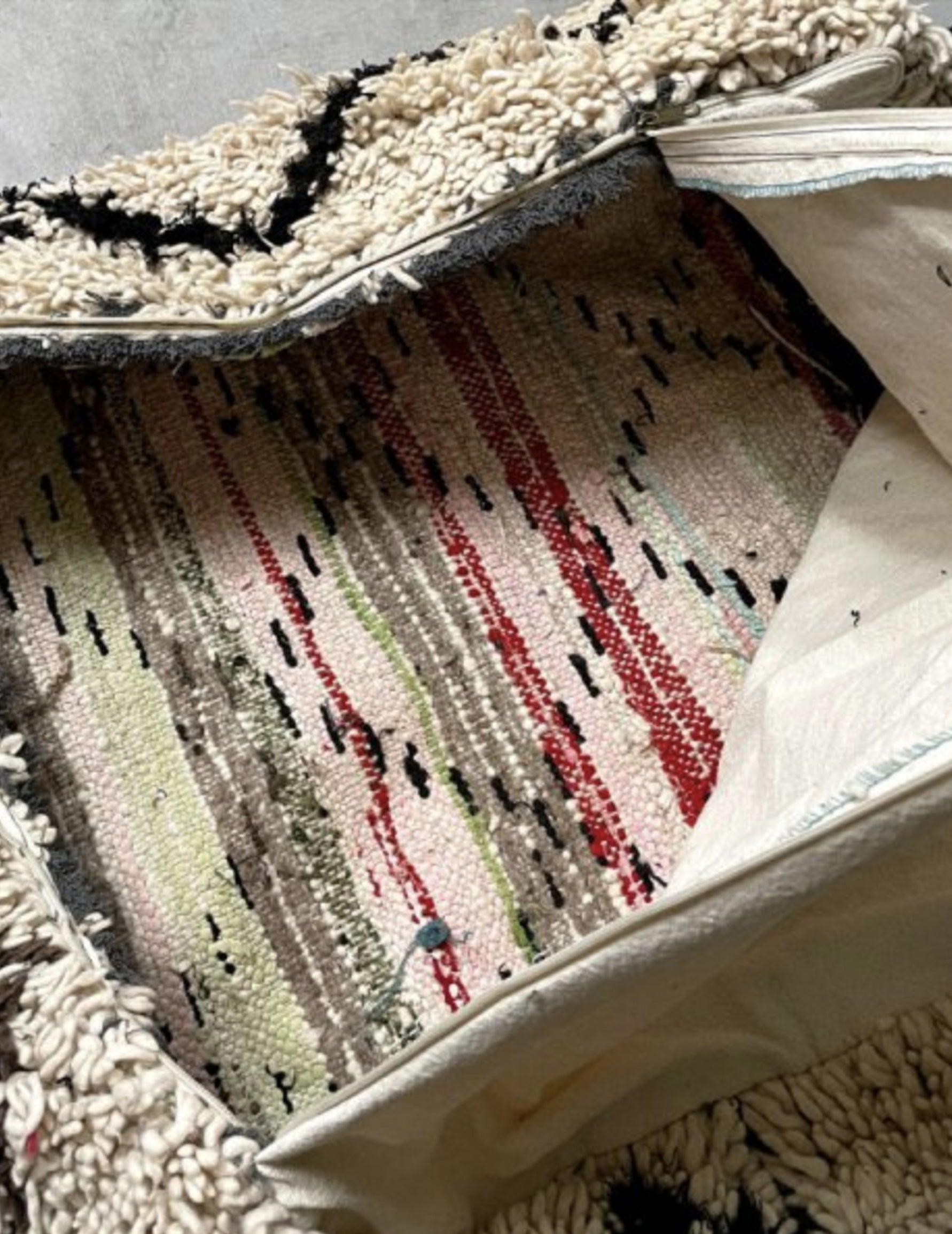 ベニワレンはモロッコのアトラス山脈に住むベルベル人女性によって、一目一目しっかりと結びながら織らているハンドメイドのウールラグです。白を基調とし黒の細いラインで模様が描かれています。触り心地はふわふわと柔らかく長い毛足が特徴です。このラグを使用し作られたプフとなります。