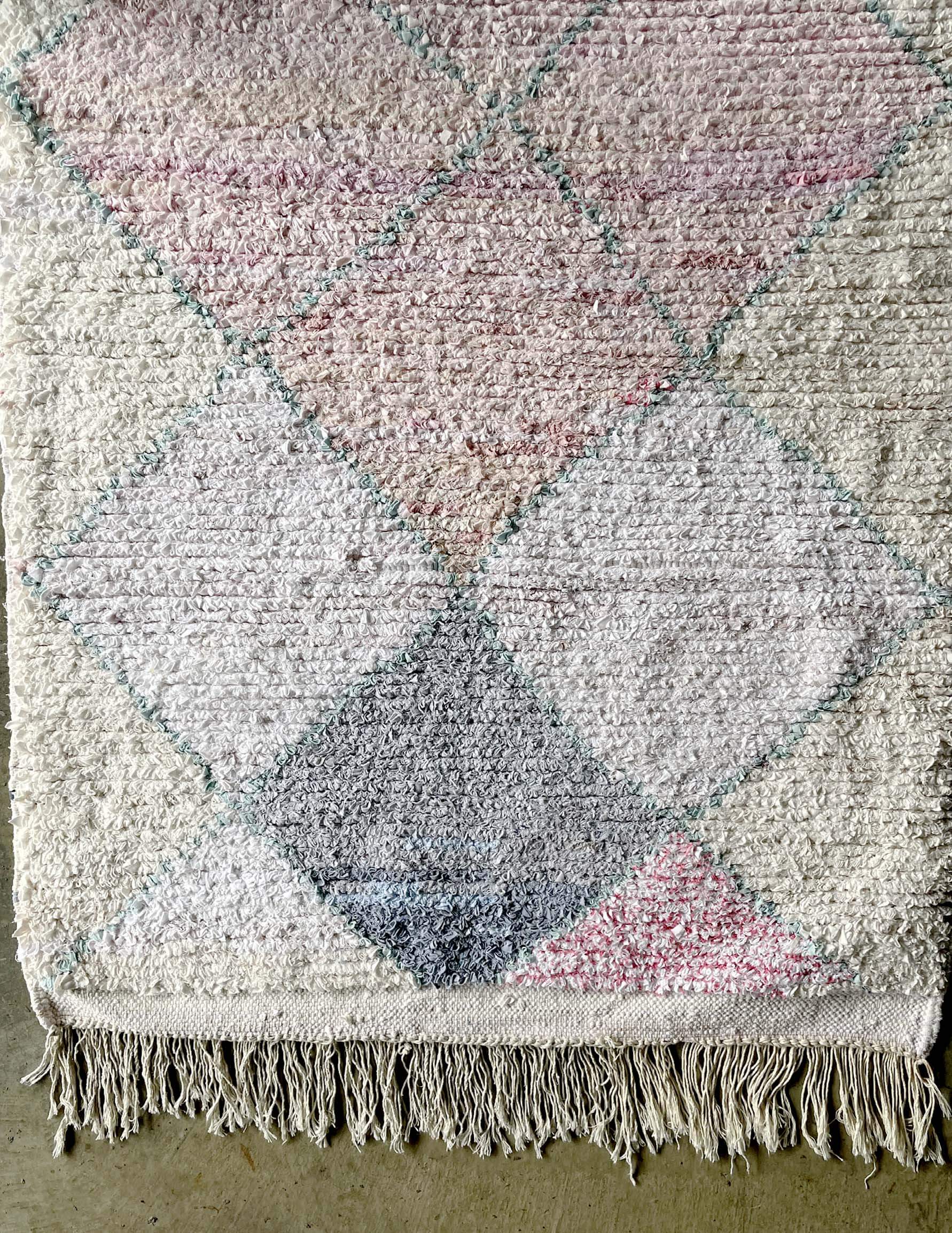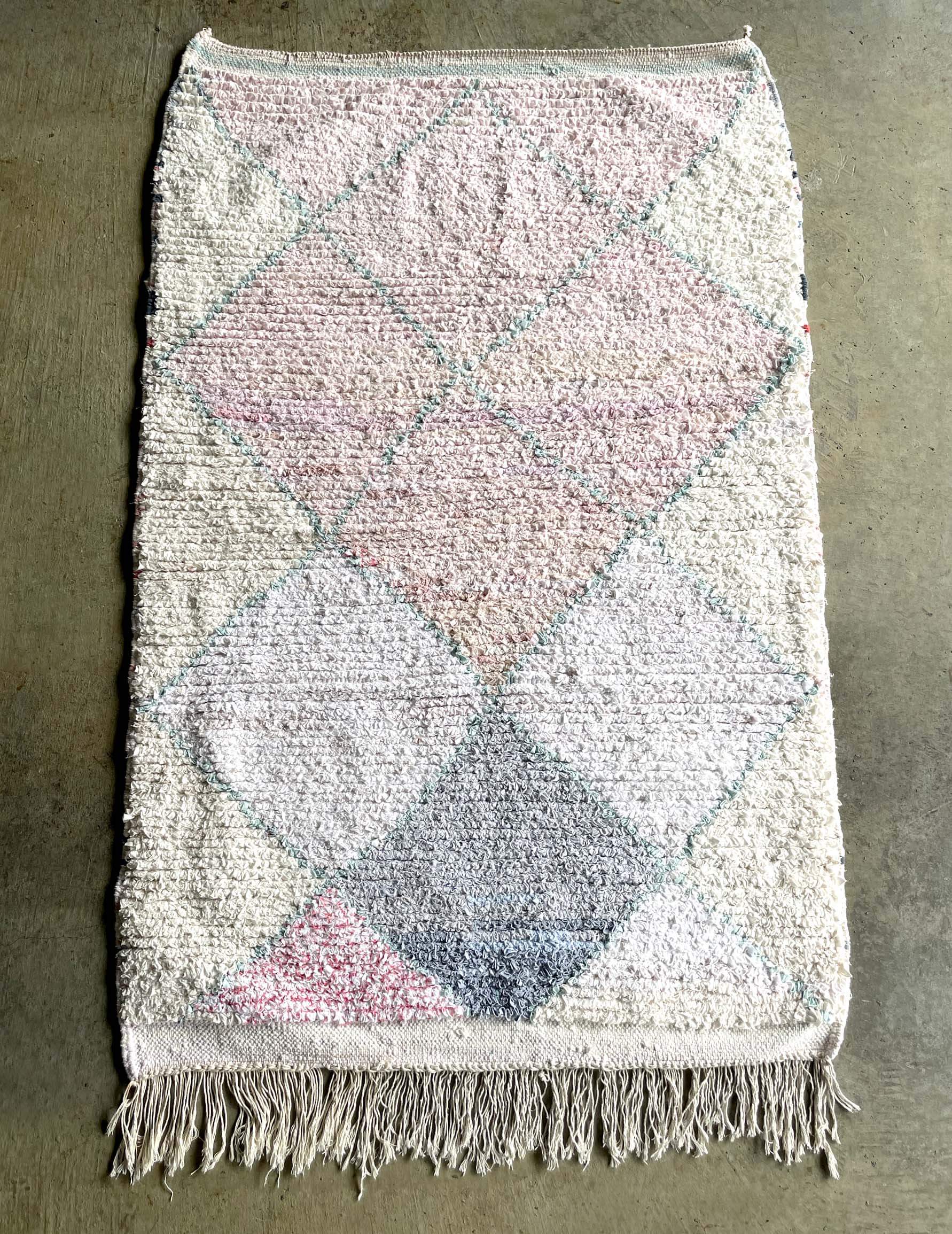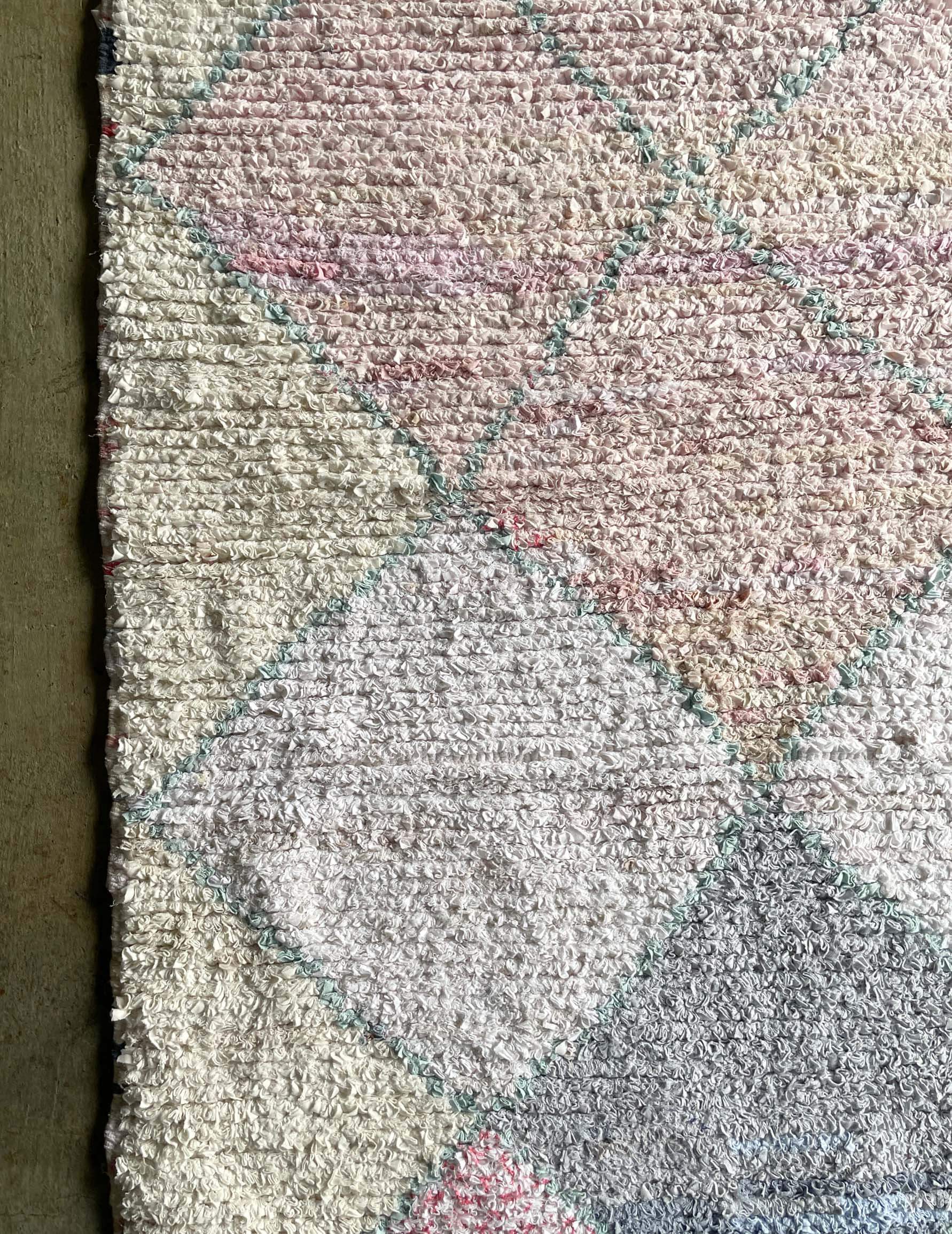 ボシャルウィットはアトラス山脈に住むベルベル人の女性が衣類などの生地を裂いて編み込んだリサイクルモロッカンラグです。全て異なった生地を使用している為、色味の配色や長短が様々で全て1点物となります。またモロッコではラグとして使用されるだけではなく、壁に飾りアートとしても生活に取り入れられています。