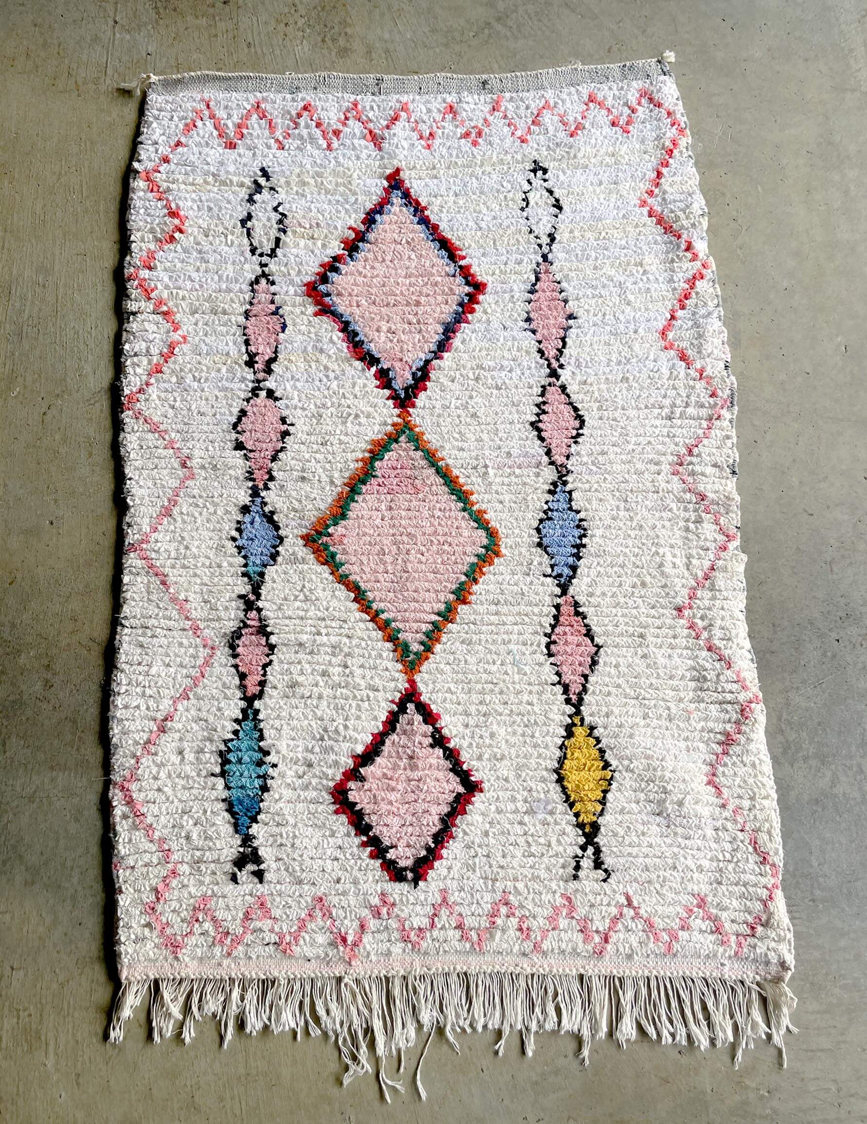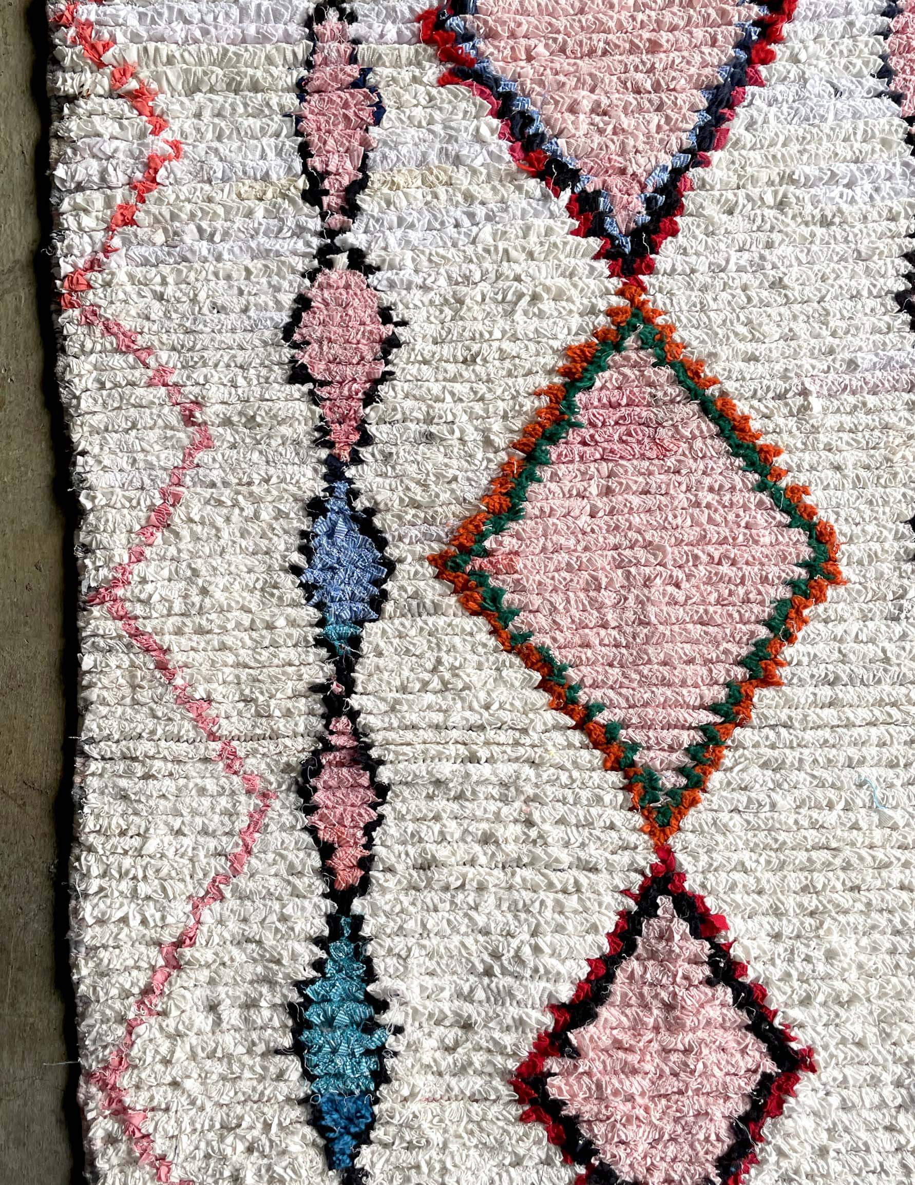 ボシャルウィットはアトラス山脈に住むベルベル人の女性が衣類などの生地を裂いて編み込んだリサイクルモロッカンラグです。全て異なった生地を使用している為、色味の配色や長短が様々で全て1点物となります。またモロッコではラグとして使用されるだけではなく、壁に飾りアートとしても生活に取り入れられています。