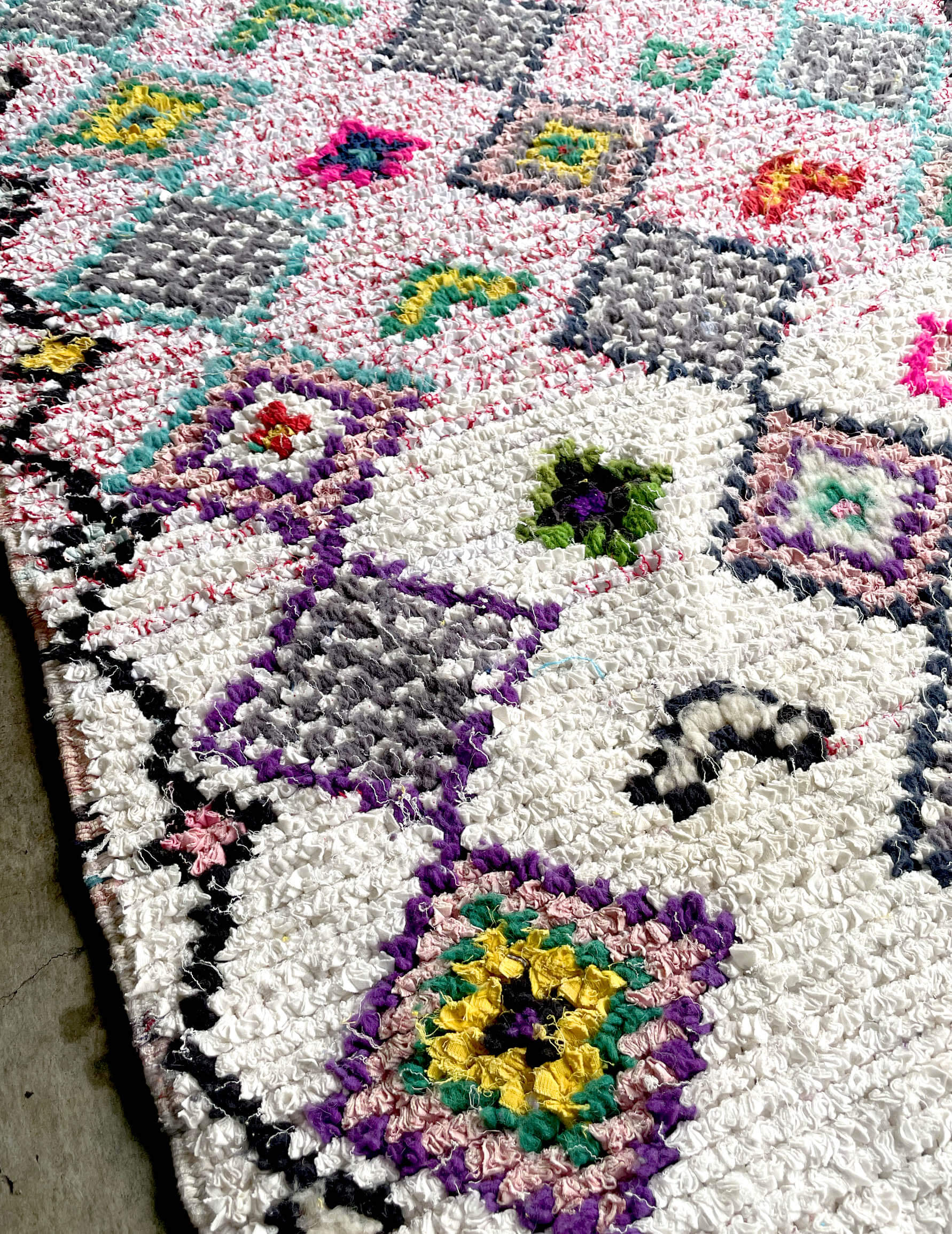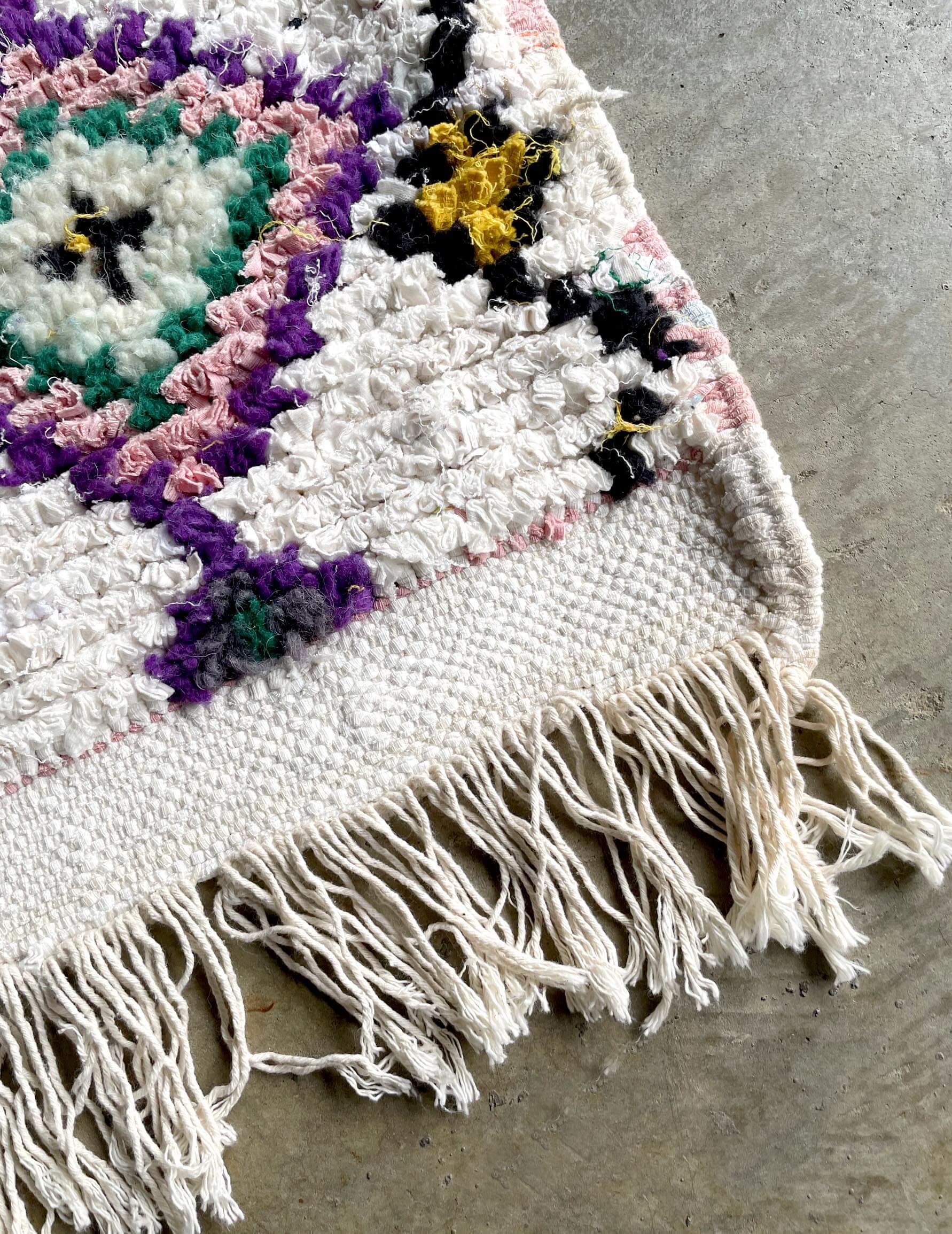 ボシャルウィットはアトラス山脈に住むベルベル人の女性が衣類などの生地を裂いて編み込んだリサイクルモロッカンラグです。全て異なった生地を使用している為、色味の配色や長短が様々で全て1点物となります。またモロッコではラグとして使用されるだけではなく、壁に飾りアートとしても生活に取り入れられています。