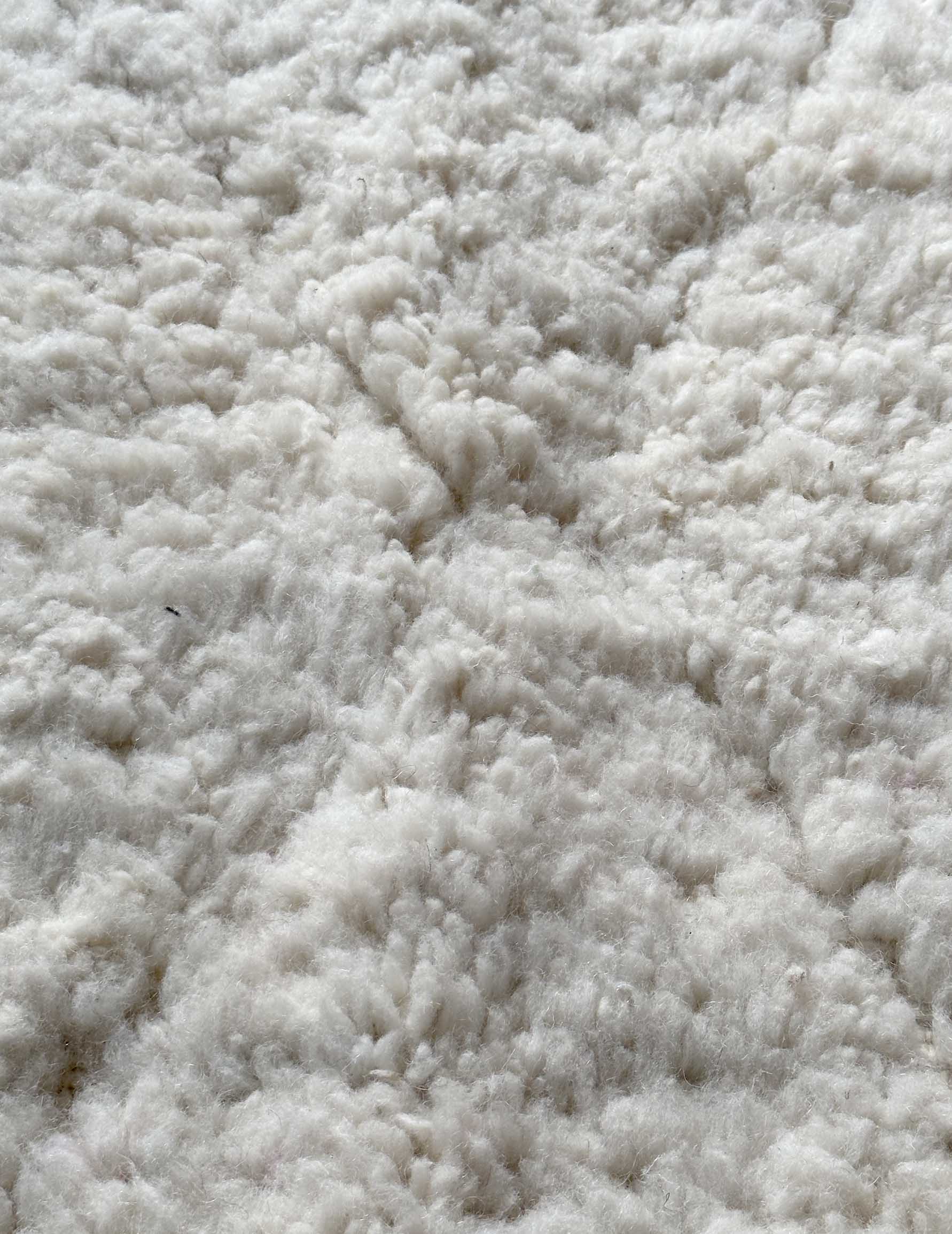 ベニワレンはモロッコのアトラス山脈に住むベルベル人女性によって、一目一目しっかりと結びながら織らているハンドメイドのウールラグ。 ライン部分をフラットに編み 模様を描くタイプのデザインとなっています。 触り心地はふわふわと柔らかく長い毛足が特徴です。白を基調としたシンプルなデザインとナチュラルな色合いは、コーディネートの幅も広く他のインテリアとも調和しやすいです。