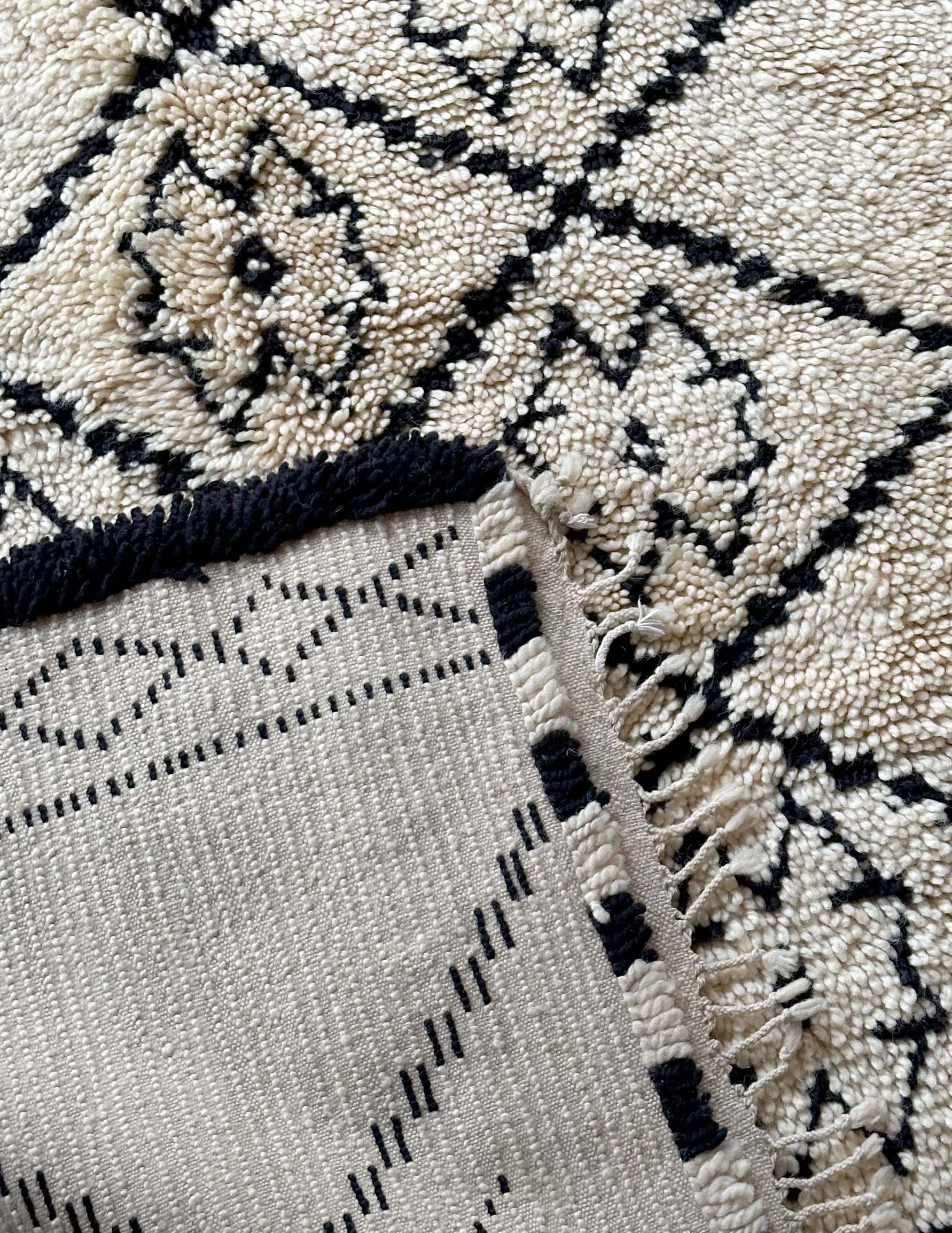 ベニワレンはモロッコのアトラス山脈に住むベルベル人女性によって、一目一目しっかりと結びながら織らているハンドメイドのウールラグです。白を基調とし黒の細いラインで模様が描かれています。触り心地はふわふわと柔らかく長い毛足が特徴です。白を基調としたシンプルなデザインとナチュラルな色合いは、コーディネートの幅も広く他のインテリアとも調和しやすいです。