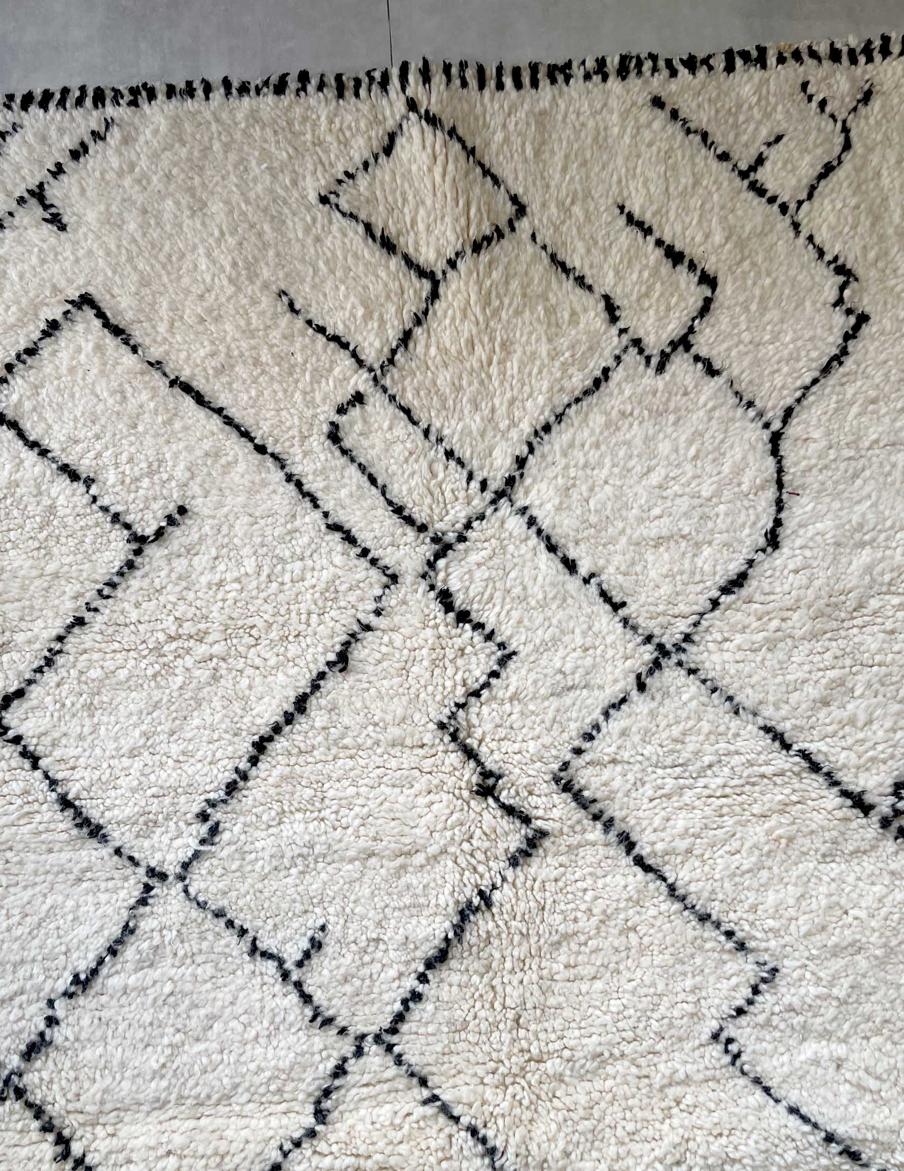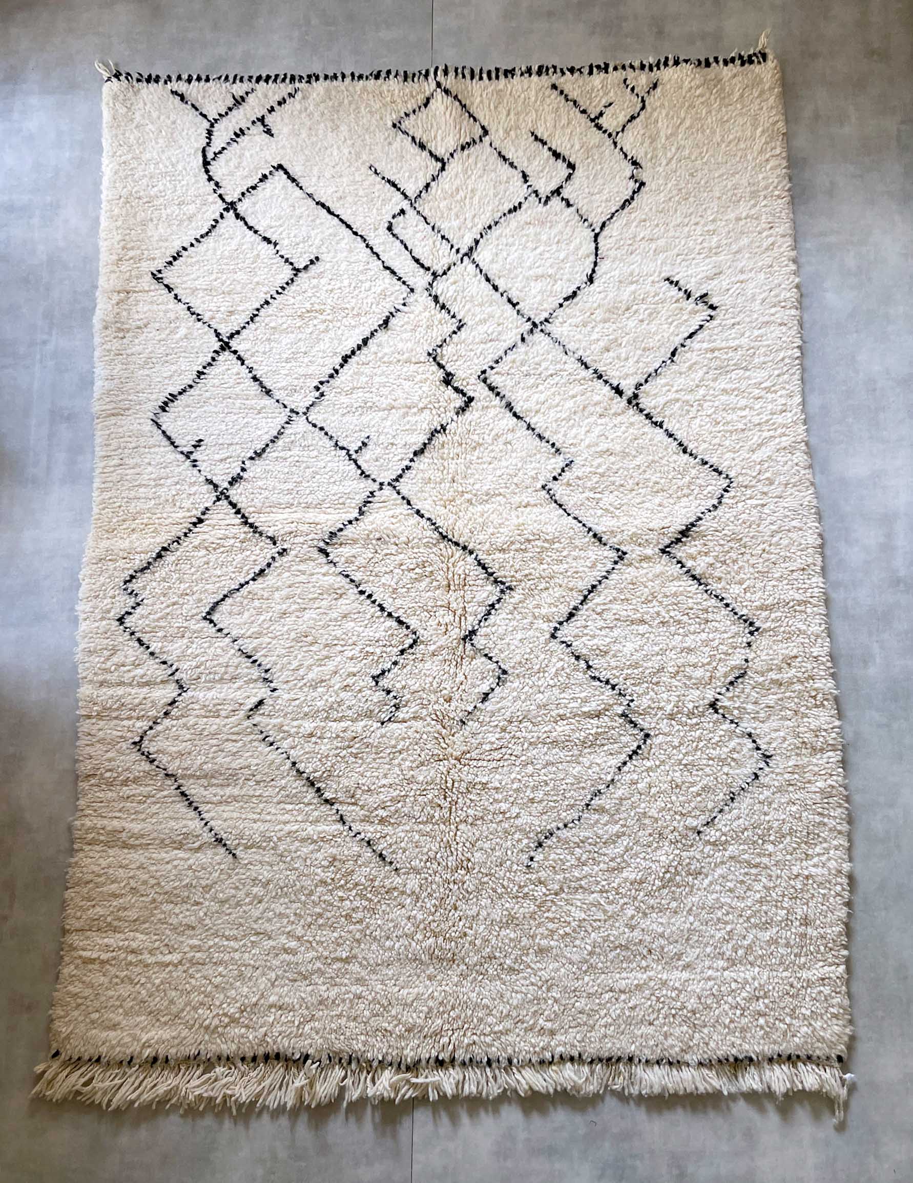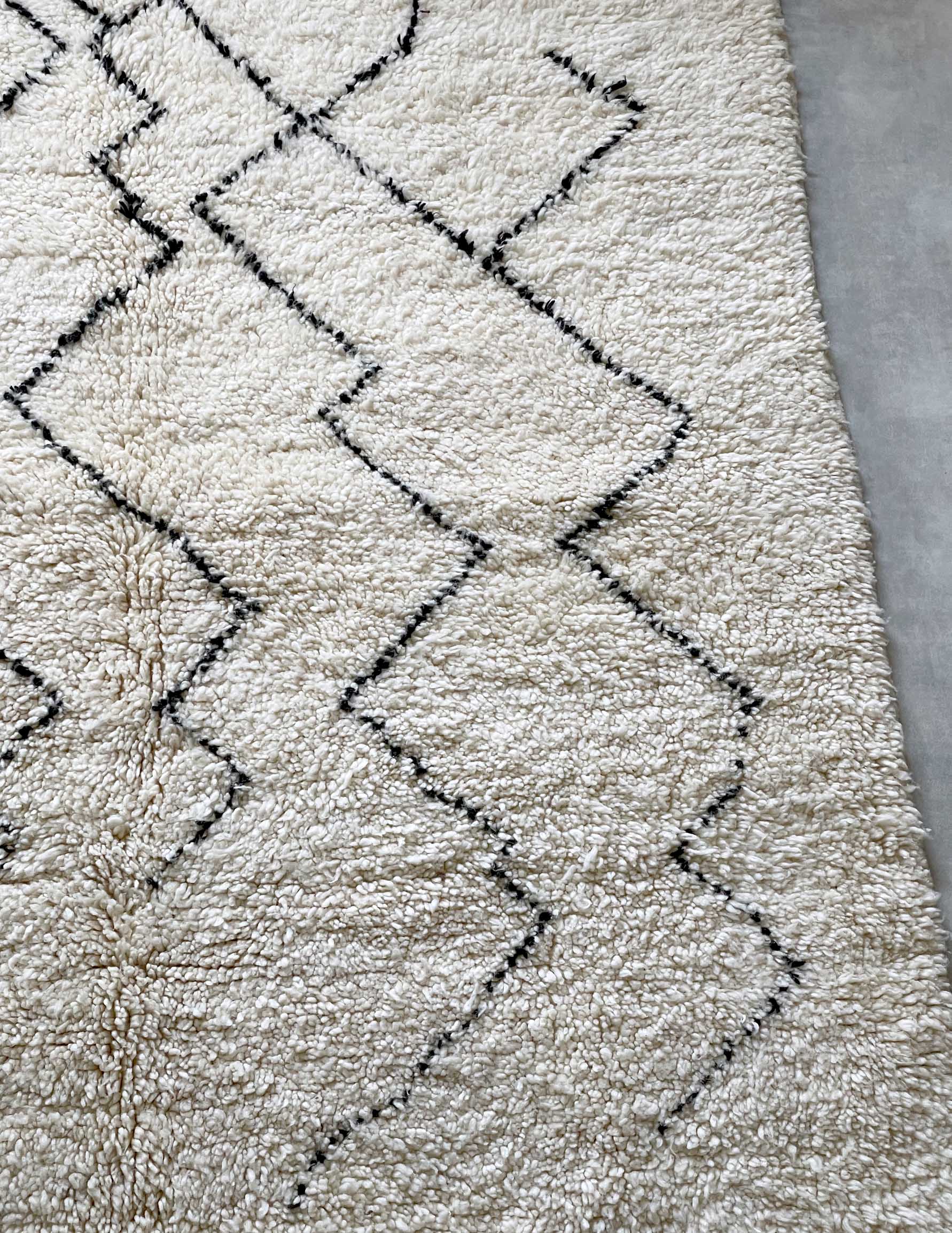 ベニワレンはモロッコのアトラス山脈に住むベルベル人女性によって、一目一目しっかりと結びながら織らているハンドメイドのウールラグです。白を基調とし黒の細いラインで模様が描かれています。触り心地はふわふわと柔らかく長い毛足が特徴です。白を基調としたシンプルなデザインとナチュラルな色合いは、コーディネートの幅も広く他のインテリアとも調和しやすいです。